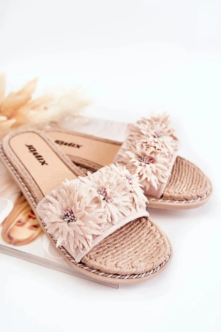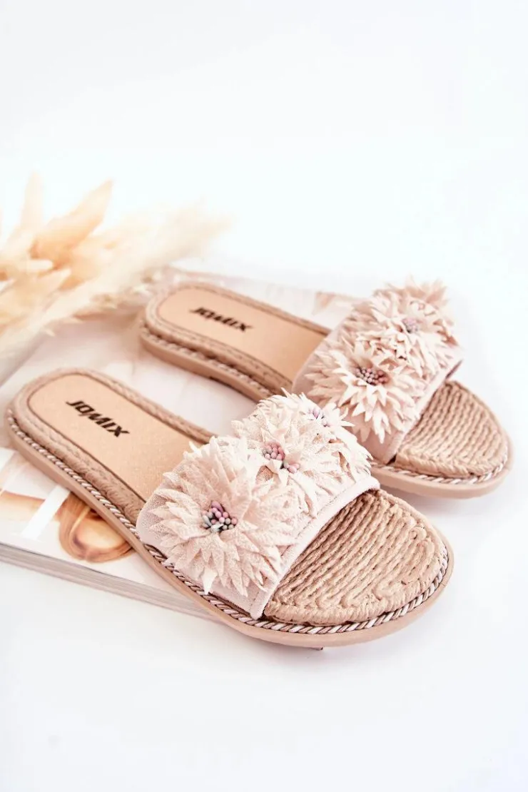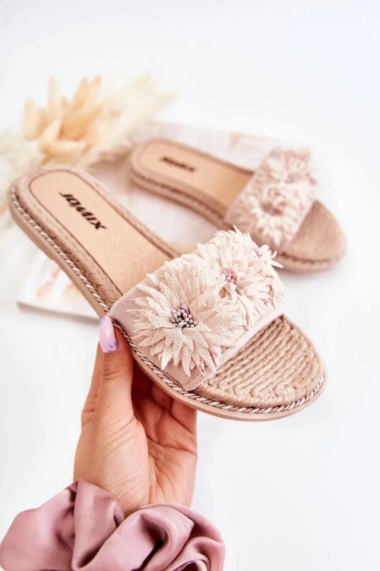 Klasyczne klapki z pięknymi, ozdobnymi kwiatami na przodzie. Wykonane z wierzchu z materiału tekstylnego. Wkładka oraz podeszwa wykonane z gumowego tworzywa. Klapki osadzone na płaskim obcasie, dzięki któremu są bardzo wygodne w użytkowaniu. Modny fason z odkrytym, zaokrąglonym noskiem. Ozdobny sznureczek wokół podeszwy. Przy wyborze rozmiaru prosimy sugerować się tabelą rozmiarów.