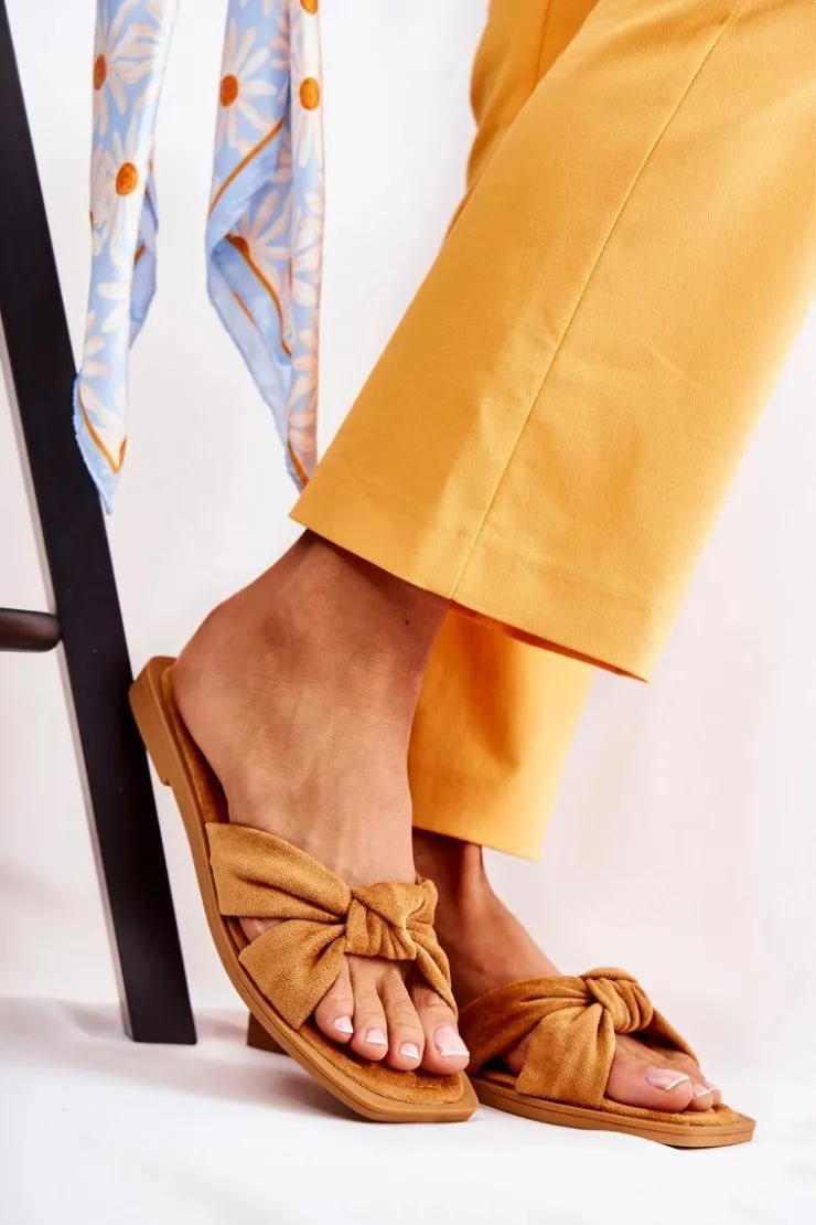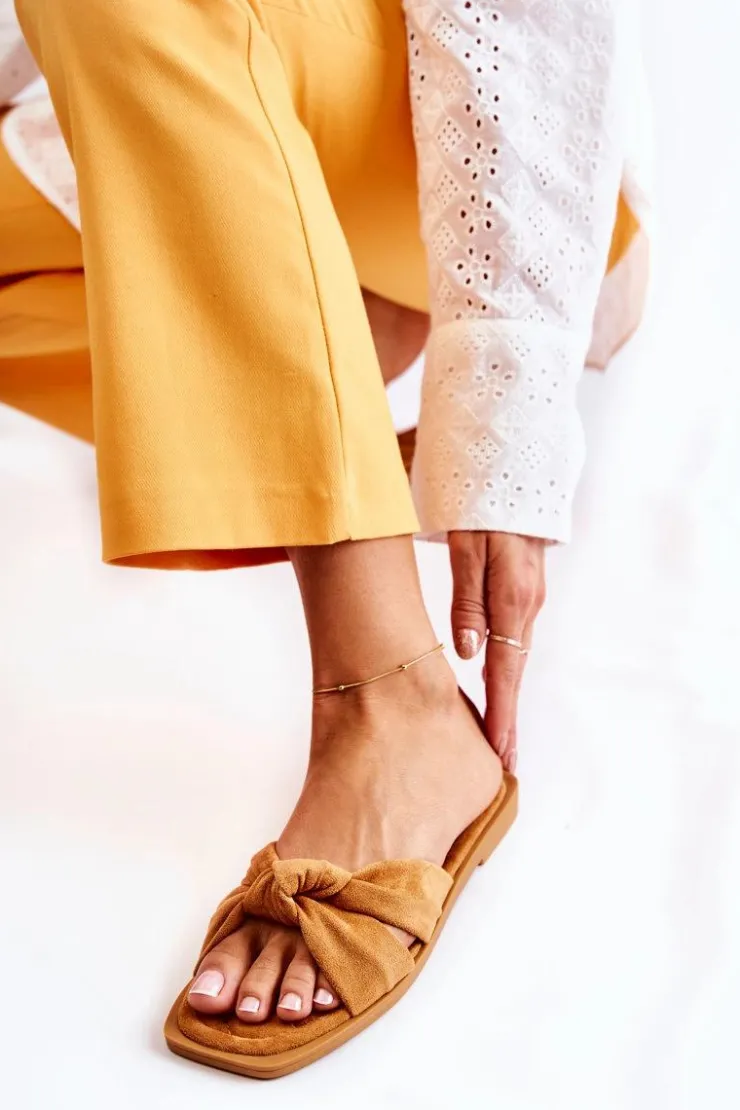 Klasyczne klapki damskie zostały wykonane z miłego w dotyku eko zamszu. Paski klapek łączą się na przodzie tworząc supełek. Wkładka jest pikowana i także wykonana z eko zamszu. Klapki osadzone na płaskim obcasie. Model, który świetnie sprawdzi się podczas codziennych aktywności, np.: podczas zakupów czy spaceru. Klapki te posiadają odkryty, kwadratowy nosek. Przy wyborze rozmiaru prosimy sugerować się tabelą rozmiarów.
