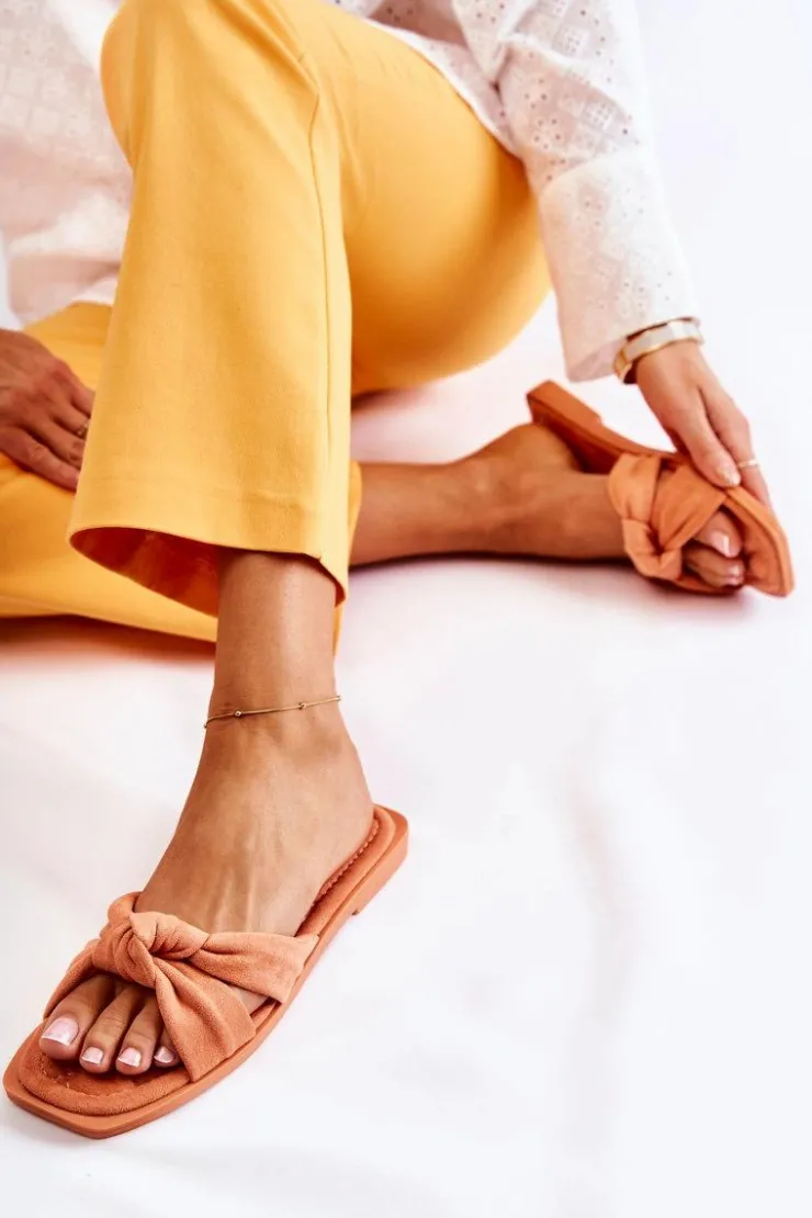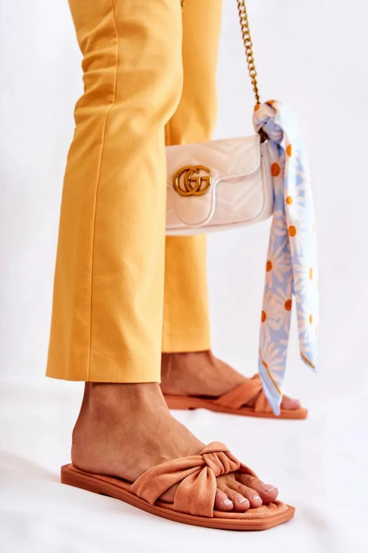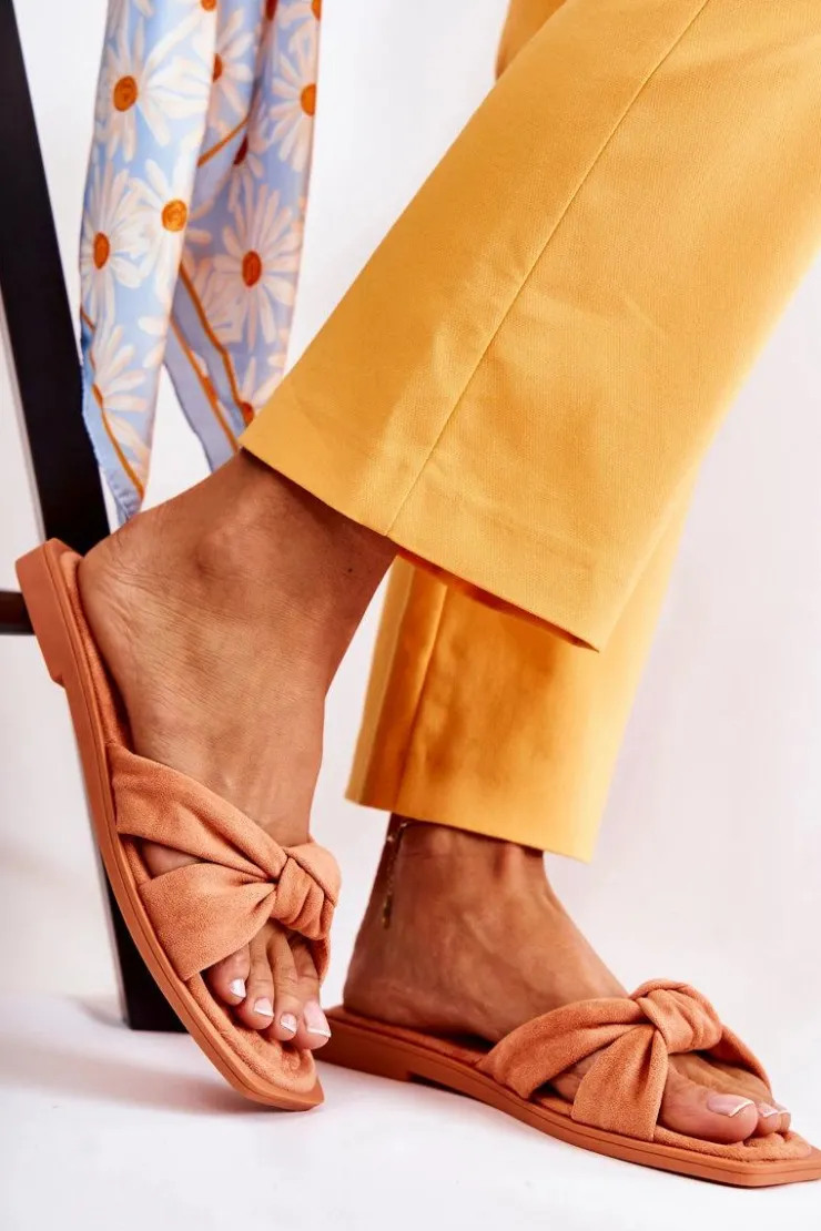 Klasyczne klapki damskie zostały wykonane z miłego w dotyku eko zamszu. Paski klapek łączą się na przodzie tworząc supełek. Wkładka jest pikowana i także wykonana z eko zamszu. Klapki osadzone na płaskim obcasie. Model, który świetnie sprawdzi się podczas codziennych aktywności, np.: podczas zakupów czy spaceru. Klapki te posiadają odkryty, kwadratowy nosek. Przy wyborze rozmiaru prosimy sugerować się tabelą rozmiarów.