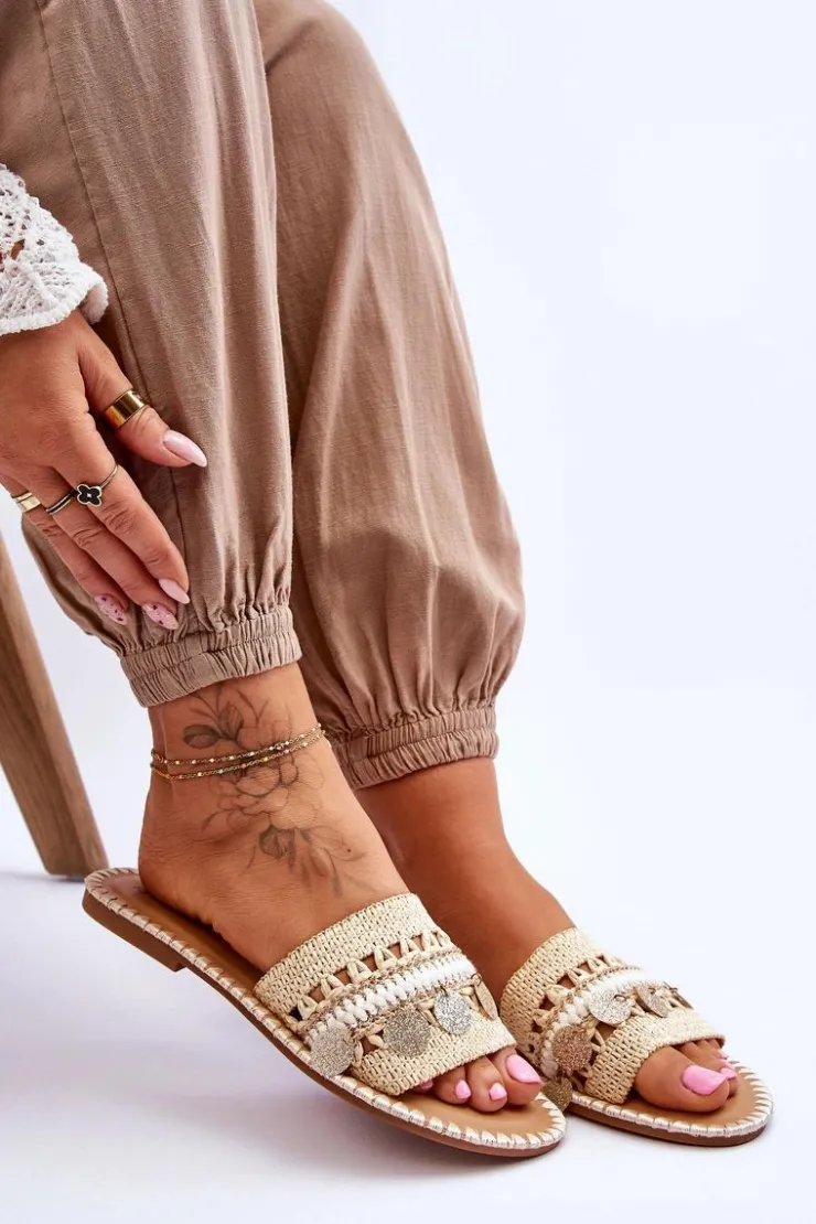 Modne, damskie klapki zostały wykonane z połączenia tworzywa sztucznego oraz materiału. Model ten posiada ozdobne kółeczka oraz lurex, czyli błyszczącą nić. Model klasycznie wsuwany, z płaskim obcasem i antypoślizgową podeszwą. Wkładka z eko skóry została także ozdobiona nicią. Przy wyborze rozmiaru prosimy sugerować się tabelą rozmiarów.