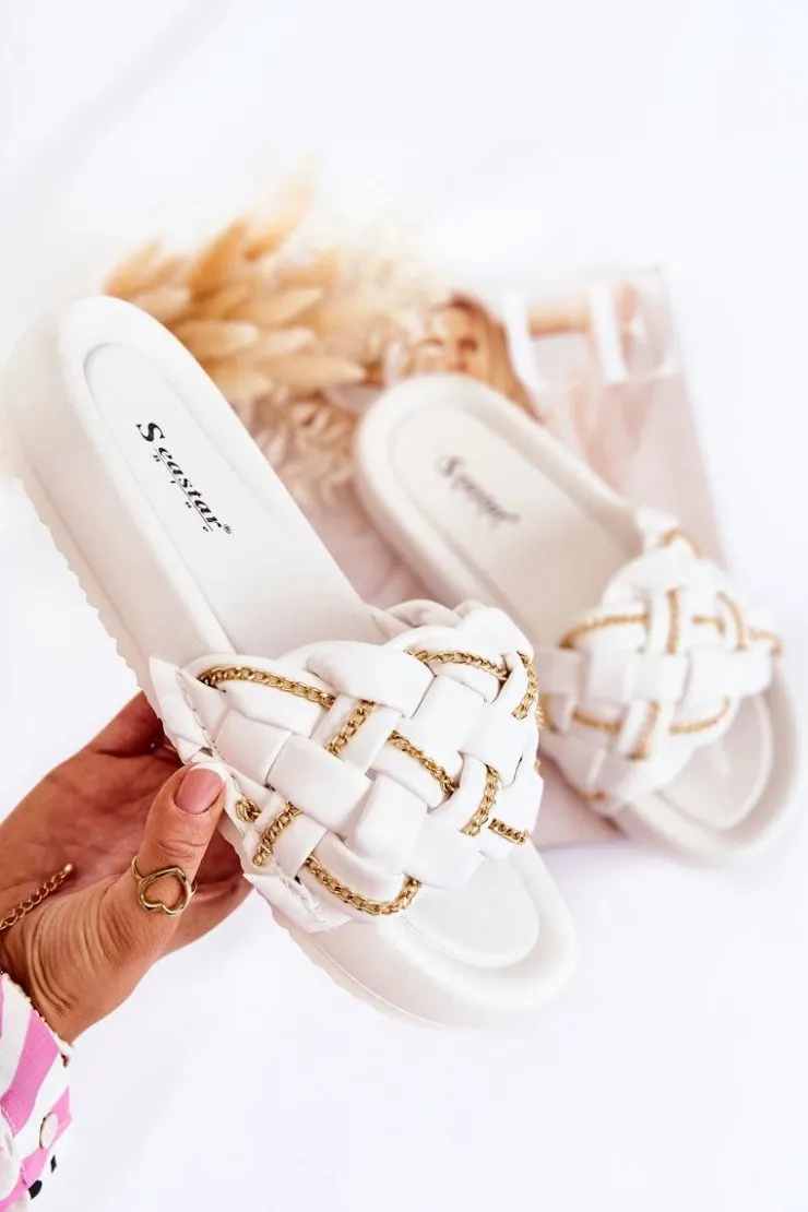 Modne klapki wykonane z eko skóry. Posiadają pleciony pasek z ozdobnym, delikatnym łańcuszkiem. Osadzone na platformie. Wkładka wykonana z gumowego tworzywa. Nosek odkryty, zaokrąglony. Model, który świetnie wpasuje się w letnie klimaty! Koniecznie powinnaś je mieć! Fason ten będzie pasować do wielu stylizacji. Model klasyczny, wsuwany. Przy wyborze rozmiaru prosimy sugerować się tabelą rozmiarów.
