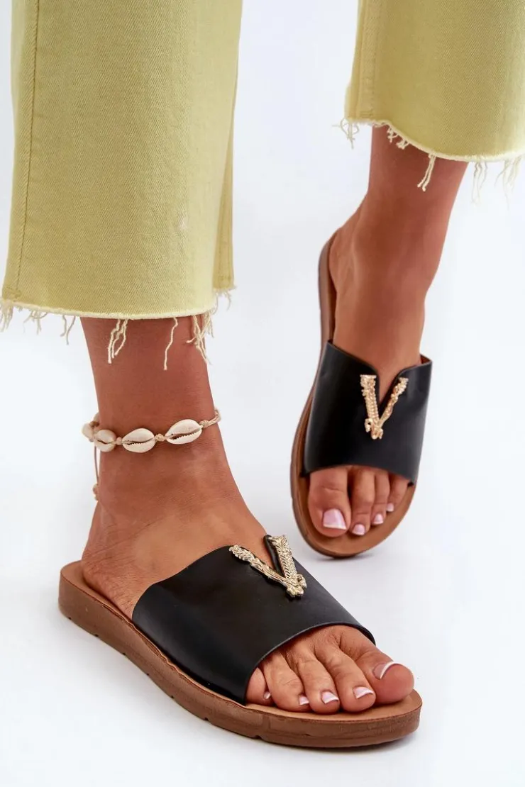 Klapki damskie wykonane ze skóry ekologicznej. Osadzone na płaskiej podeszwie. Złota ozdoba dodaje im subtelnej elegancji, dzięki czemu świetnie sprawdzą się zarówno na codzienne spacery, jak i na letnie wyjścia. To idealne obuwie na ciepłe letnie dni! Przy wyborze rozmiaru prosimy sugerować się tabelą rozmiarów.