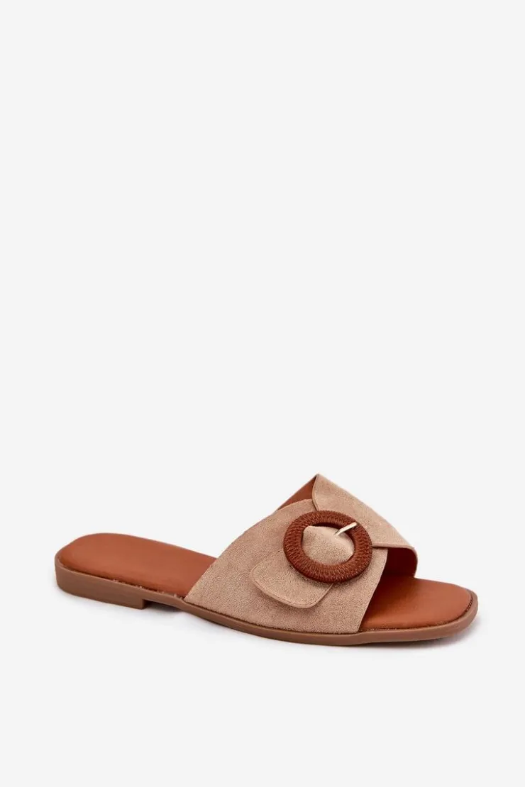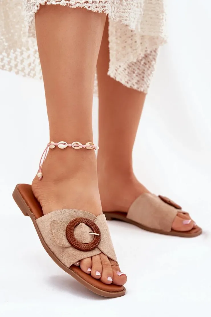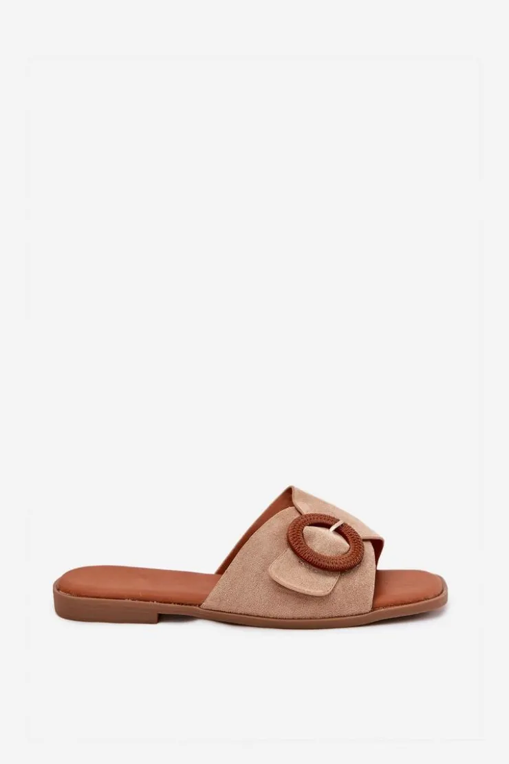 Klapki damskie na płaskim obcasie, wykonane z eko zamszu, to elegancka i komfortowa propozycja na ciepłe dni. Model ten wyróżnia się ozdobną klamrą, która dodaje im wyjątkowego charakteru. Idealne na co dzień, łączą prostotę z modnym akcentem, doskonale komponując się z letnimi stylizacjami. Przy wyborze rozmiaru prosimy sugerować się tabelą rozmiarów.