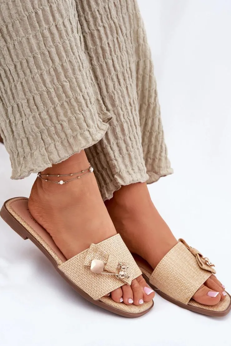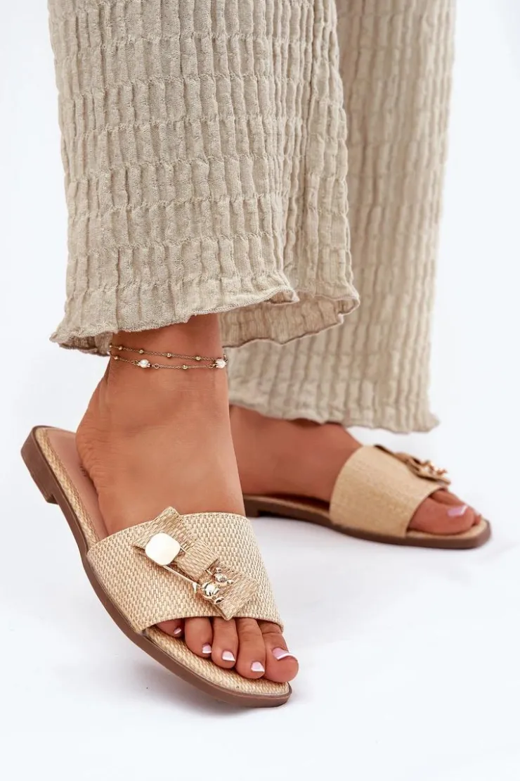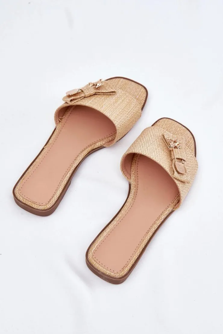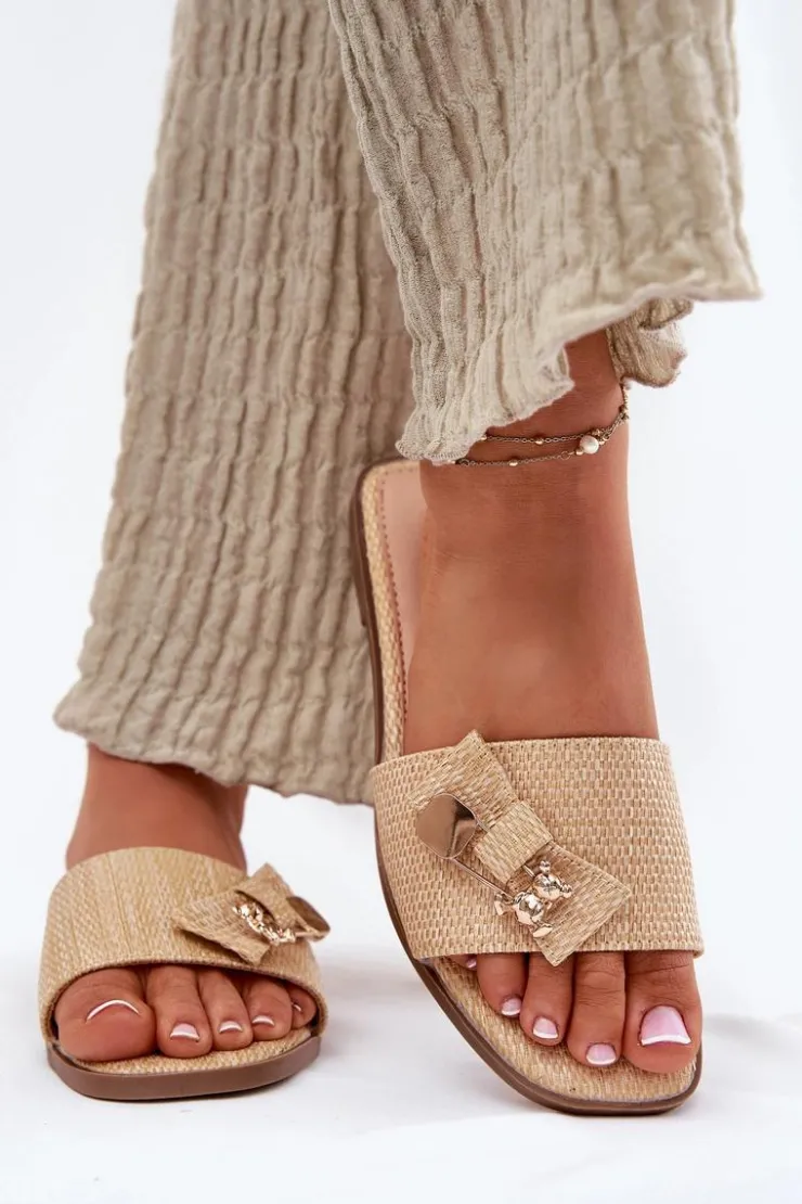 Klapki damskie na płaskim obcasie to połączenie wygody i stylu. Model ten wyróżnia się uroczą kokardką z ozdobną broszką, która dodaje stylowego akcentu. Idealne na co dzień, świetnie sprawdzą się zarówno do sukienek, jak i spodni, podkreślając kobiecy charakter każdej stylizacji. Przy wyborze rozmiaru prosimy sugerować się tabelą rozmiarów.