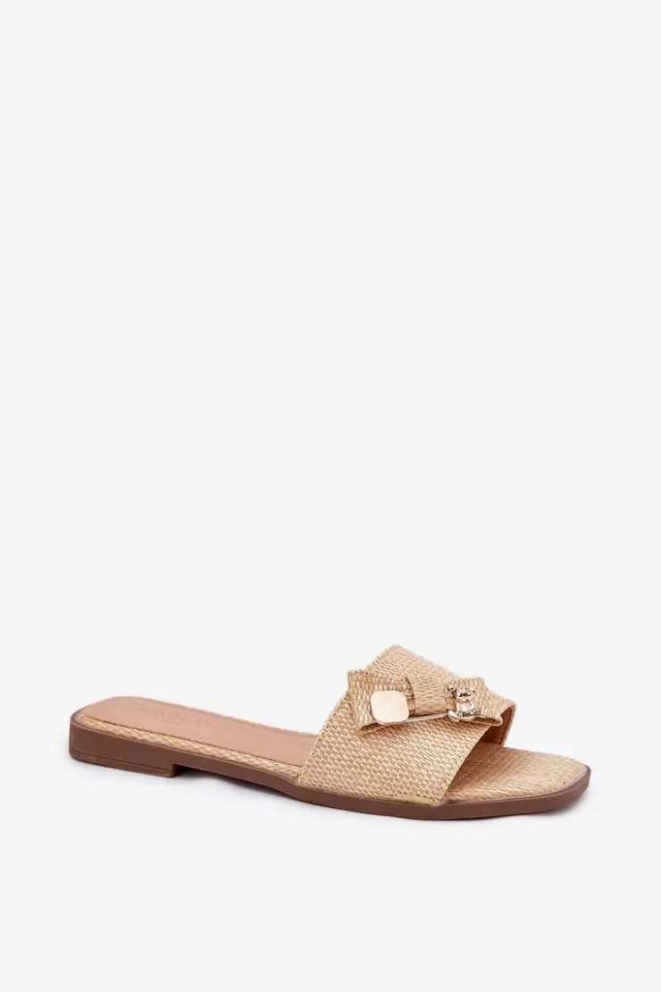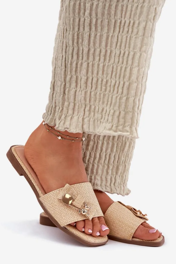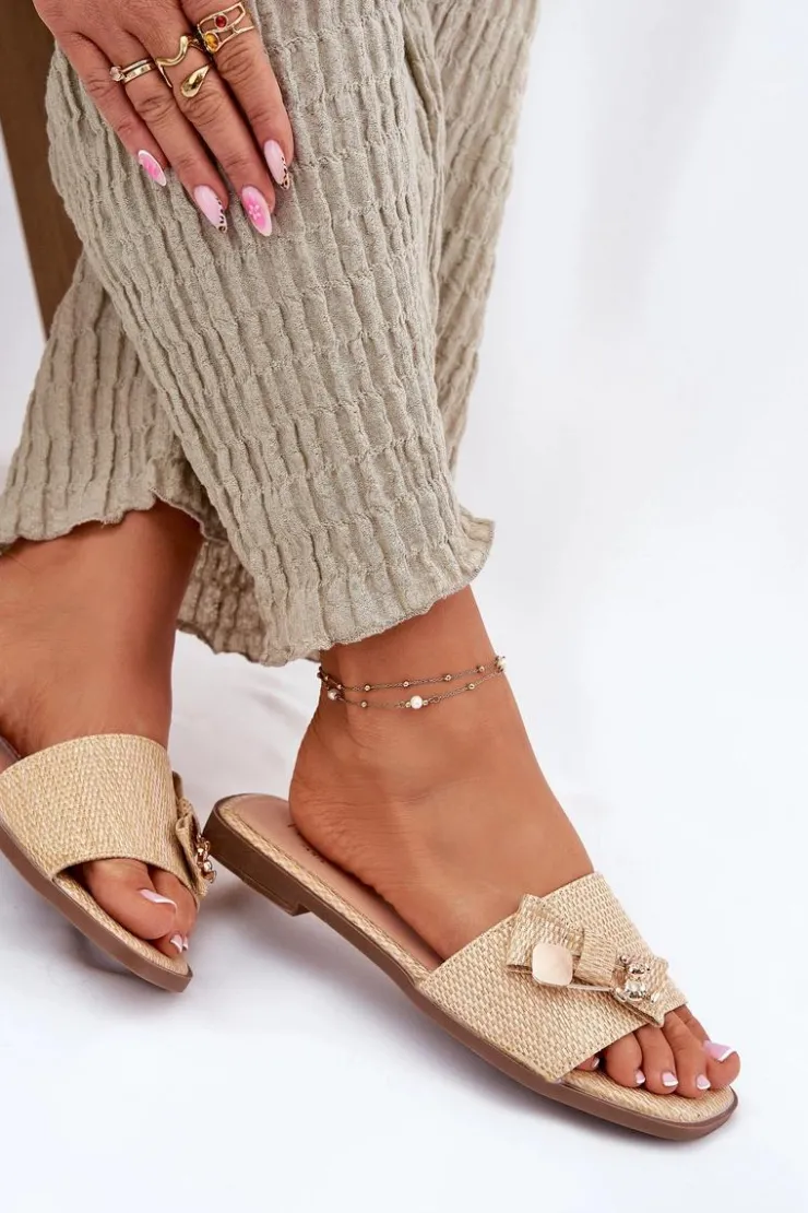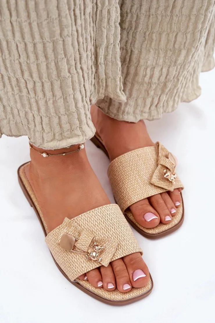 Klapki damskie na płaskim obcasie to połączenie wygody i stylu. Model ten wyróżnia się uroczą kokardką z ozdobną broszką, która dodaje stylowego akcentu. Idealne na co dzień, świetnie sprawdzą się zarówno do sukienek, jak i spodni, podkreślając kobiecy charakter każdej stylizacji. Przy wyborze rozmiaru prosimy sugerować się tabelą rozmiarów.