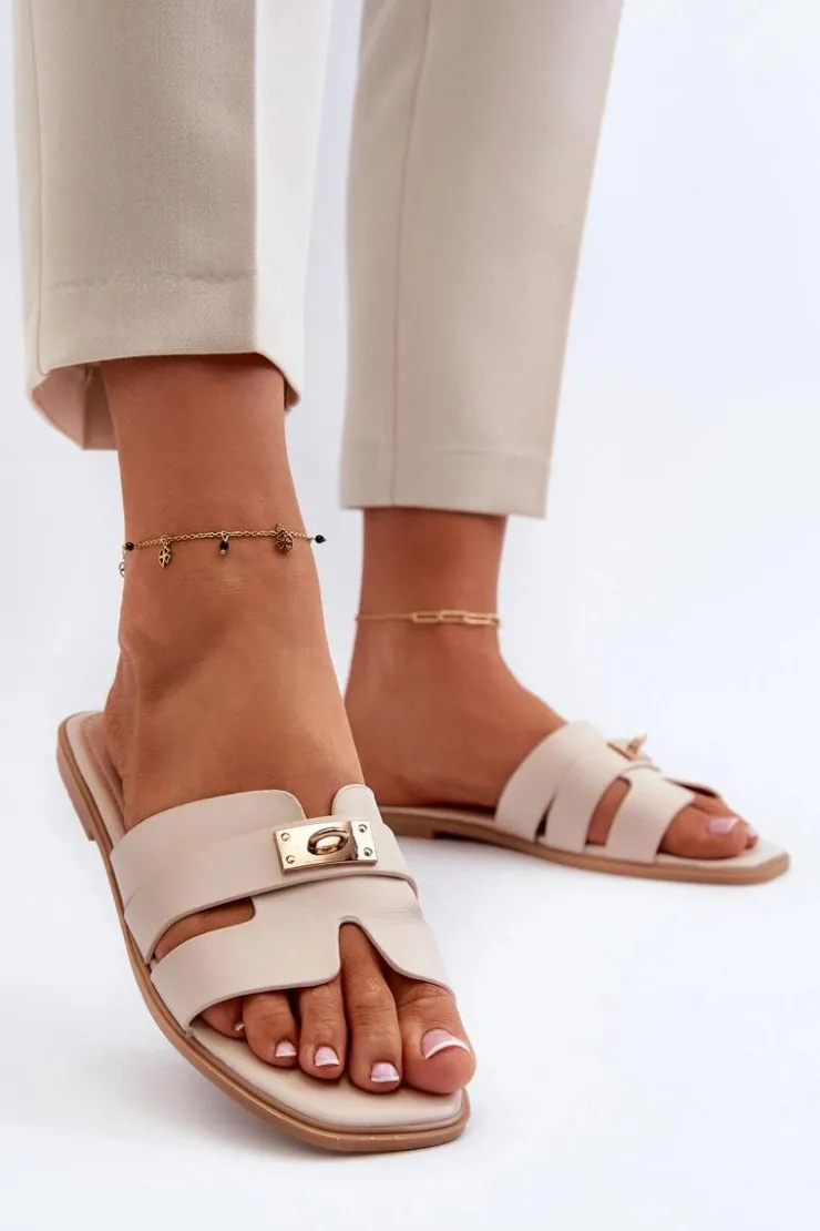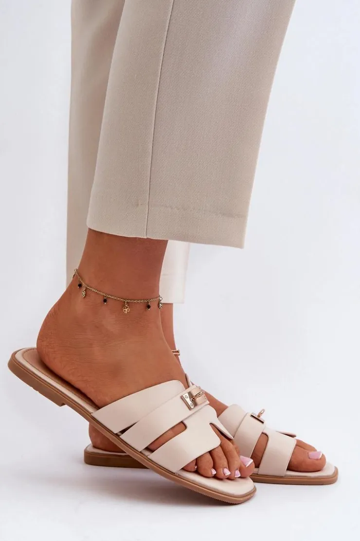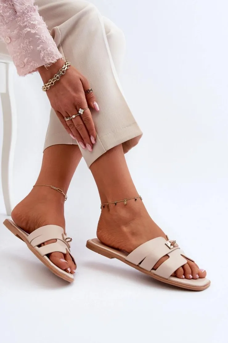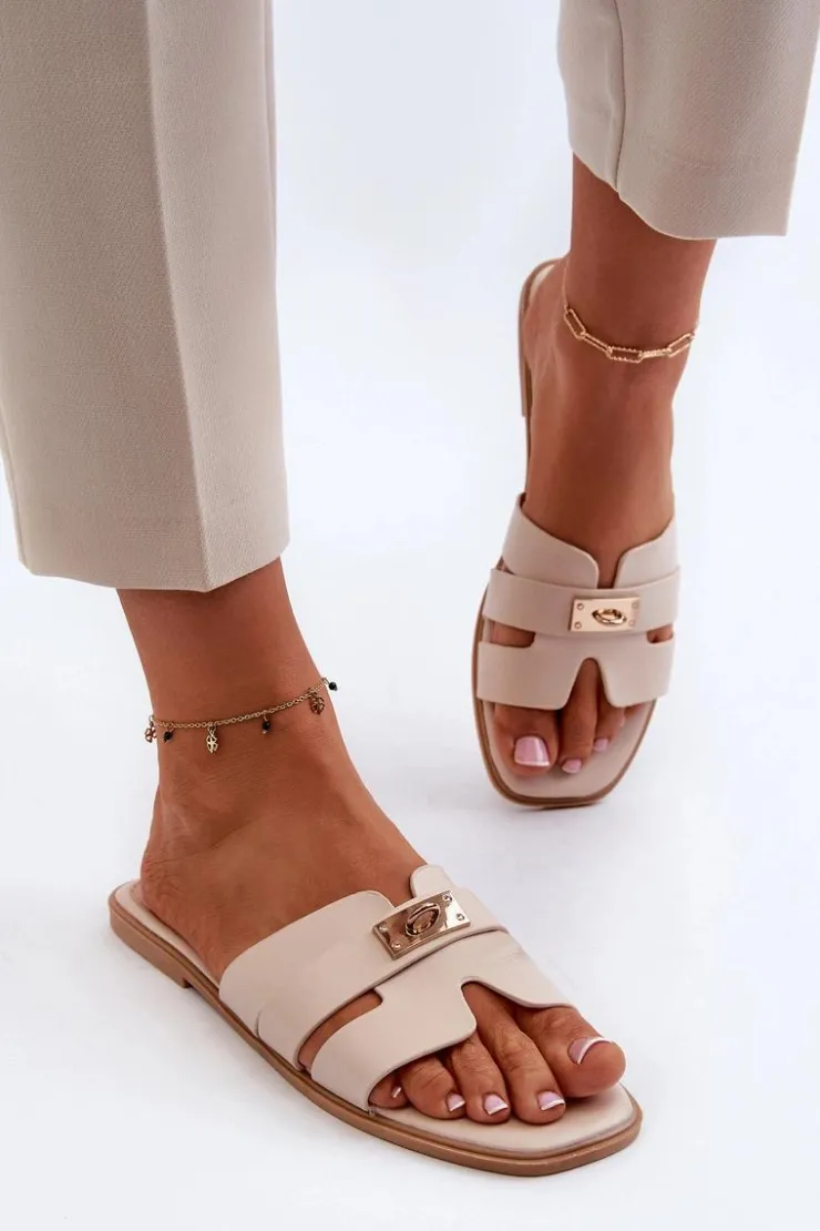 Stylowe i płaskie klapki damskie są idealnym wyborem na upalne dni. Wykonane z eko skóry. Z przodu delikatna złota ozdoba, która dodaje im elegancji i wyjątkowego charakteru. Te klasyczne klapki nie tylko świetnie prezentują się, ale także są komfortowe i praktyczne na co dzień, doskonale uzupełniając letnią garderobę. Przy wyborze rozmiaru prosimy sugerować się tabelą rozmiarów.