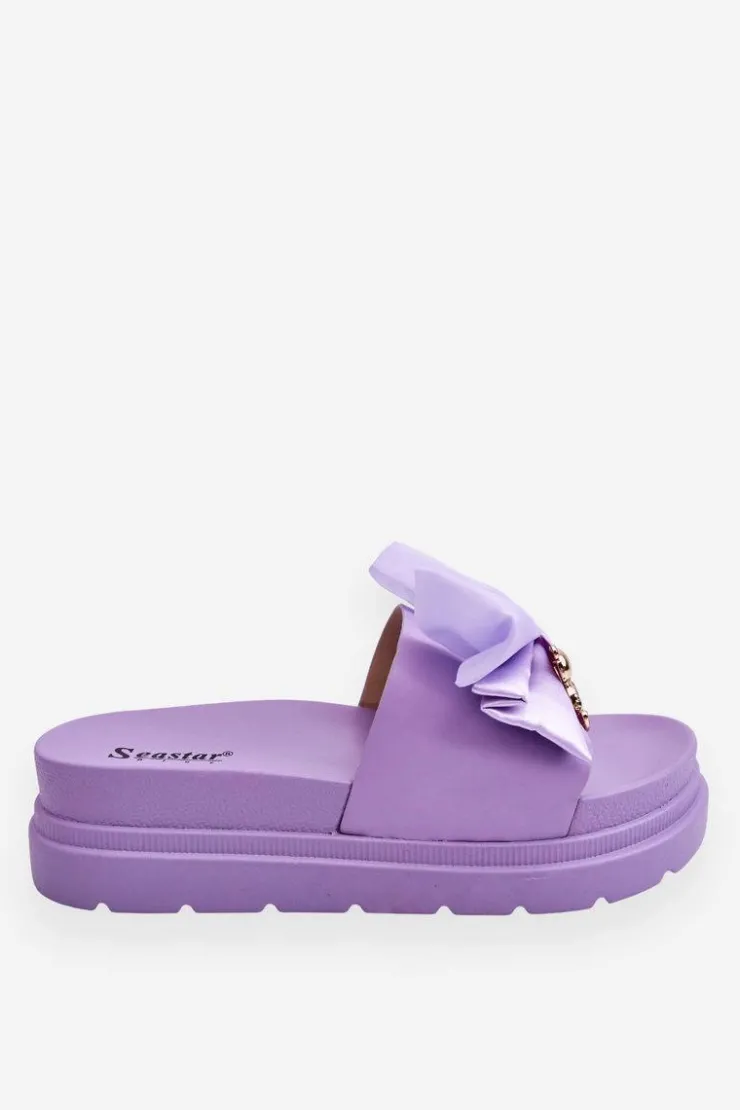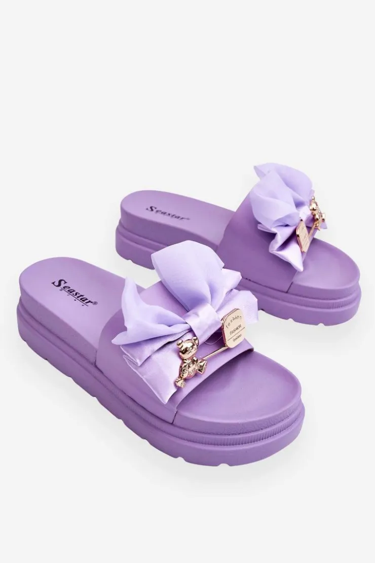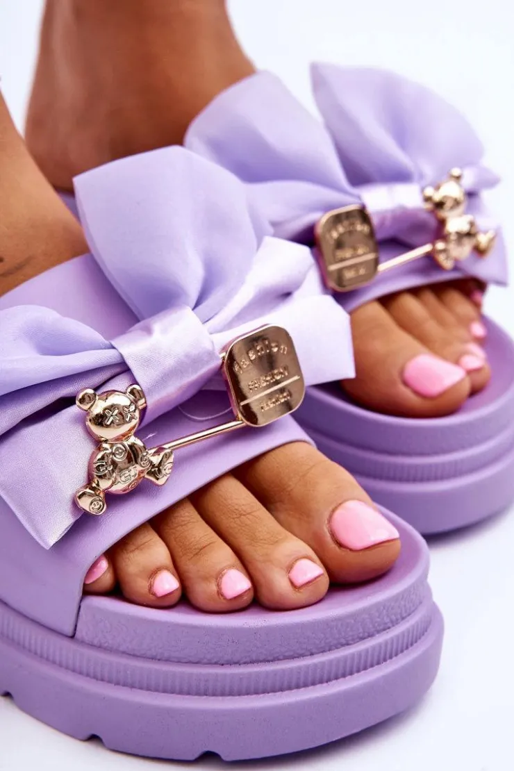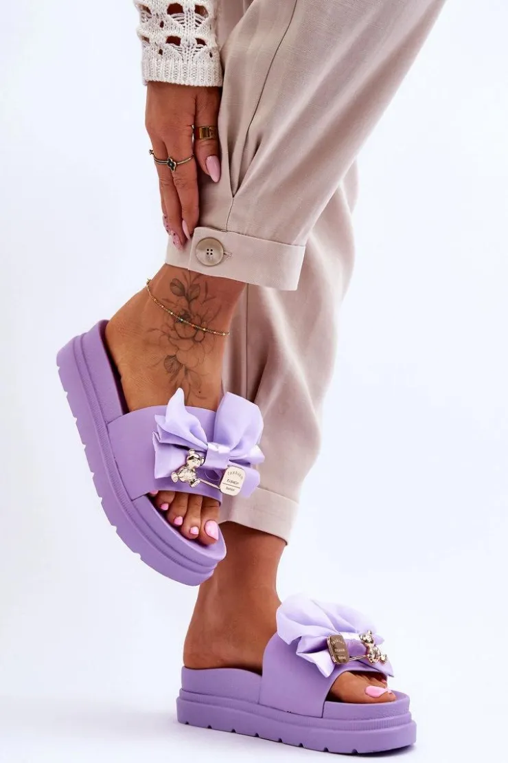 Cudowne, damskie klapki wykonane z eko skóry. Model ten posiada materiałową kokardę i imitację agrafki z misiem i blaszką z napisem. Osadzone na masywnej platformie. Wkładka została wykonana z tworzywa sztucznego. Idealne klapki na nadchodzący sezon! Koniecznie powinnaś je mieć! Przy wyborze rozmiaru prosimy sugerować się tabelą rozmiarów.
