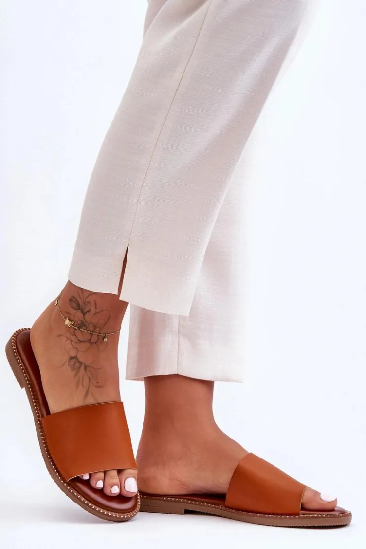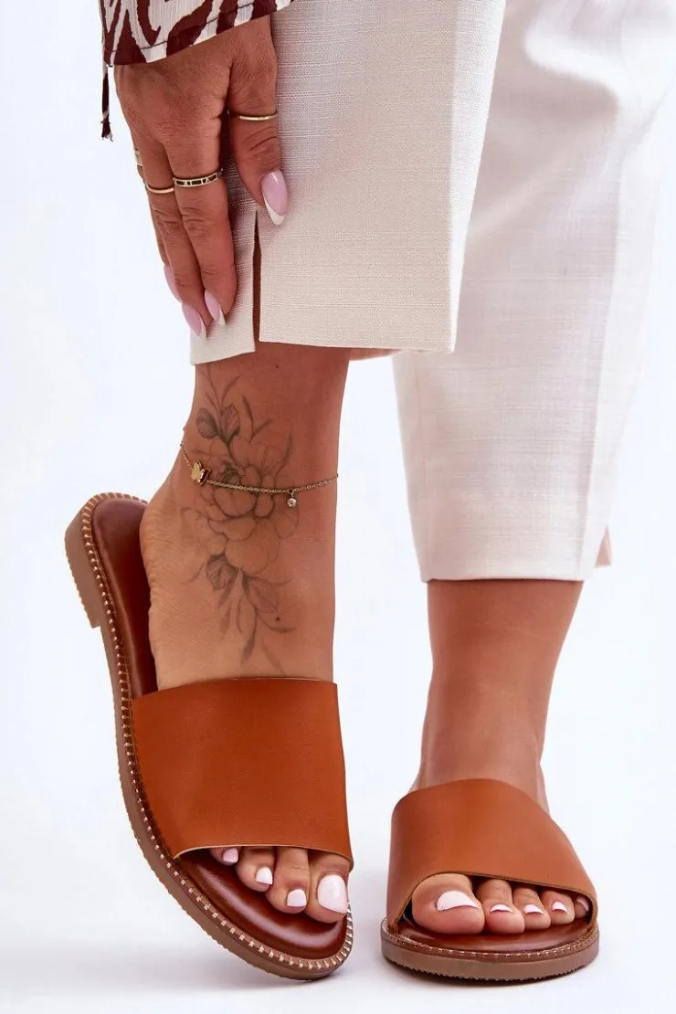 Klasyczne, damskie klapki zostały wykonane z eko skóry. Model ten został osadzony na płaskim obcasie i podeszwie z tworzywa sztucznego. Dodatkowo klapki posiadają wokół podeszwy zdobienia. Miękka wkładka w tym obuwiu zapewni komfortowe użytkowanie. Koniecznie powinnaś mieć ten model w swojej szafie! Przy wyborze rozmiaru prosimy sugerować się tabelą rozmiarów.