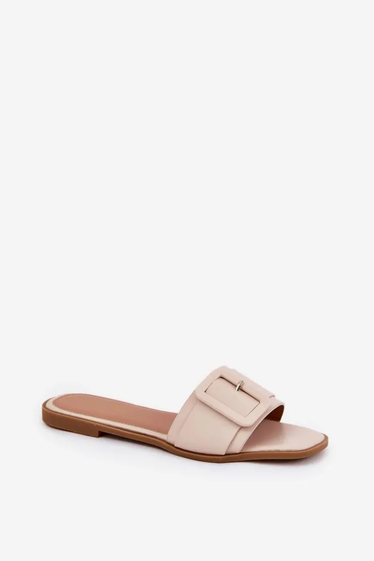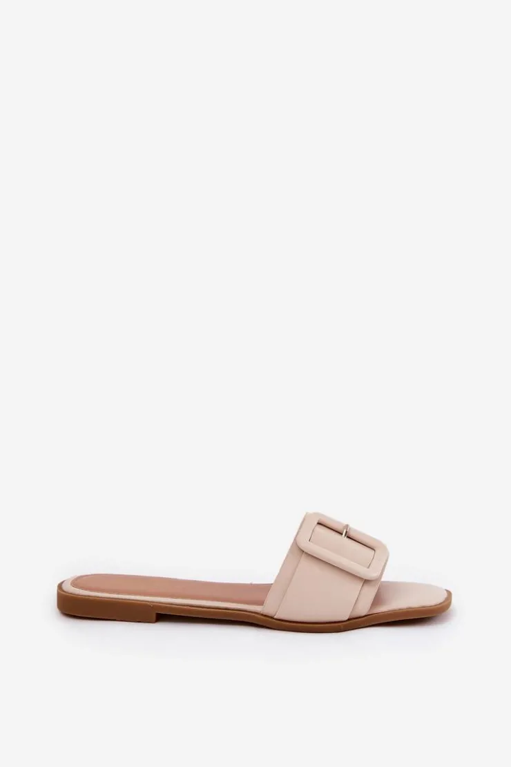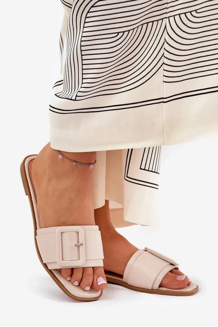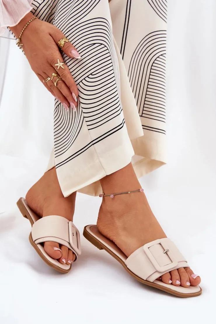 Klasyczne klapki damskie z eko skóry, osadzone na płaskim obcasie, które łączą wygodę z eleganckim wyglądem. Duża klamra na pasku dodaje im subtelnego charakteru. Idealne na co dzień, te klapki doskonale komponują się z letnimi stylizacjami, zapewniając komfort i prostą elegancję przez cały dzień. Przy wyborze rozmiaru prosimy sugerować się tabelą rozmiarów.