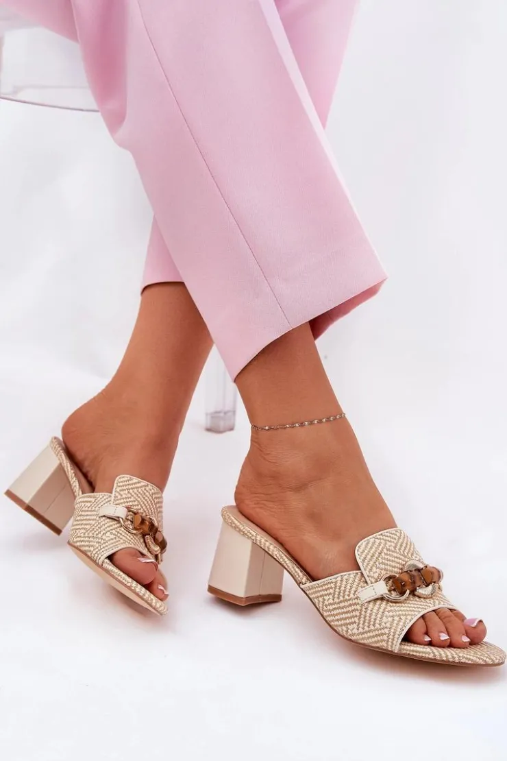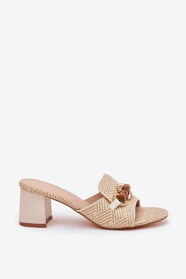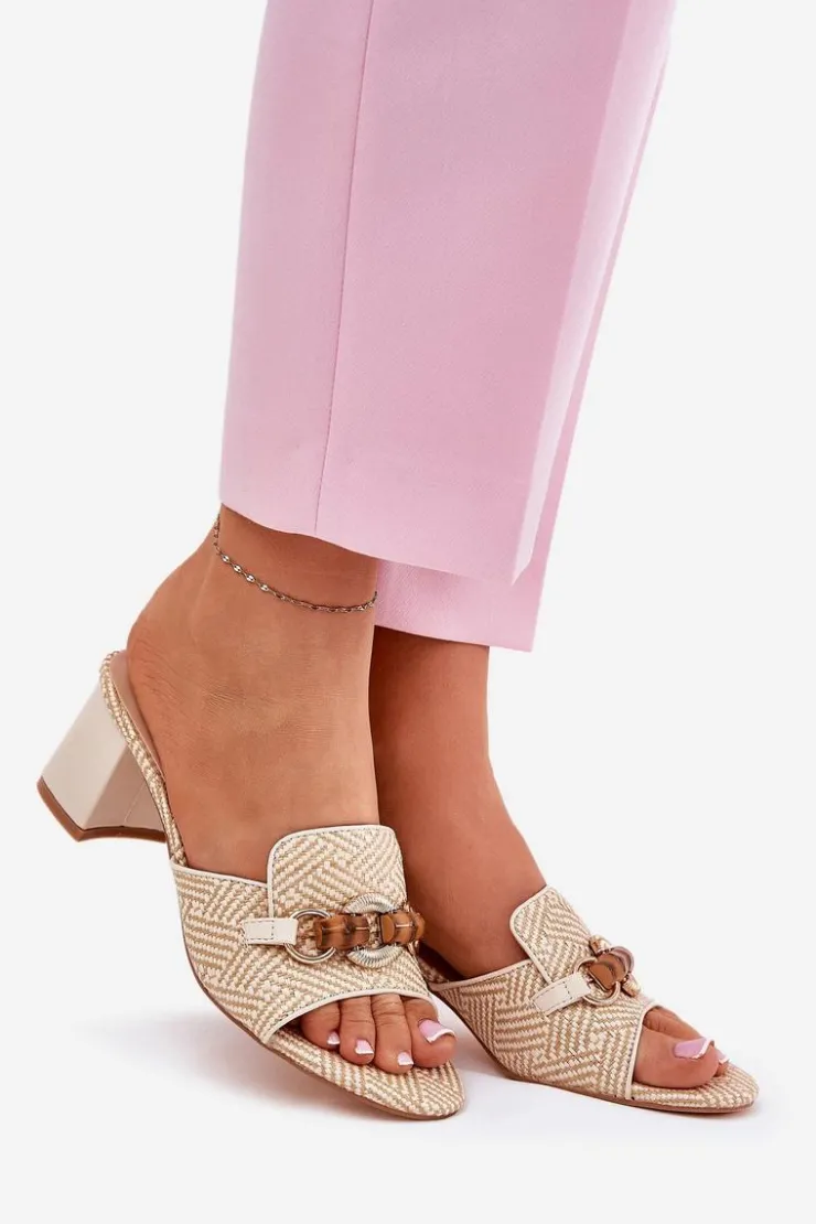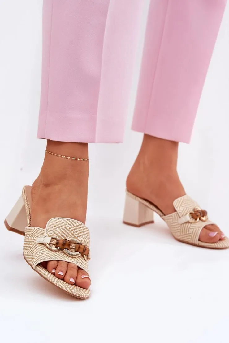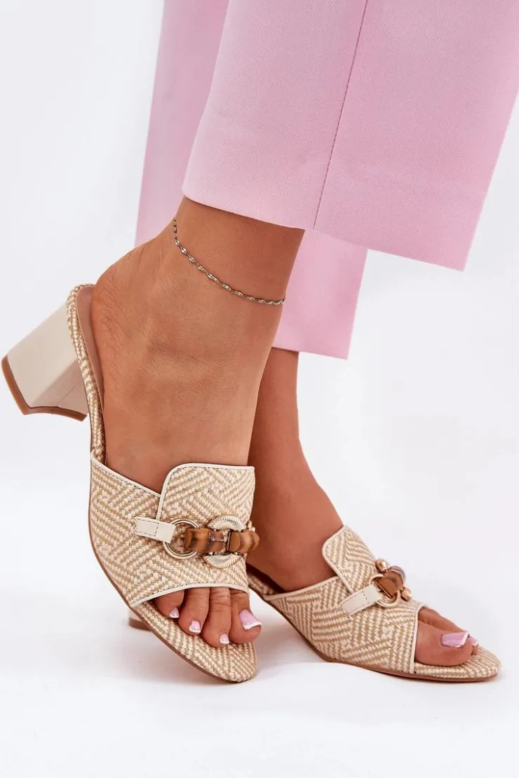 Stylowe klapki damskie z plecionki. Osadzone na obcasie typu słupek. Z przodu ozdoba, która nadaje unikalnego charakteru i przyciąga wzrok. Te klapki będą doskonałym wyborem na letnie dni, idealnie komponując się z sukienkami, spódnicami czy spodniami. Przy wyborze rozmiaru prosimy kierować się tabelą rozmiarów.