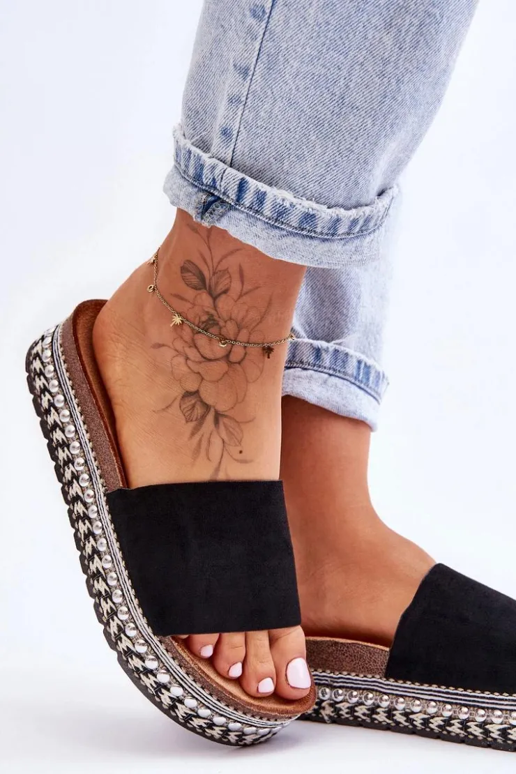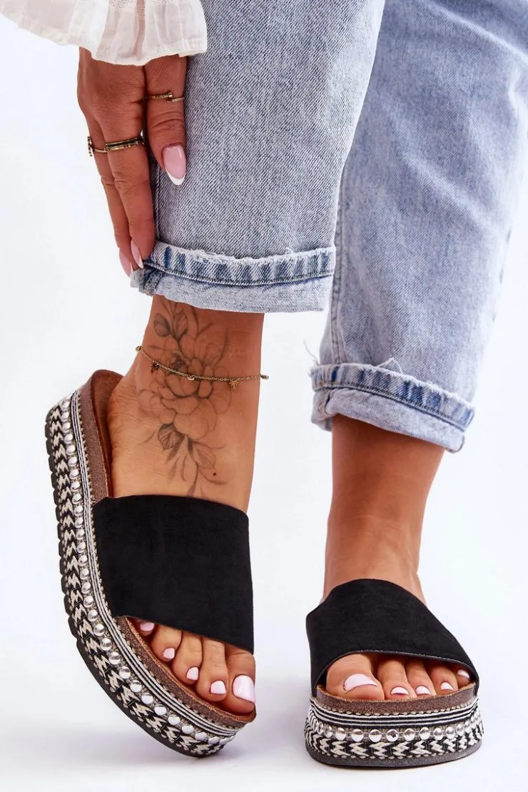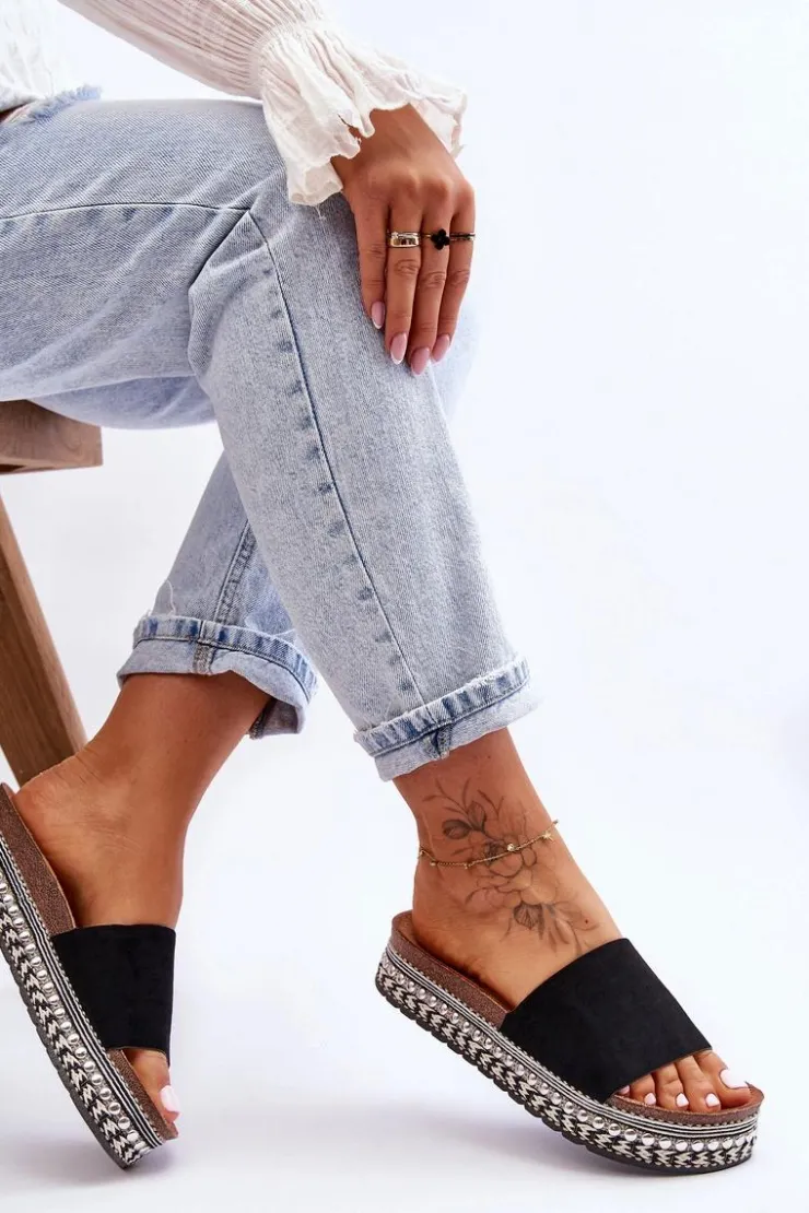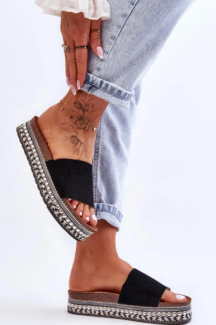 Damskie klapki zostały osadzone na masywnej platformie ze zdobieniami w postaci sznureczków oraz ćwieków. Profilowana wkładka jest wykonana z przyjemnego w dotyku eko zamszu. Platforma została ozdobiona sznureczkami oraz ćwiekami. Nosek jest odkryty i zaokrąglony. Ten model powinien być Twój! Przy wyborze rozmiaru prosimy sugerować się tabelą rozmiarów.