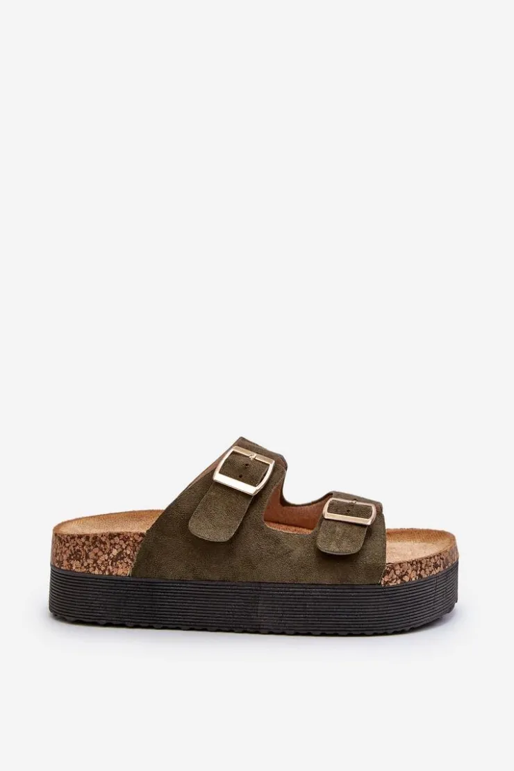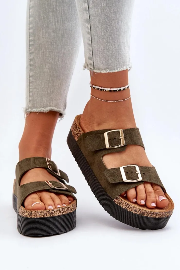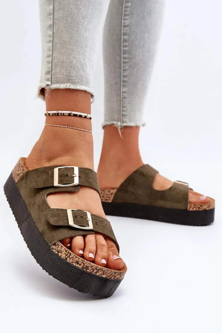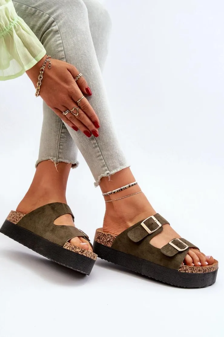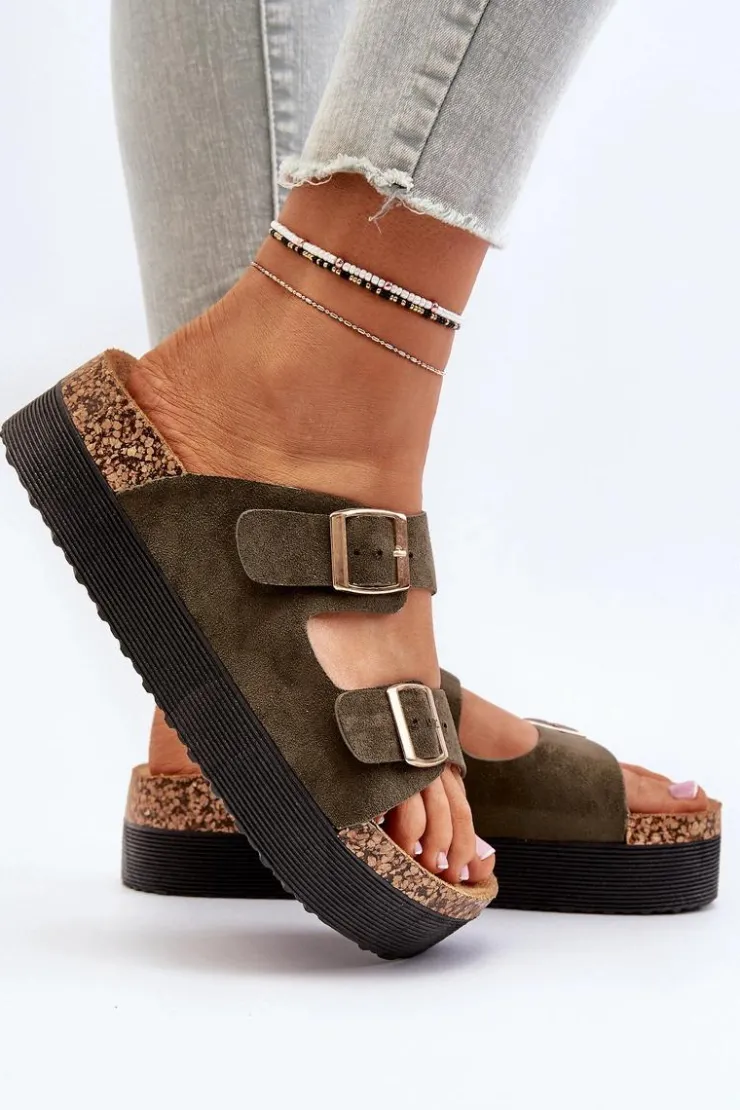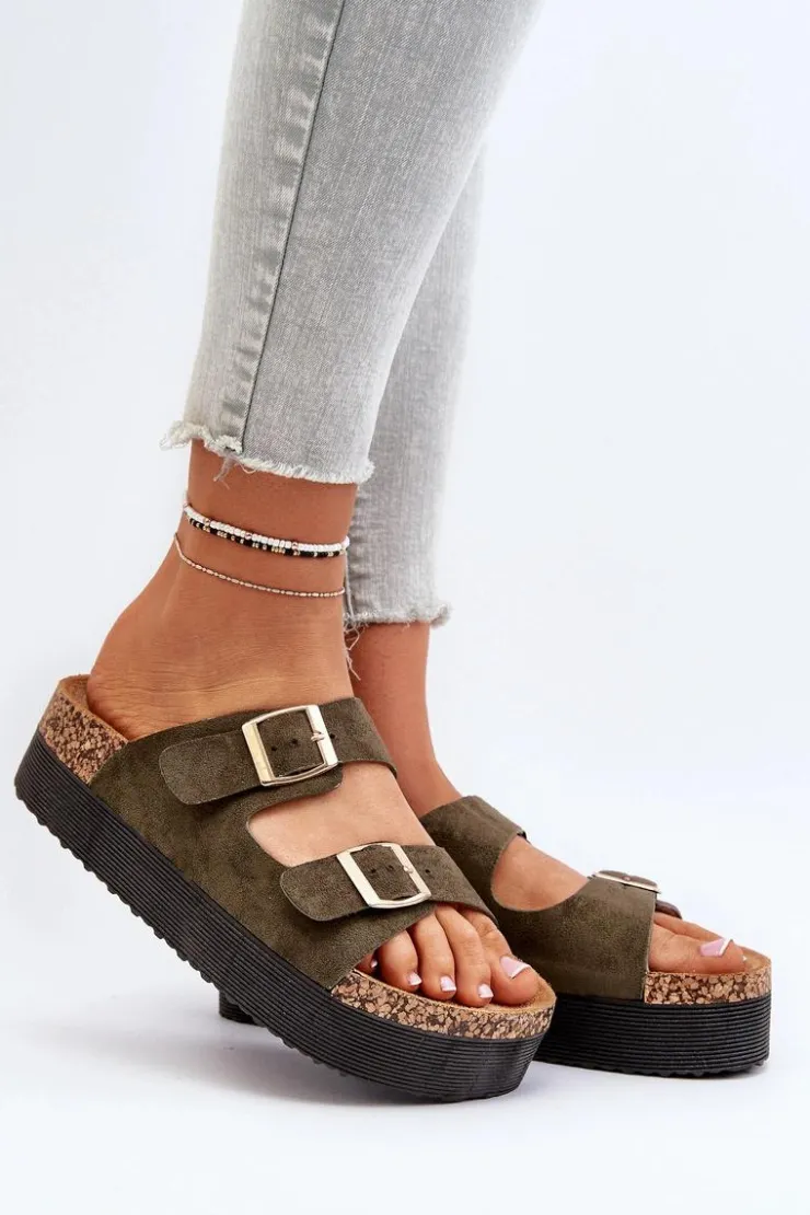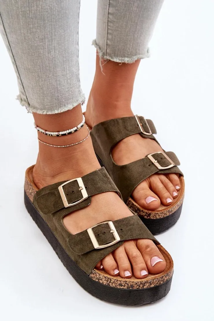 Klapki damskie osadzone na masywnej platformie. Model ten posiada dwa paski, które można regulować za pomocą sprzączek, zapewniając idealne dopasowanie. Dzięki profilowanej wkładce wykonanej z eko zamszu będą wygodne podczas noszenia nawet przez cały dzień. Doskonałe na letnie spacery i codzienne wyjścia na zakupy. Przy wyborze rozmiaru prosimy sugerować się tabelą rozmiarów.
