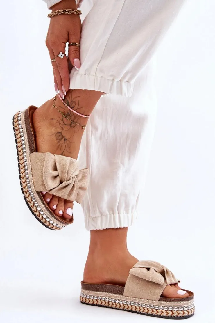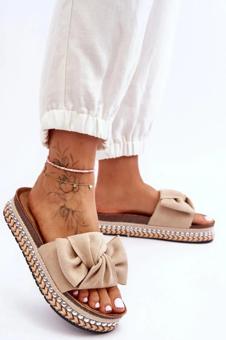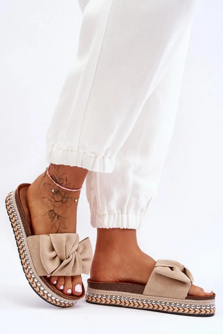 Klasyczne, damskie klapki zostały osadzone na masywnej platformie ze zdobieniami w postaci sznureczków oraz ćwieków. Wykonane z eko zamszu. Na przodzie znajduje się ozdoba w postaci kokardy. Profilowana wkładka jest wykonana z przyjemnego w dotyku eko zamszu. Te klapki to idealny model na lato! Przy wyborze rozmiaru prosimy sugerować się tabelą rozmiarów.