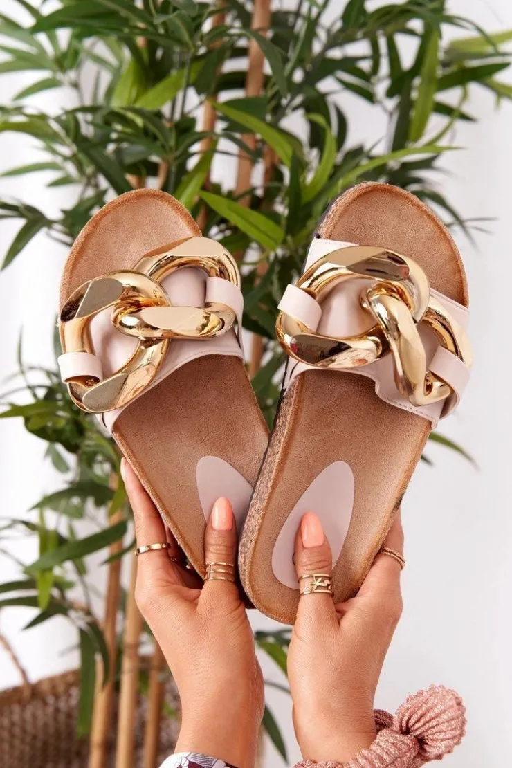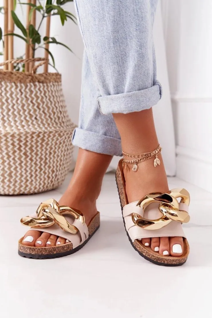 Wyjątkowe klapki damskie wykonane z eko skóry. Buty posiadają profilowaną wkładkę, która zagwarantuje komfort. Modny fason z masywnym łańcuchem urozmaici Twoje stylizacje! Przy wyborze rozmiaru prosimy sugerować się tabelą rozmiarów.
