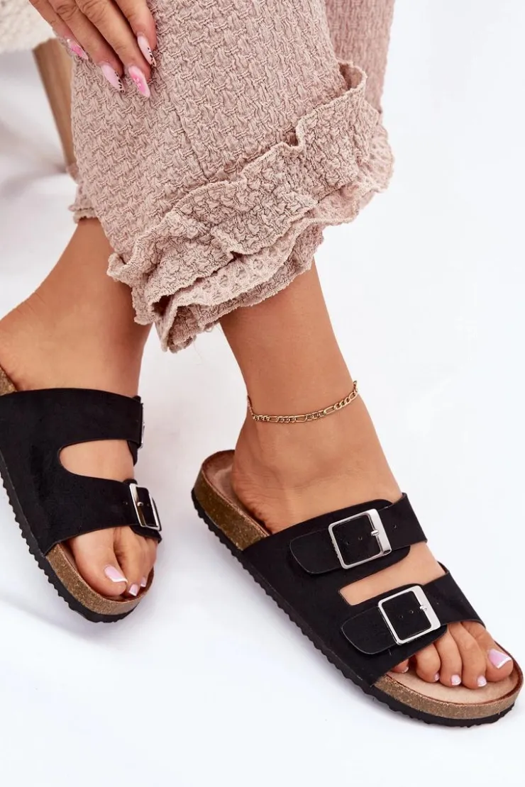 Klapki damskie z eko zamszu to połączenie stylu i wygody na co dzień. Wyposażone w dwa regulowane paski z klamrami, które umożliwiają idealne dopasowanie do stopy. Profilowana wkładka zapewnia komfort, a korkowa platforma dodaje lekkości i stabilności. Doskonałe na codzienne stylizacje, łączą funkcjonalność z modnym wyglądem. Przy wyborze rozmiaru prosimy sugerować się tabelą rozmiarów.