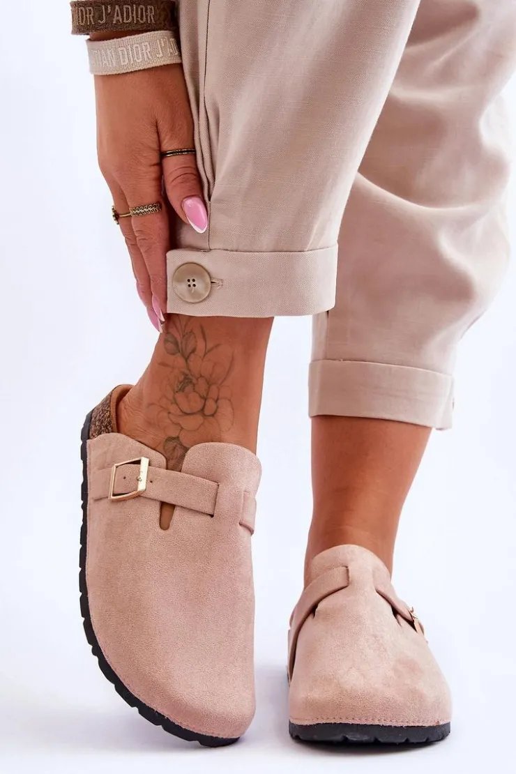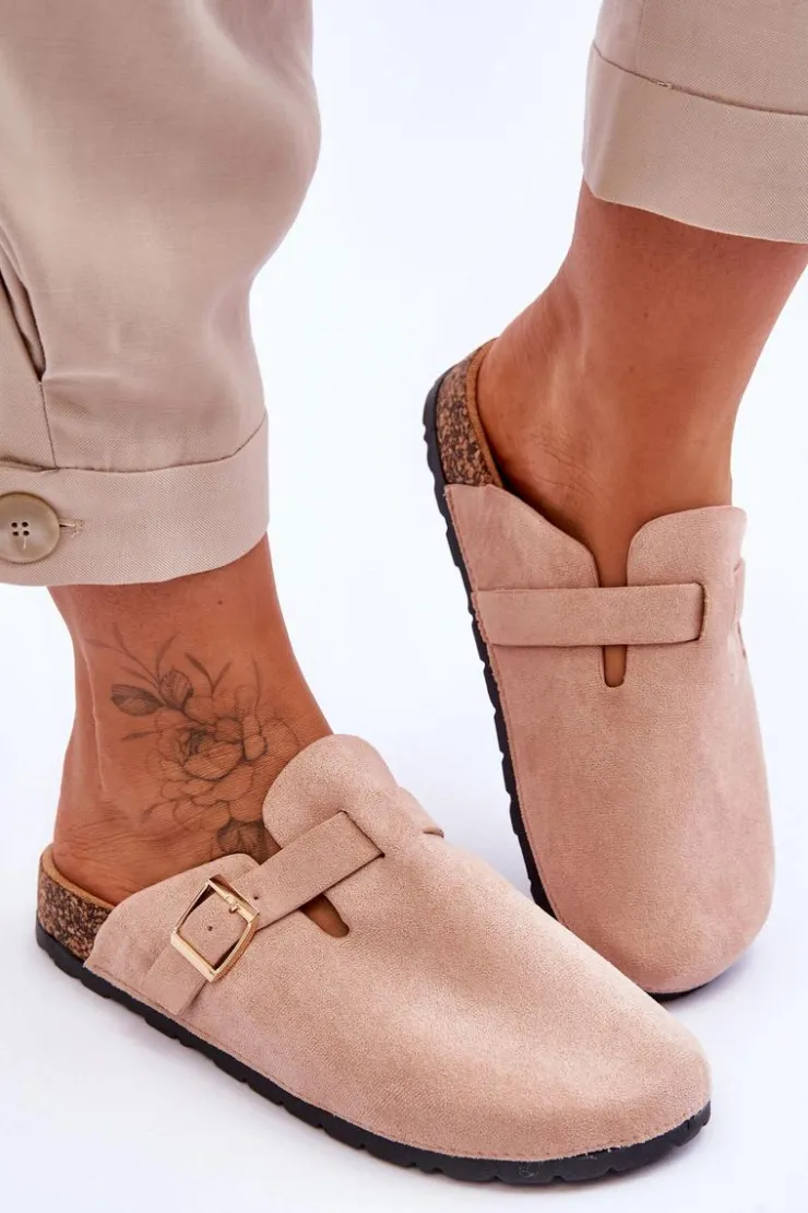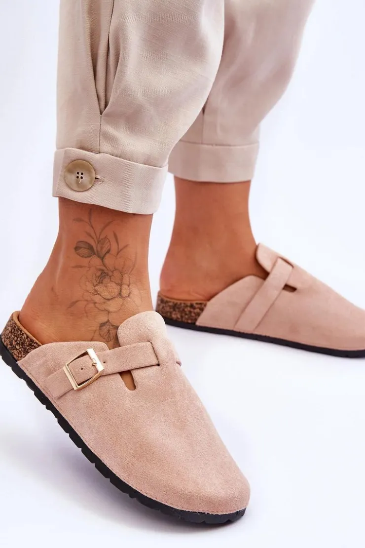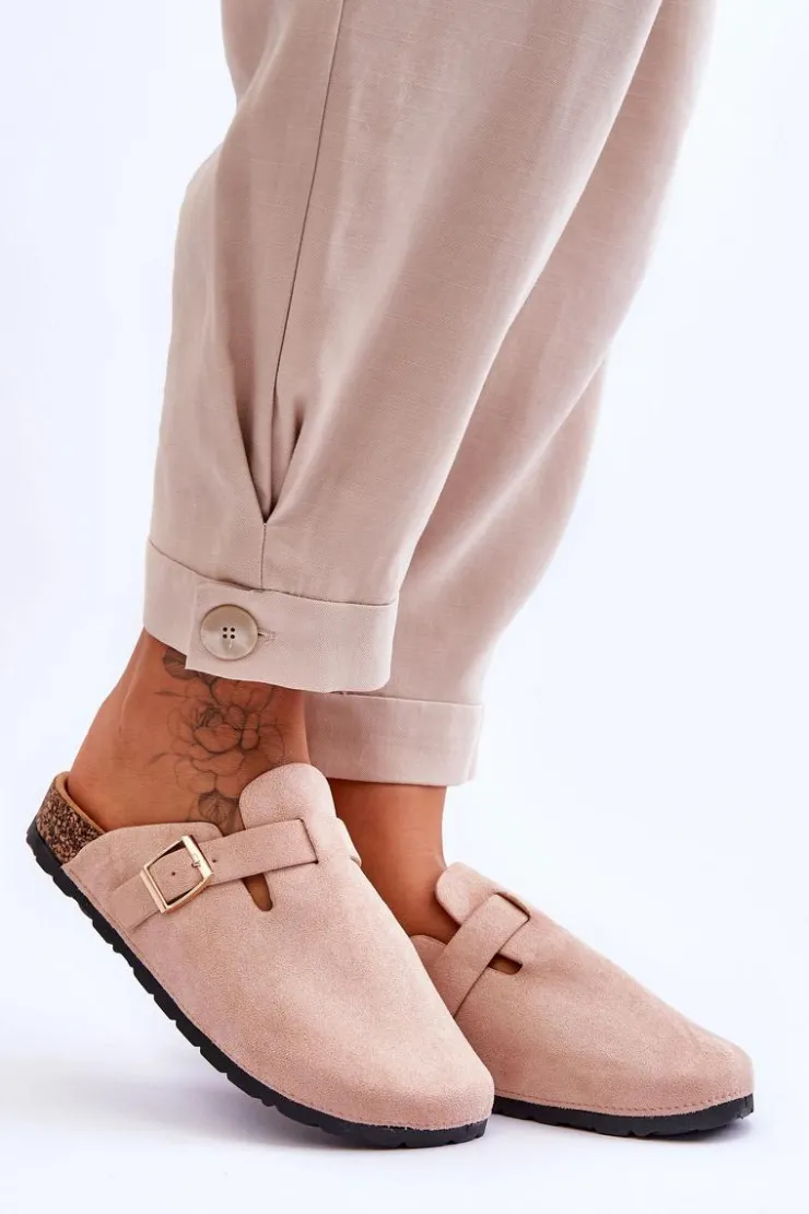 Klapki zostały osadzone na korkowej platformie z podeszwą z tworzywa sztucznego. Klapki zostały wykonane z eko zamszu. Posiadają profilowaną wkładkę z eko zamszu. Dodatkowo zostały ozdobione regulowanym paseczkiem ze sprzączką. Klapki z zabudowanym noskiem możesz używać także zamiast papci. Przy wyborze rozmiaru prosimy sugerować się tabelą rozmiarów.