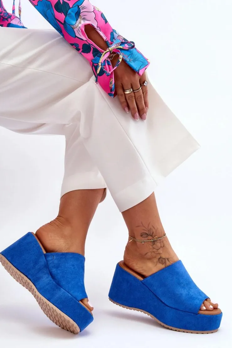Wyjątkowe, damskie klapki zostały osadzone na masywnej platformie i koturnie. Wykonane z wierzchu z miłego w dotyku eko zamszu. Miękka wkładka została wykonana z eko skóry. Klapki posiadają odkryty nosek. Model ten posiada podeszwę z tworzywa sztucznego. Te klapki to świetny wybór na letnie, upalne dni! Przy wyborze rozmiaru prosimy sugerować się tabelą rozmiarów.