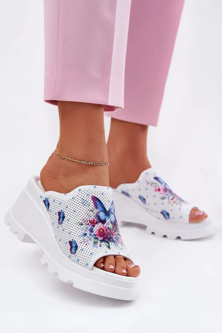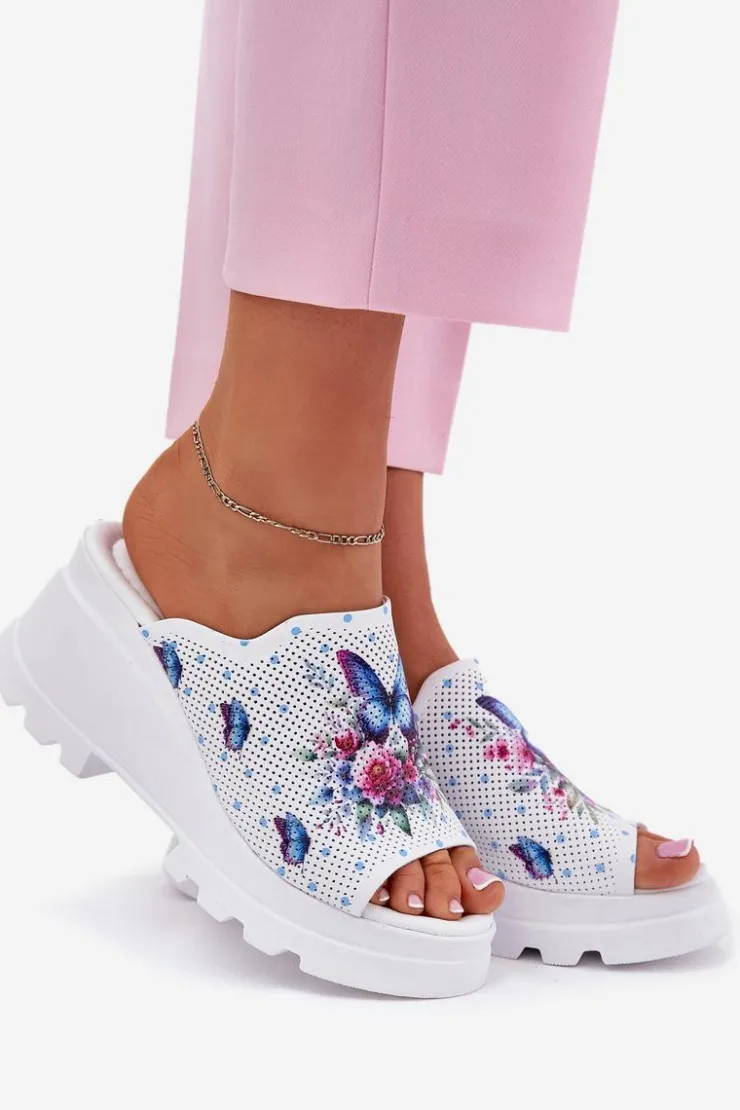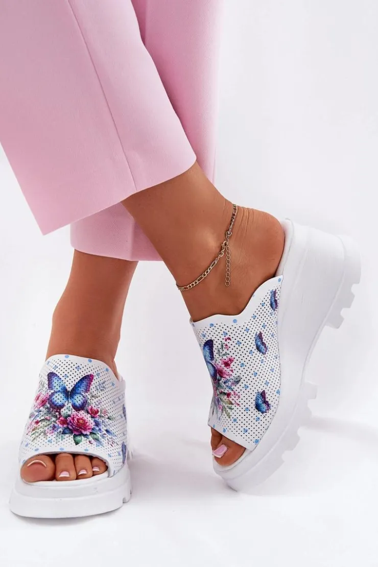 Eleganckie klapki damskie z naturalnej skóry to doskonały wybór na ciepłe dni. Osadzone na koturnie, zapewniają wygodę i stabilność. Model wyróżnia się geometryczną aplikacją, która nadaje nowoczesnego charakteru. Miękka wkładka gwarantuje komfort przez cały dzień, czyniąc te klapki idealnym dodatkiem do letnich stylizacji, łącząc elegancję z funkcjonalnością. Przy wyborze rozmiaru prosimy sugerować się tabelą rozmiarów.