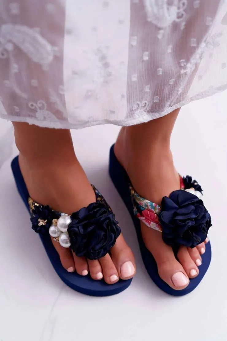 Boto Klapki Na Koturnie|Klapki Na Obcasie*Damskie Klapki Z Kwiatem Japonki Na Koturnie Granatowe Sharme