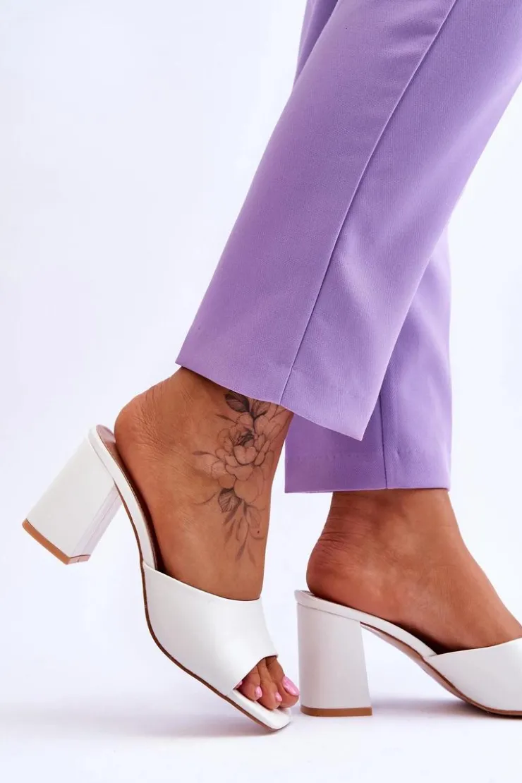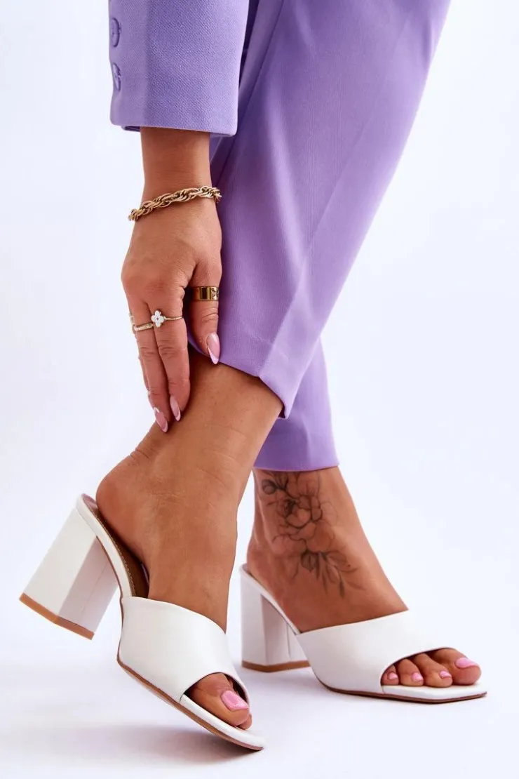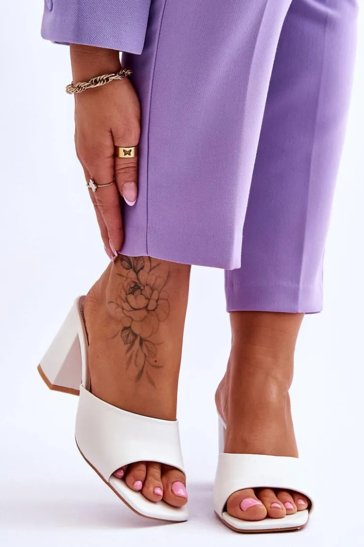 Damskie klapki o klasycznym fasonie. Model ten został wykonany z eko skóry. Klapki posiadają otwarty, kwadratowy nosek. Wkładka jest wygodna i wykonana z eko skóry. Klapki osadzono na obcasie w postaci słupka. Idealne do wielu stylizacji w upalne dni! Przy wyborze rozmiaru prosimy sugerować się tabelą rozmiarów.