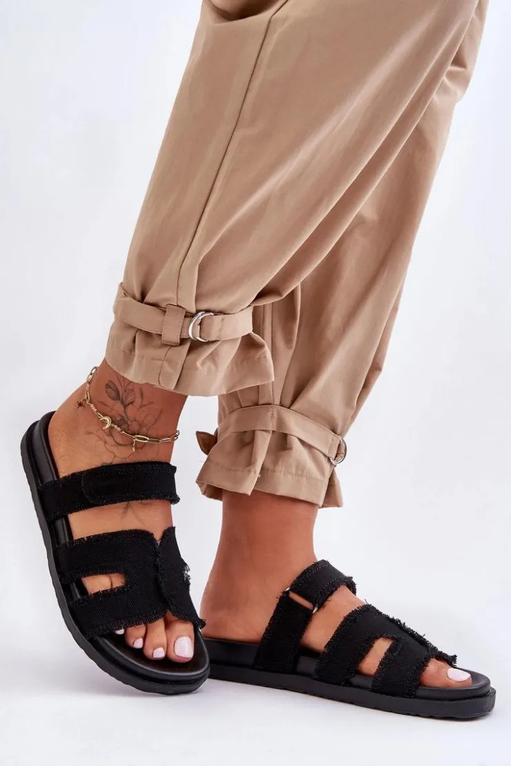 Klasyczne klapki damskie zostały wykonane z materiału tekstylnego. Model ten posiada dodatkowe zapięcie na rzep, dzięki któremu można dopasować obuwie do tęgości nogi. Buty te osadzono na platformie z tworzywa sztucznego. Klapki świetnie sprawdzą się na co dzień w upalne dni! Przy wyborze rozmiaru prosimy sugerować się tabelą rozmiarów.