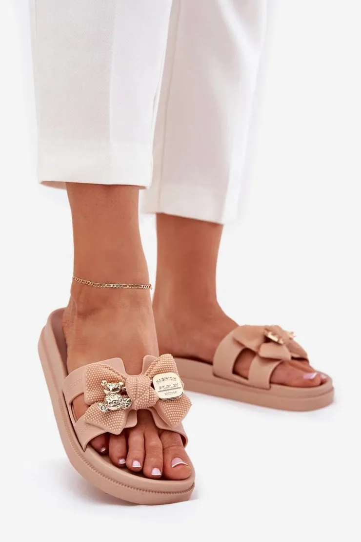Klapki damskie z wycięciami, osadzone na delikatnej platformie. Wykonane z gumowego tworzywa. Ozdobione kokardką i złotą broszką, dodają stylowego akcentu każdej stylizacji. Idealne na ciepłe dni, doskonale komponują się z letnimi sukienkami, spódnicami i szortami. Przy wyborze rozmiaru prosimy sugerować się tabelą rozmiarów.