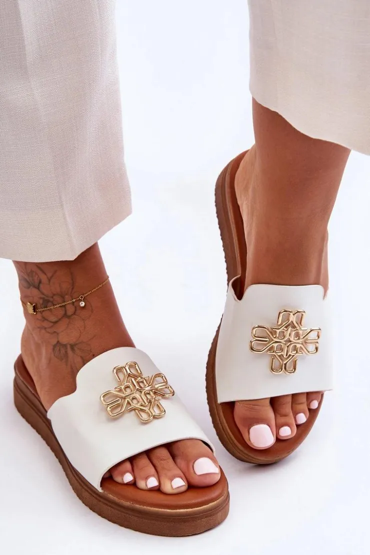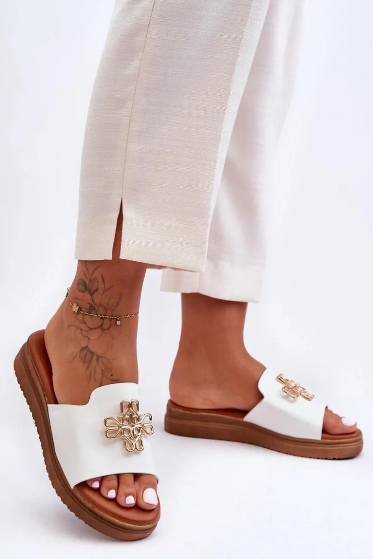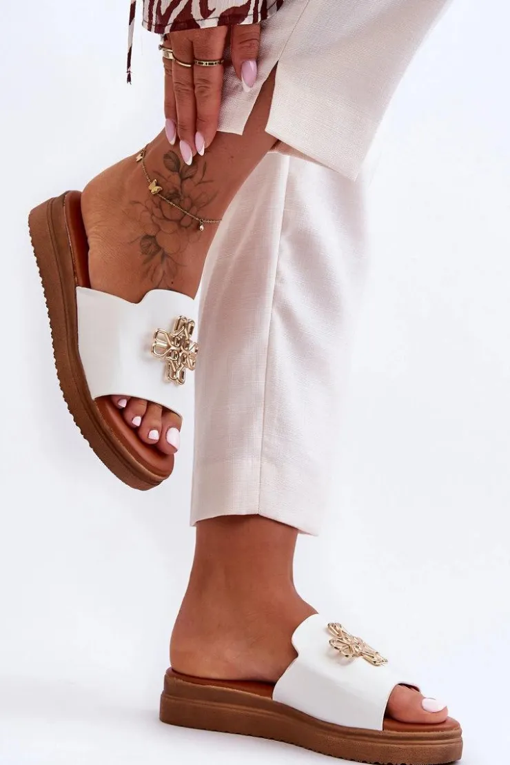 Klasyczne, damskie klapki zostały wykonane z eko skóry. Model ten posiada ozdobę wykonaną z tworzywa sztucznego. Klapki osadzono na grubej platformie. Wkładka jest bardzo miękka i wygodna w użytkowaniu. Ten model powinien znaleźć się właśnie w Twojej garderobie! Przy wyborze rozmiaru prosimy sugerować się tabelą rozmiarów.