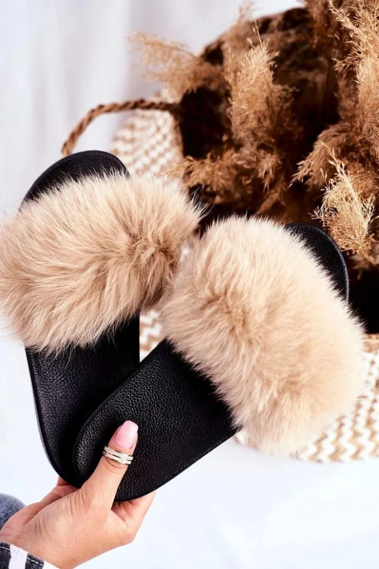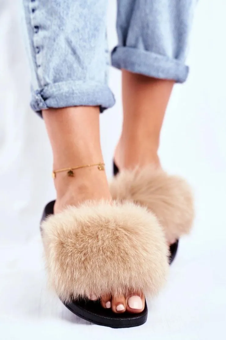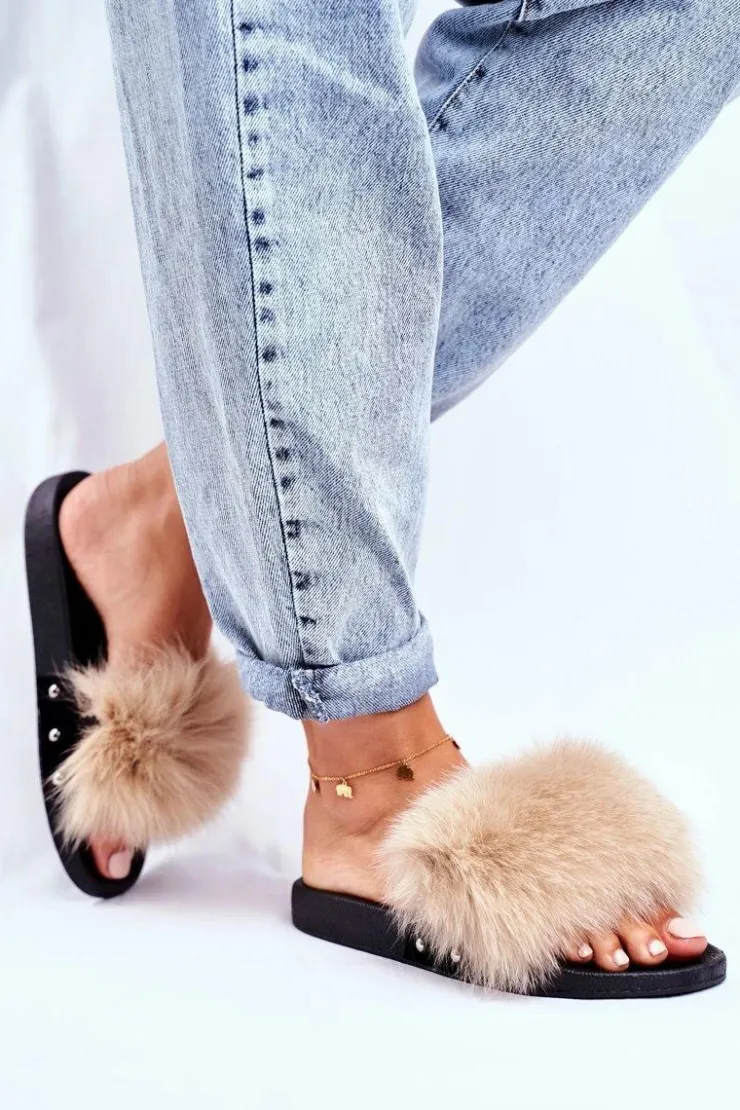 Boto Klapki Z Futerkiem|Klapki Damskie Klasyczne*Klapki Damskie z Naturalnym Futerkiem Beżowe Bushido