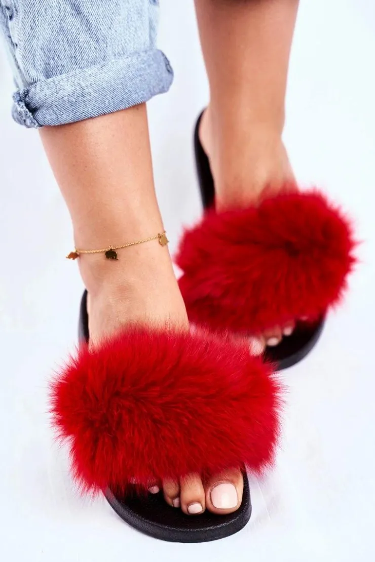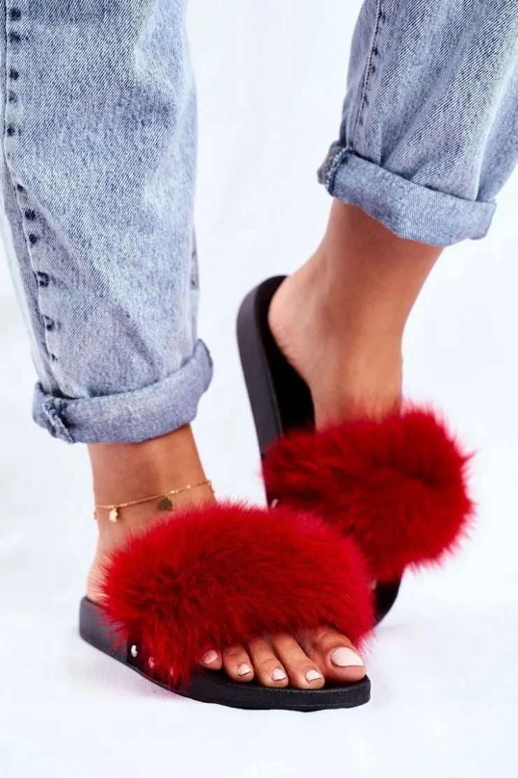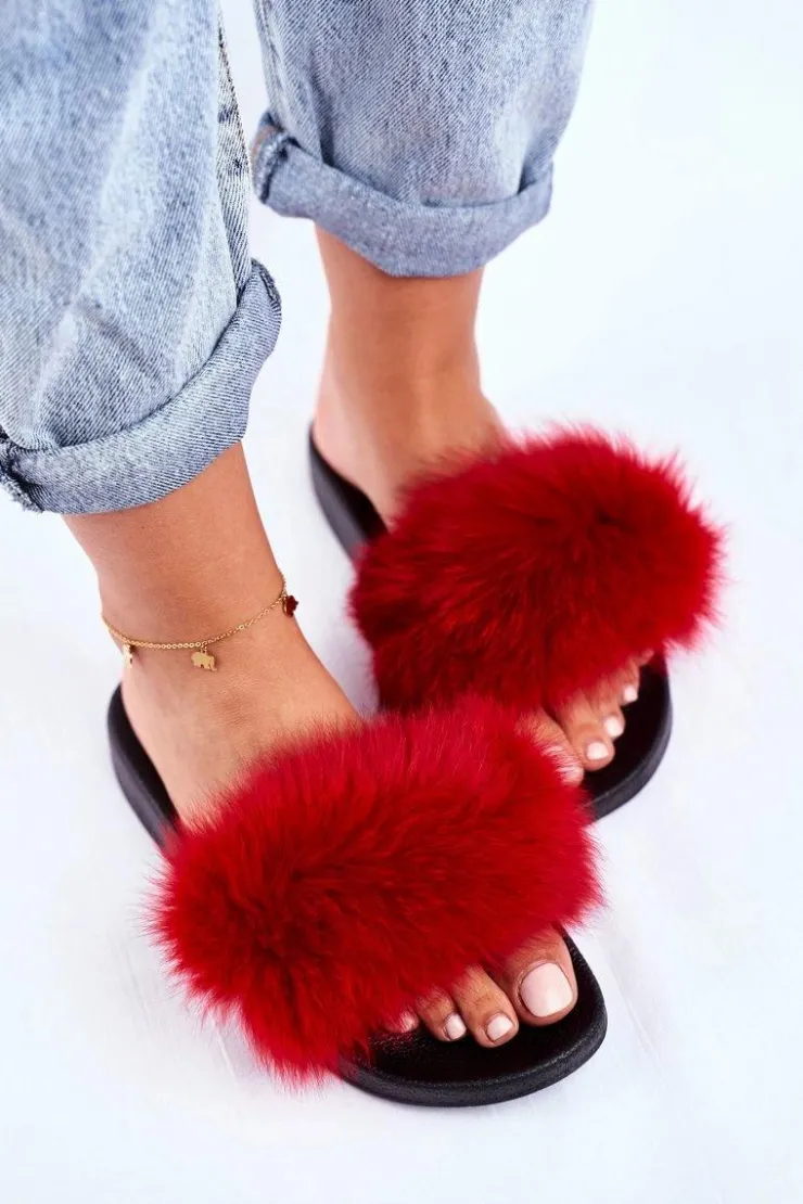 Boto Klapki Z Futerkiem|Klapki Damskie Klasyczne*Klapki Damskie z Naturalnym Futerkiem Czerwone Bushido