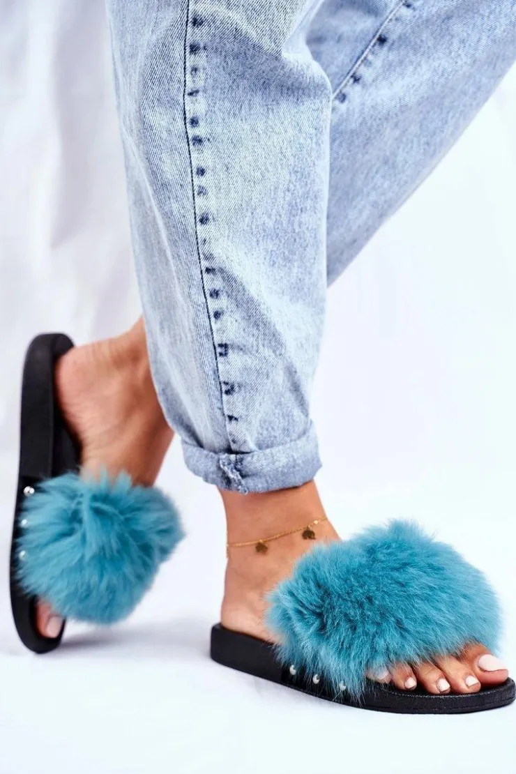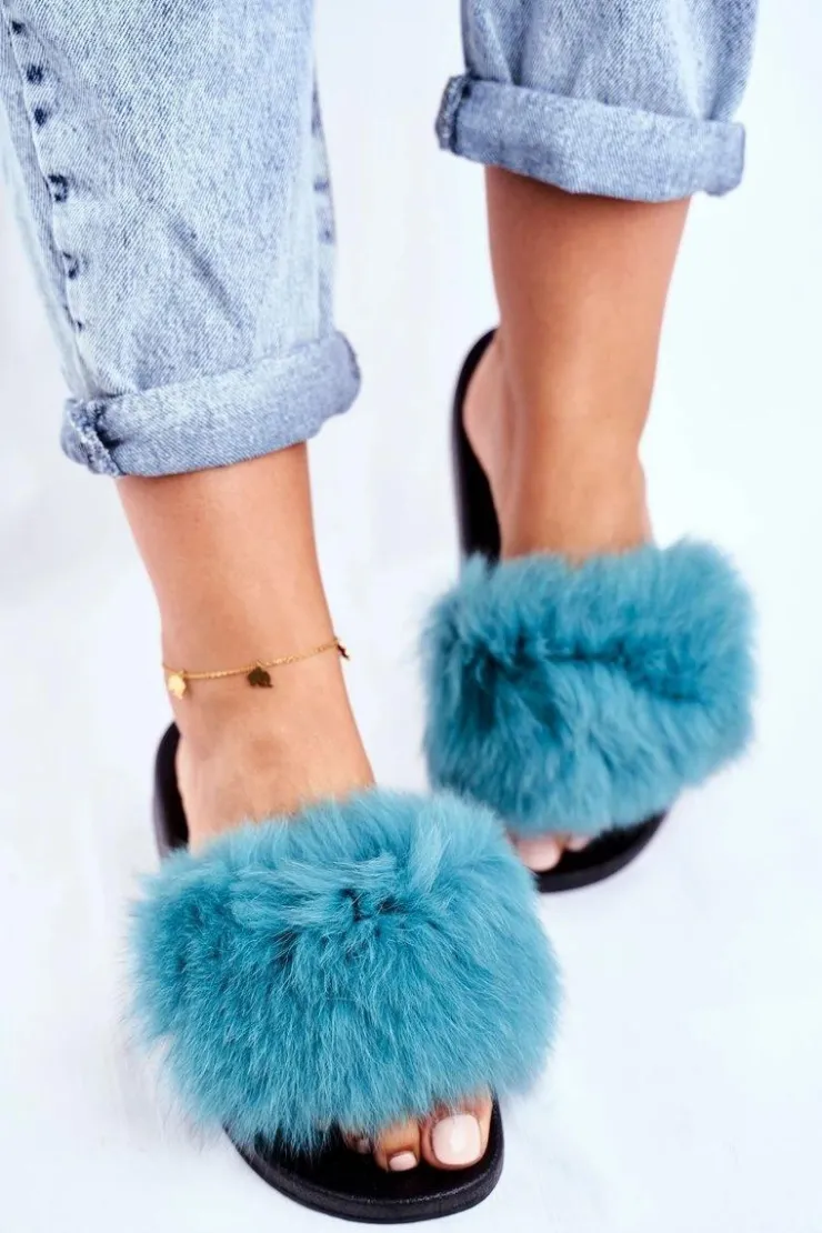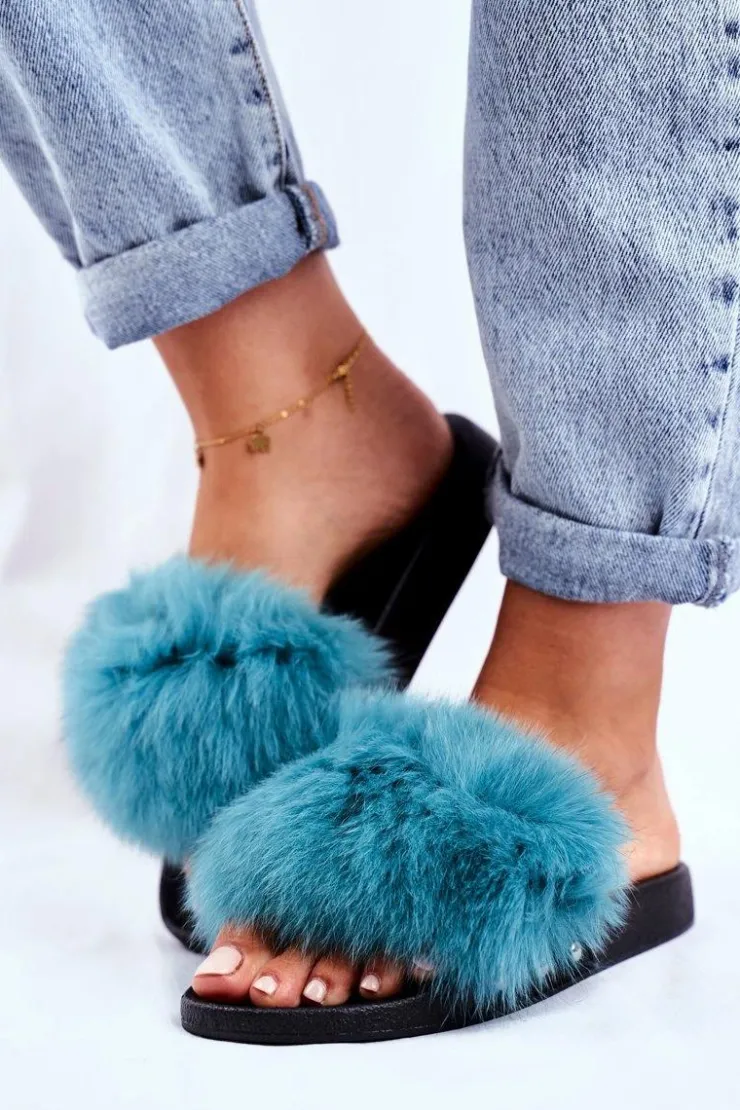 Boto Klapki Z Futerkiem|Klapki Damskie Klasyczne*Klapki Damskie z Naturalnym Futerkiem Zielone Bushido