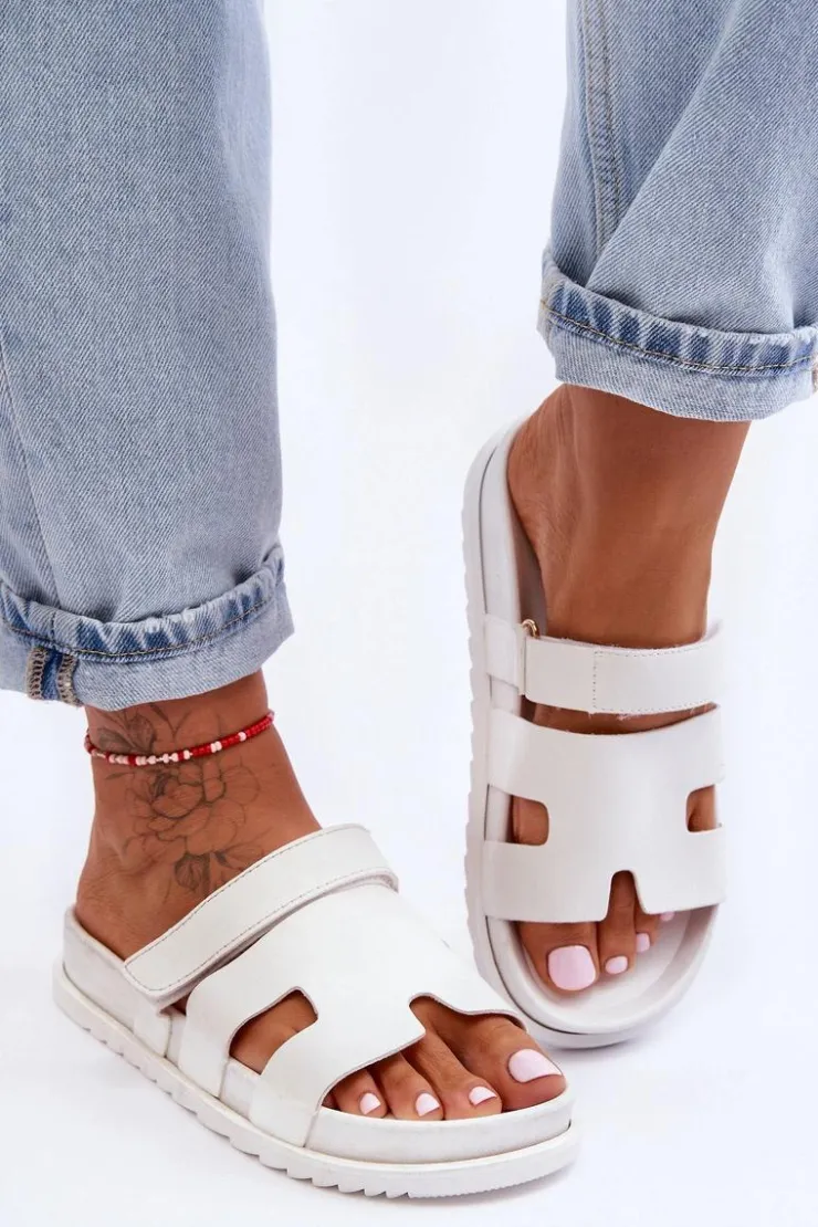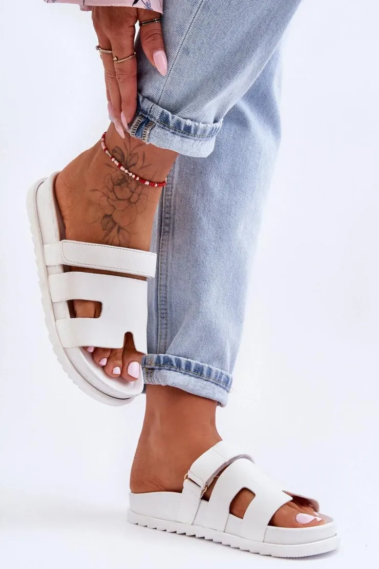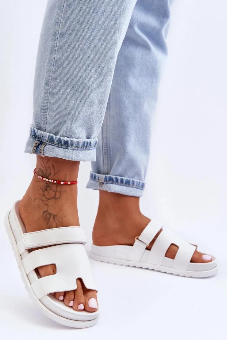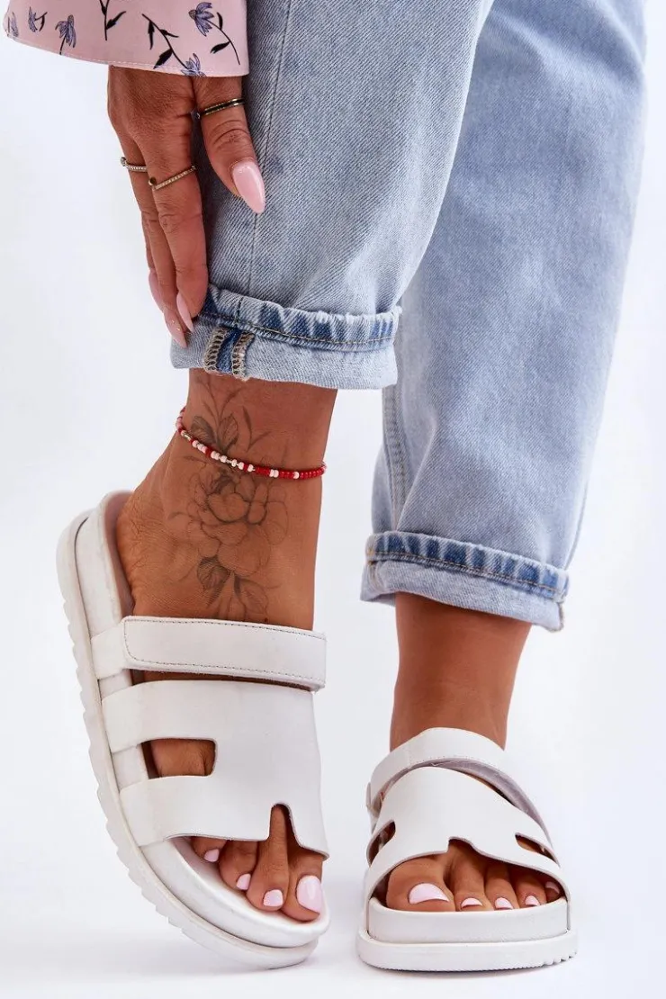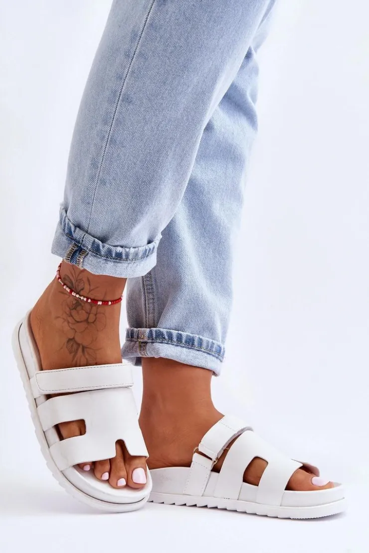 Klasyczne klapki damskie na lekkiej platformie zostały wzbogacone zapięciem na rzep, dzięki któremu obuwie można dopasować do tęgości nogi. Dobrze wyprofilowana wkładka zapewni komfort podczas użytkowania. Klapki te o ciekawym fasonie z pewnością sprawdzą się w wielu stylizacjach! Zostały wykonane z eko skóry. Przy wyborze rozmiaru prosimy sugerować się tabelą rozmiarów.