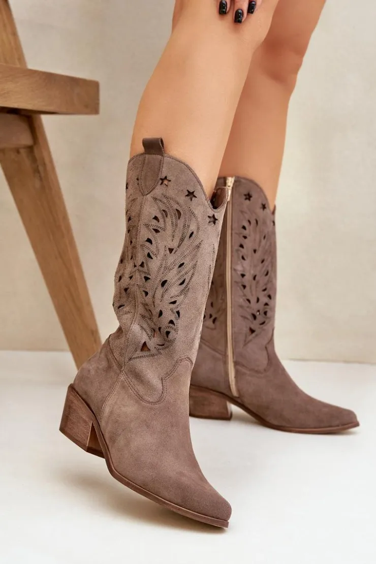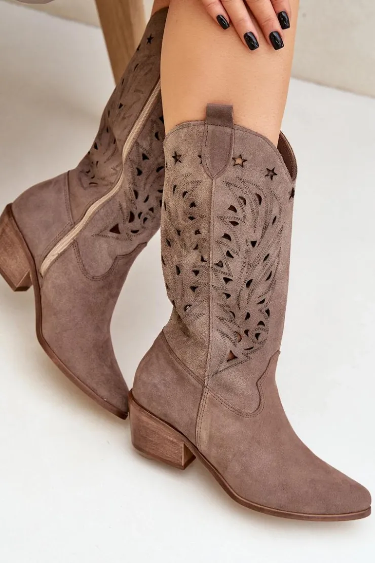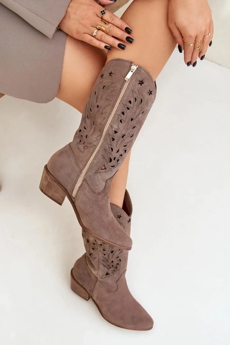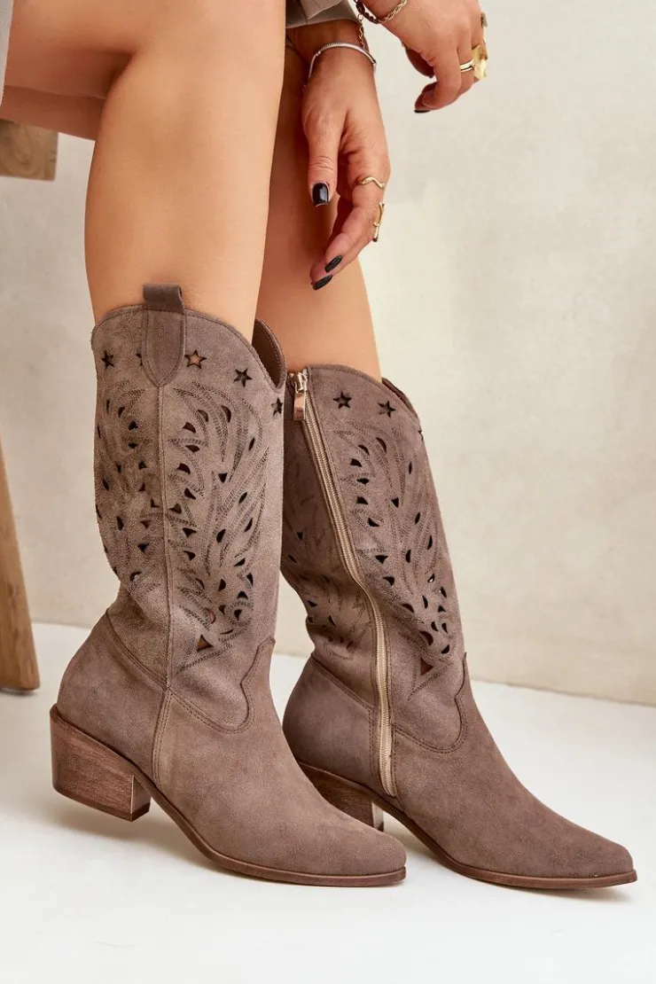 Kozaki do połowy łydki z ażurową cholewką. Zapinane na zamek. Wykonane z wysokiej jakości naturalnego zamszu. Noski w szpic. Te kozaki doskonale sprawdzą się w wielu codziennych stylizacjach. Miękka, skórzana wkładka gwarantuje komfort podczas noszenia. Ażurowe kozaki to doskonały wybór do różnych wiosennych stylizacji! Przy wyborze rozmiaru prosimy sugerować się tabelą rozmiarów.