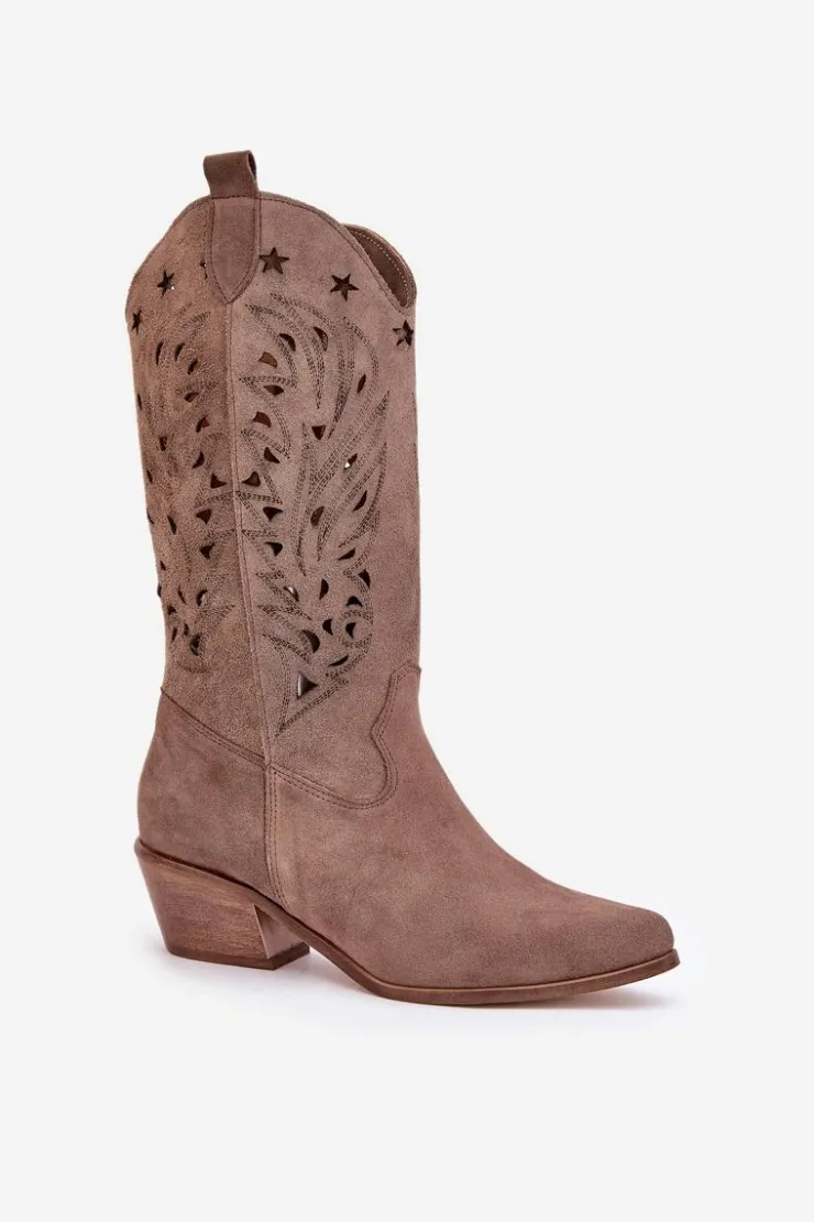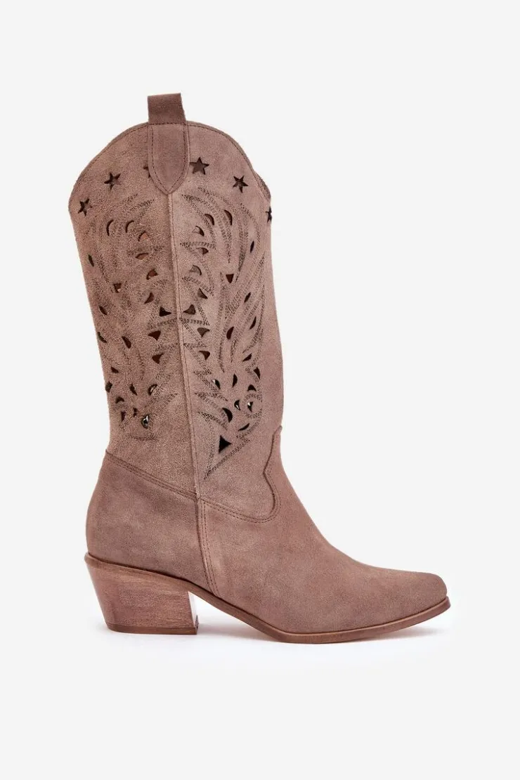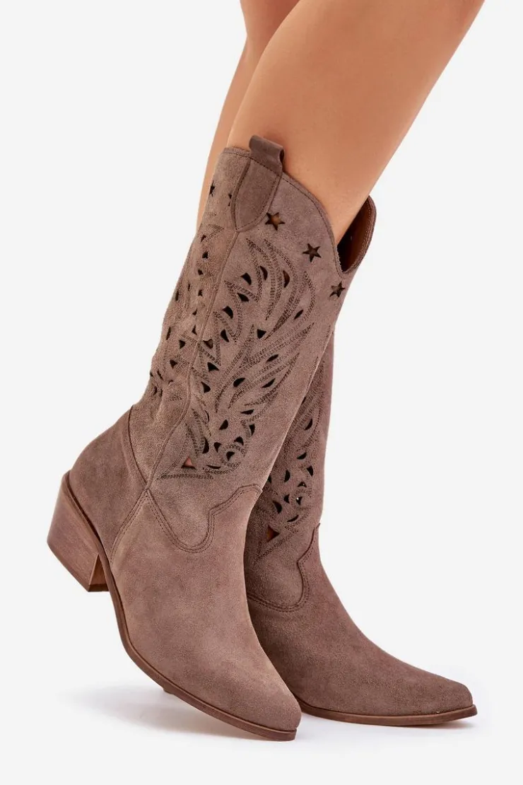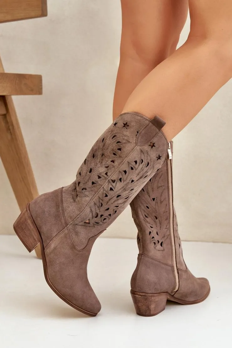 Kozaki do połowy łydki z ażurową cholewką. Zapinane na zamek. Wykonane z wysokiej jakości naturalnego zamszu. Noski w szpic. Te kozaki doskonale sprawdzą się w wielu codziennych stylizacjach. Miękka, skórzana wkładka gwarantuje komfort podczas noszenia. Ażurowe kozaki to doskonały wybór do różnych wiosennych stylizacji! Przy wyborze rozmiaru prosimy sugerować się tabelą rozmiarów.