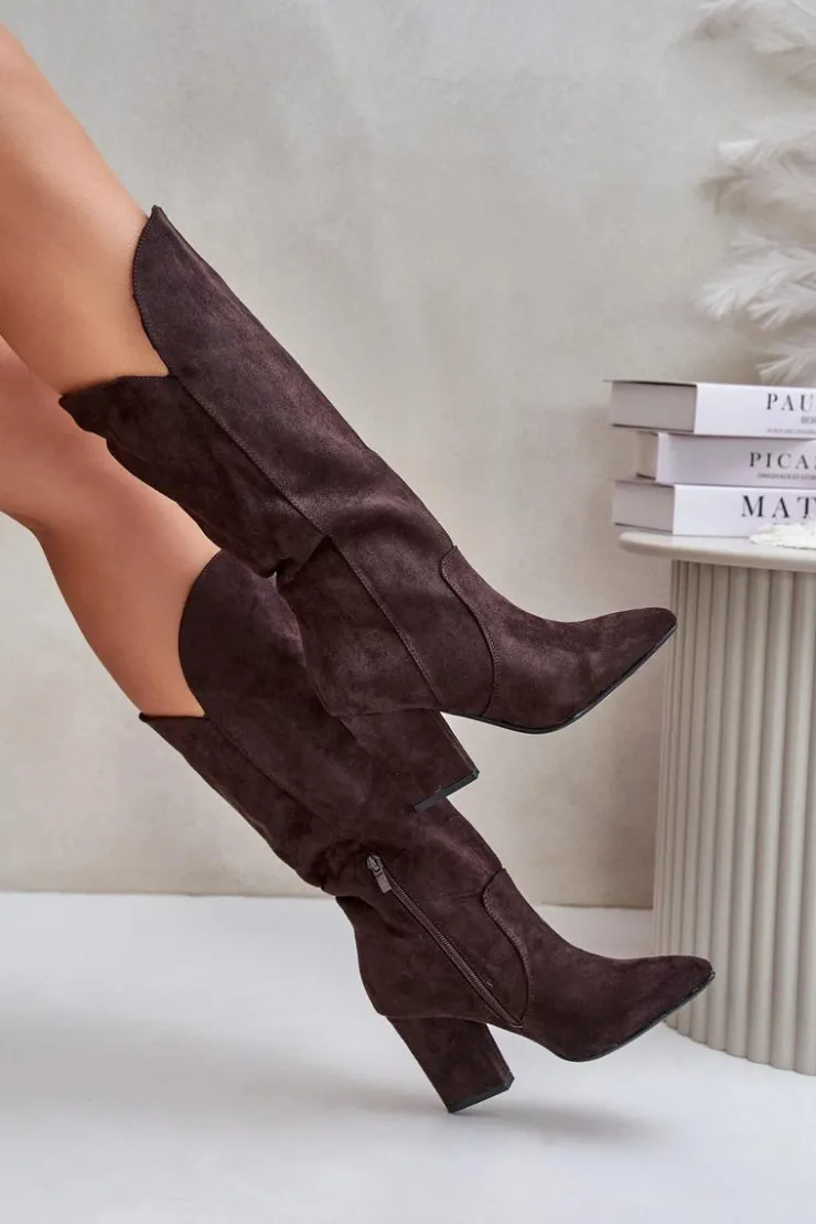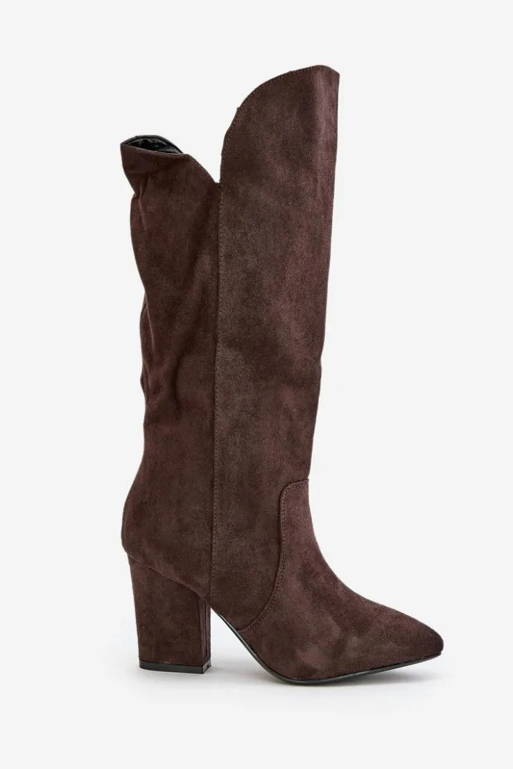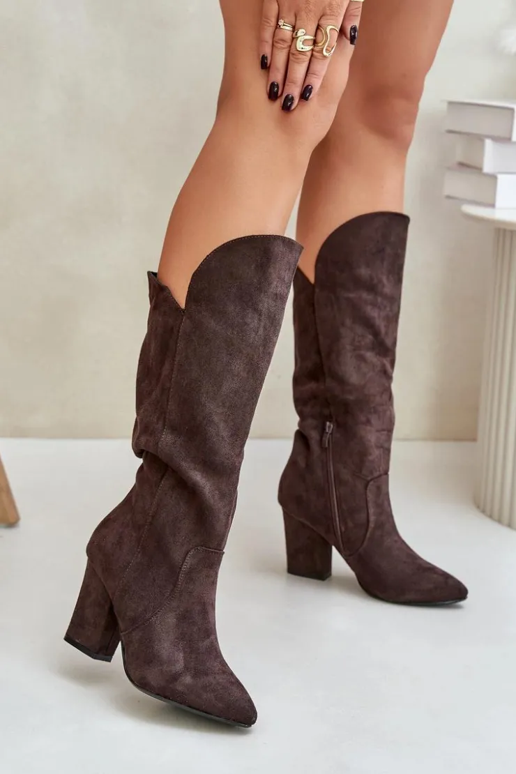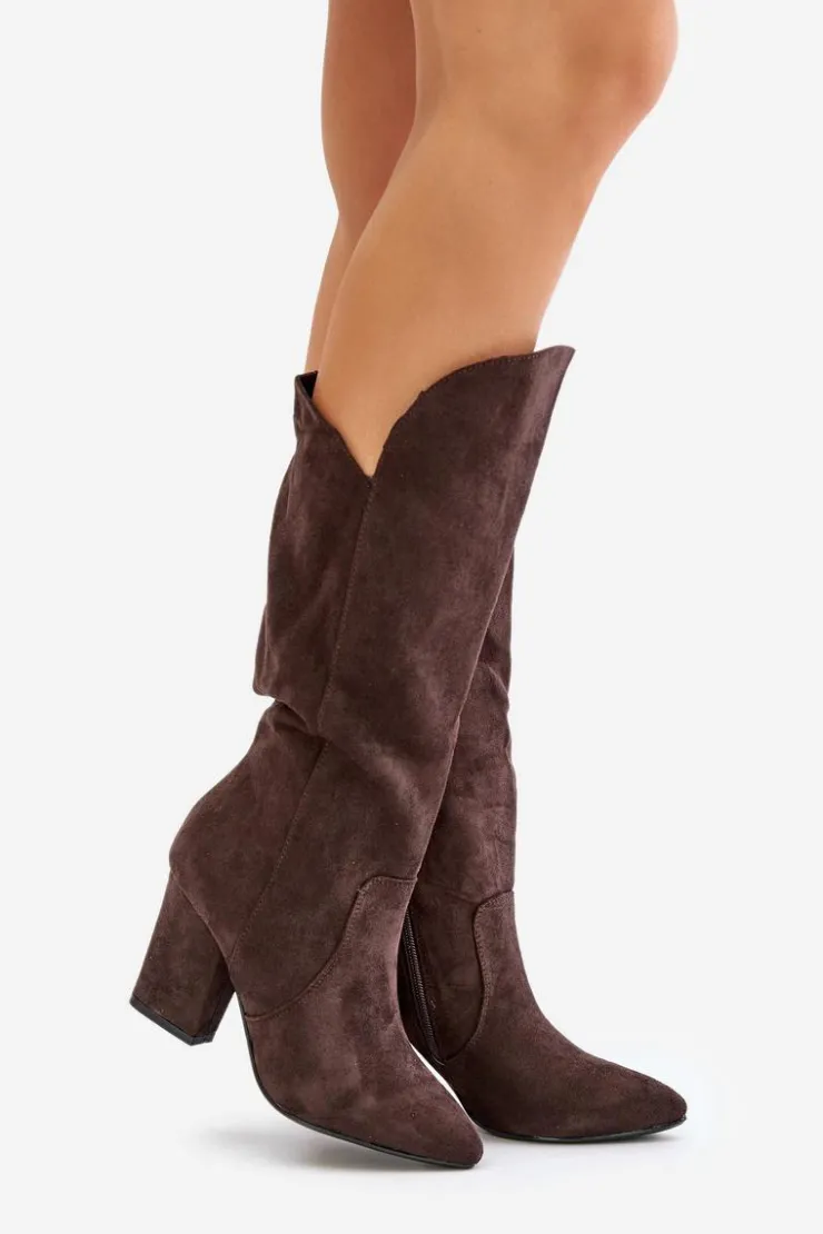 Kozaki z eko zamszu na obcasie typu słupek to elegancka propozycja na chłodniejsze dni. Wsuwane, z dodatkowym zapięciem na zamek, zapewniają wygodę i doskonałe dopasowanie do nogi. Idealne do stylizacji zarówno na co dzień, jak i na bardziej formalne okazje. Przy wyborze rozmiaru prosimy sugerować się tabelą rozmiarów.