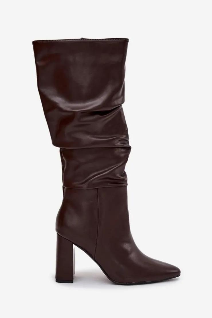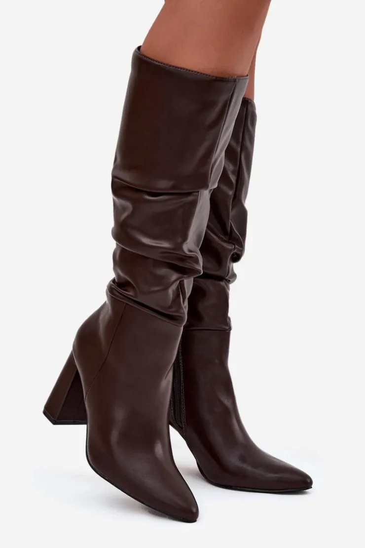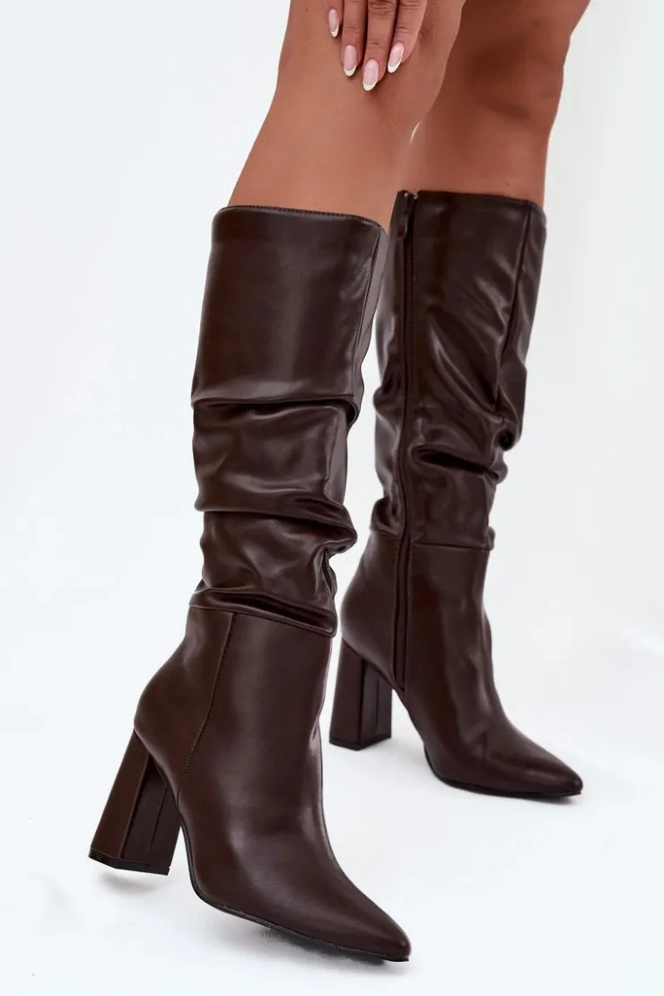 Kozaki damskie wykonane z eko skóry. Stabilny obcas typu słupek zapewnia komfort chodzenia, a noski w kształcie migdała dodają klasycznego charakteru. Marszczona cholewka nadaje modnego i niebanalnego wyglądu, dzięki czemu świetnie wyróżniają się w stylizacji. Kozaki zapinane są na praktyczny zamek, co ułatwia ich zakładanie i zdejmowanie. Idealne zarówno do spodni, jak i sukienek – sprawdzą się w wielu codziennych oraz eleganckich outfitach. Przy wyborze rozmiaru prosimy sugerować się tabelą rozmiarów.