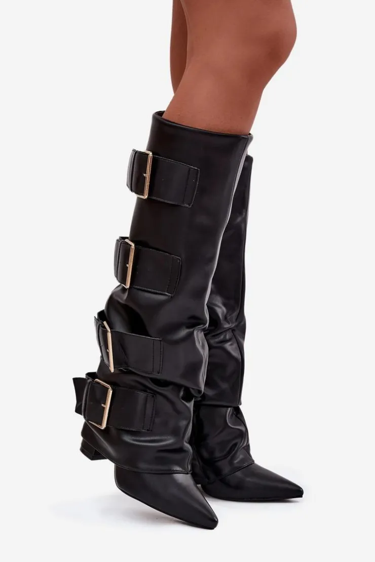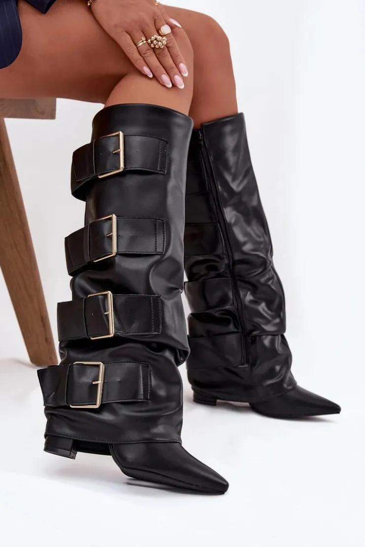 Stylowe kozaki damskie z eko skóry to połączenie elegancji i nowoczesnego wyglądu. Osadzone na obcasie typu słupek, ze szpiczastymi noskami, podkreślają kobiecą sylwetkę. Wywinięta cholewka, ozdobiona złotymi klamrami, przyciąga wzrok i dodaje charakteru, a zamek ułatwia szybkie zakładanie i zdejmowanie. Doskonale komponują się z sukienkami i spódnicami, wprowadzając modny, wyrafinowany akcent do każdej stylizacji. Przy wyborze rozmiaru prosimy sugerować się tabelą rozmiarów.