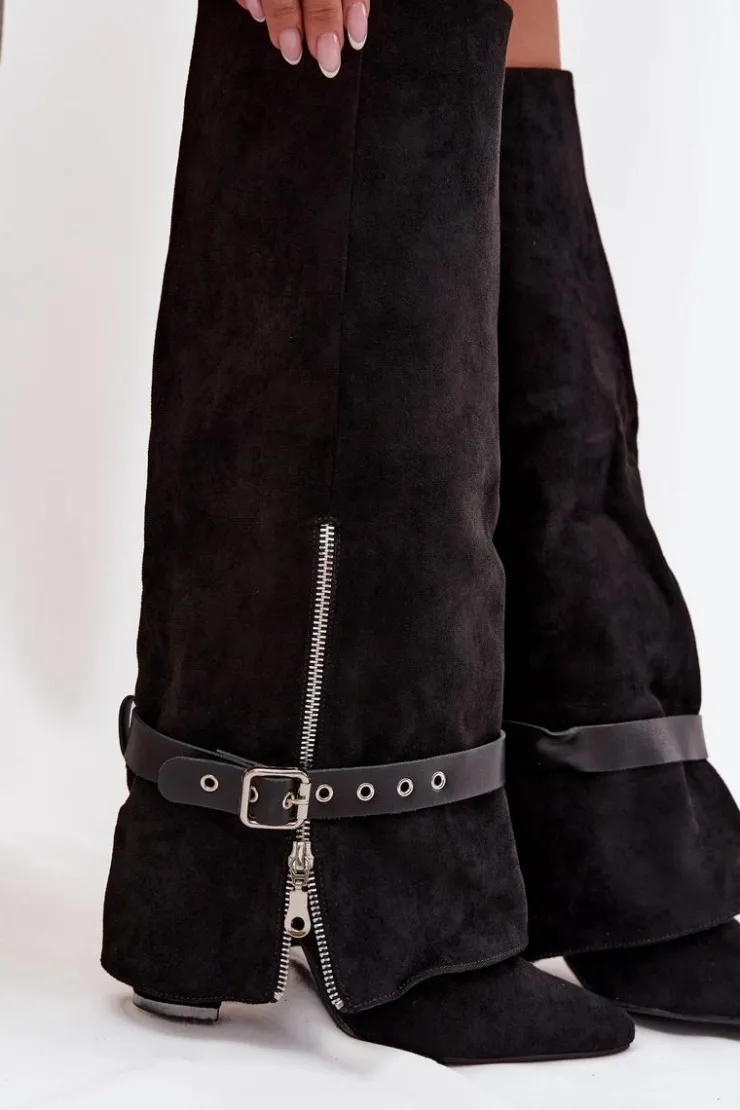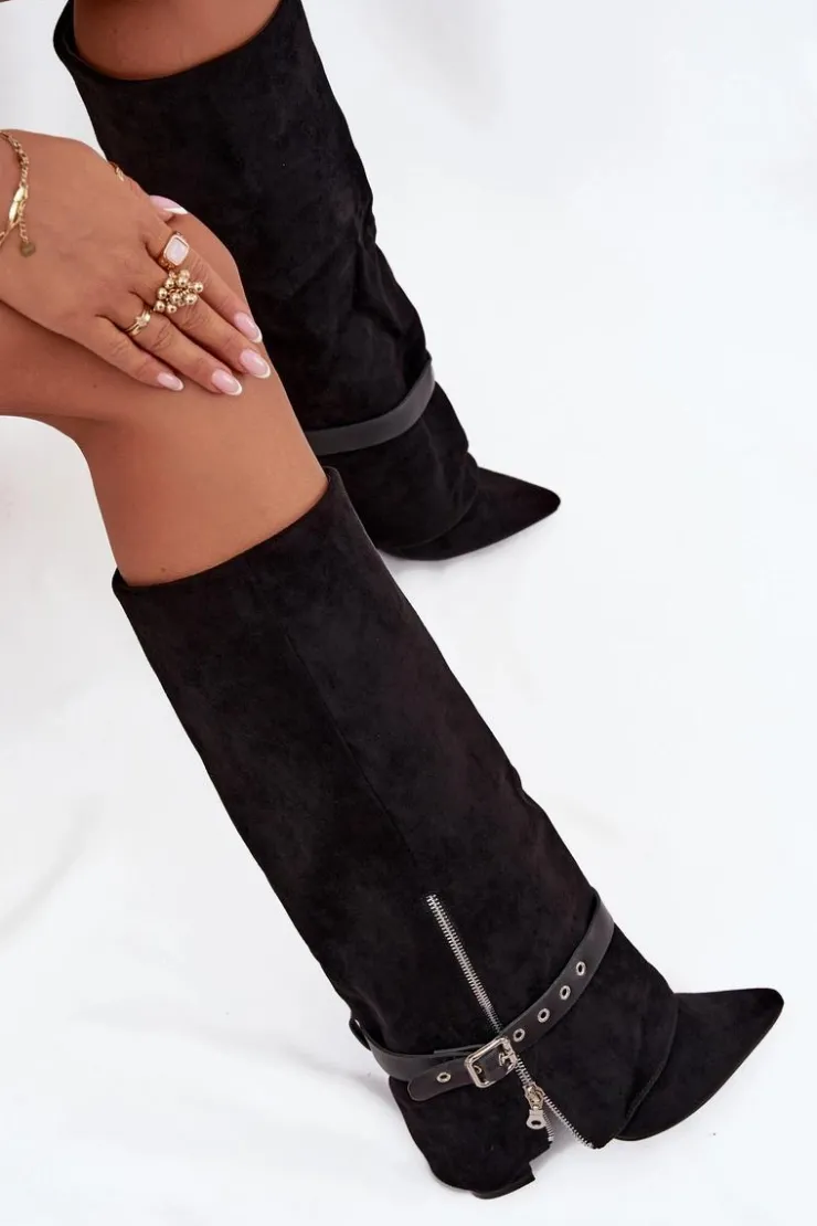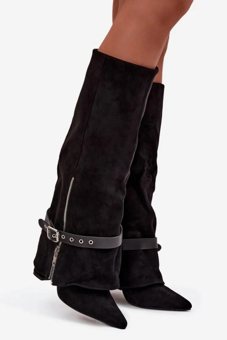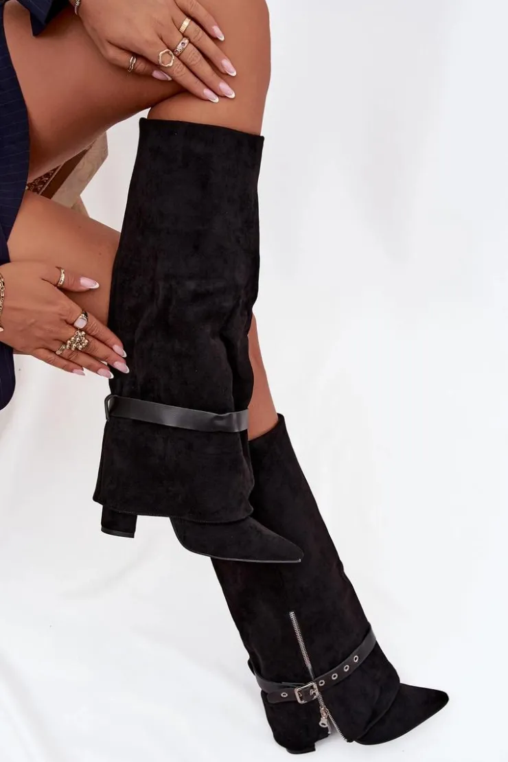 Wsuwane kozaki damskie przed kolano to elegancka i stylowa propozycja, która łączy klasykę z nowoczesnym akcentem. Model ze szpiczastymi noskami i obcasem typu słupek subtelnie wysmukla sylwetkę, a cholewka nachodząca na obcas nadaje całości wyjątkowego charakteru. Dodatkowy pasek z ozdobną klamrą można ściągnąć lub dowolnie ustawić, zmieniając styl butów i dopasowując je do różnych stylizacji. Idealne do sukienek, spódnic, jak i eleganckich zestawów casualowych, wprowadzają modny, kobiecy akcent do każdej garderoby. Przy wyborze rozmiaru prosimy sugerować się tabelą rozmiarów.