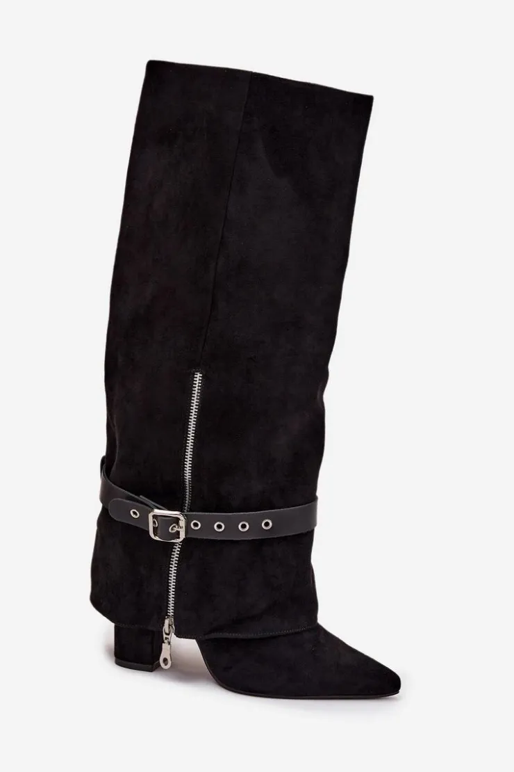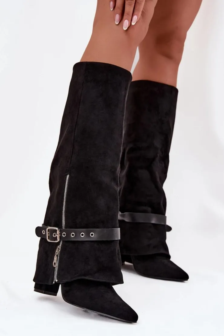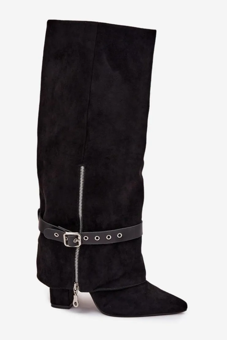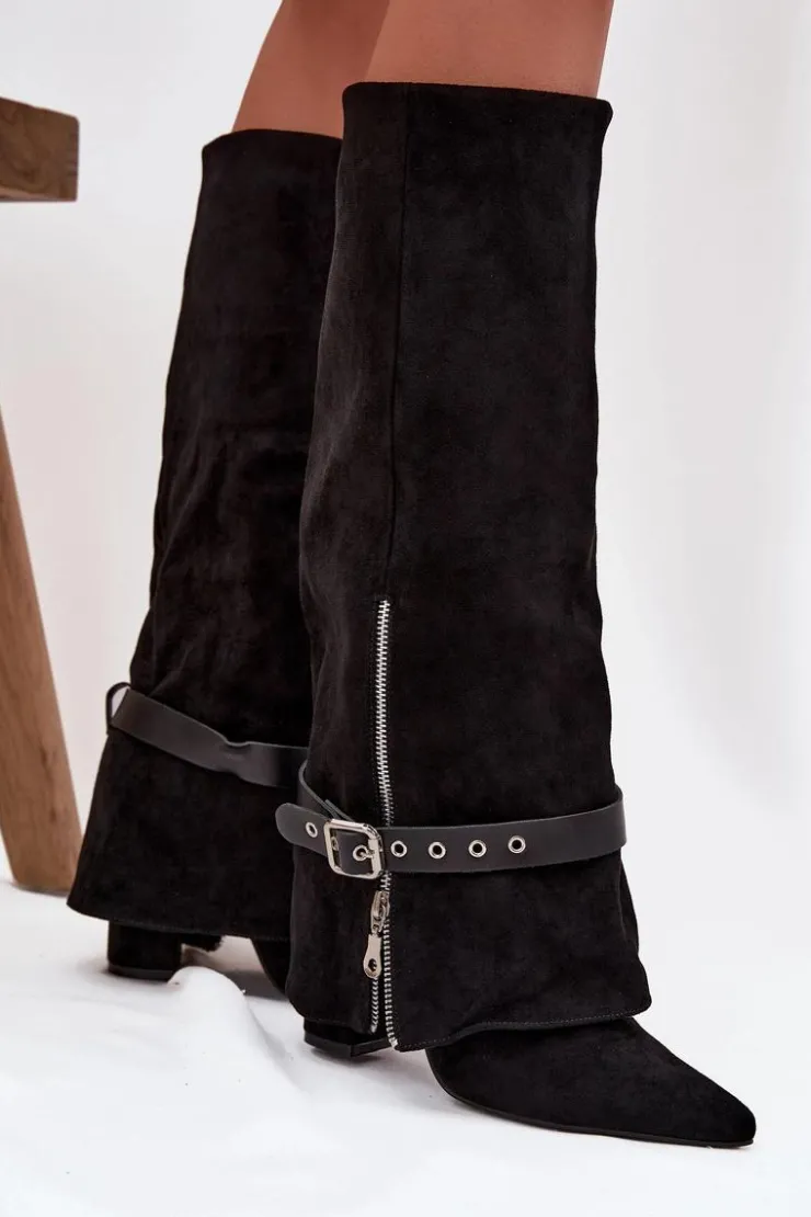 Wsuwane kozaki damskie przed kolano to elegancka i stylowa propozycja, która łączy klasykę z nowoczesnym akcentem. Model ze szpiczastymi noskami i obcasem typu słupek subtelnie wysmukla sylwetkę, a cholewka nachodząca na obcas nadaje całości wyjątkowego charakteru. Dodatkowy pasek z ozdobną klamrą można ściągnąć lub dowolnie ustawić, zmieniając styl butów i dopasowując je do różnych stylizacji. Idealne do sukienek, spódnic, jak i eleganckich zestawów casualowych, wprowadzają modny, kobiecy akcent do każdej garderoby. Przy wyborze rozmiaru prosimy sugerować się tabelą rozmiarów.