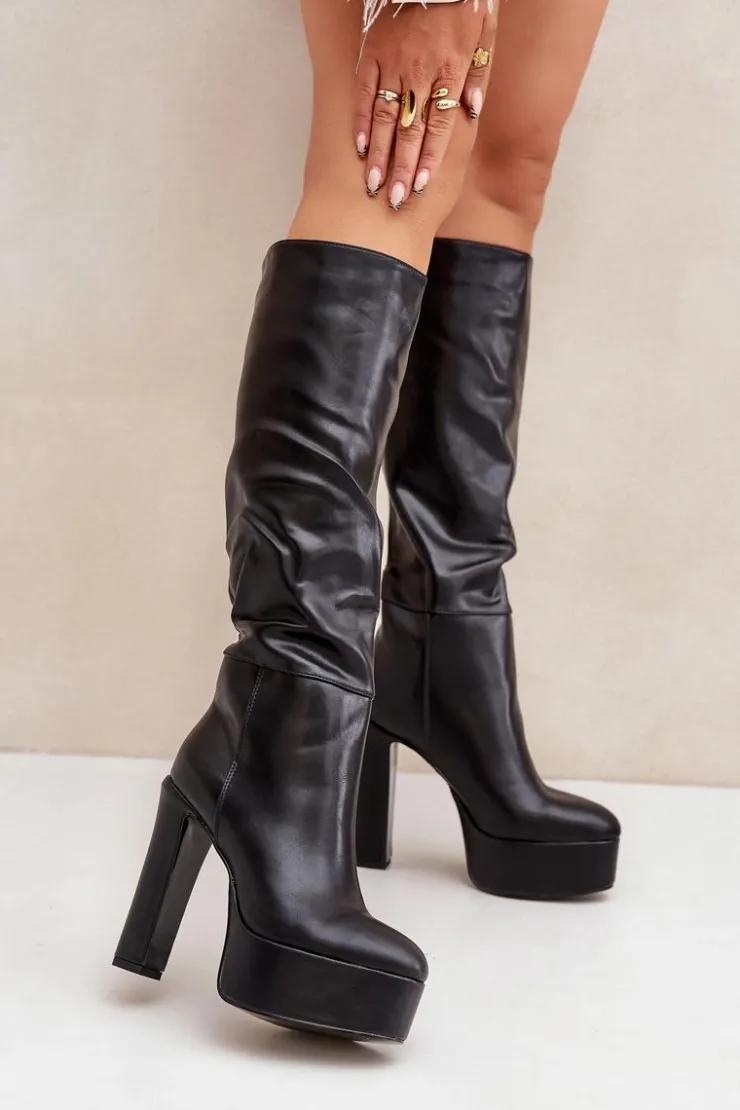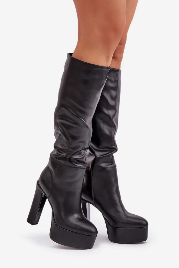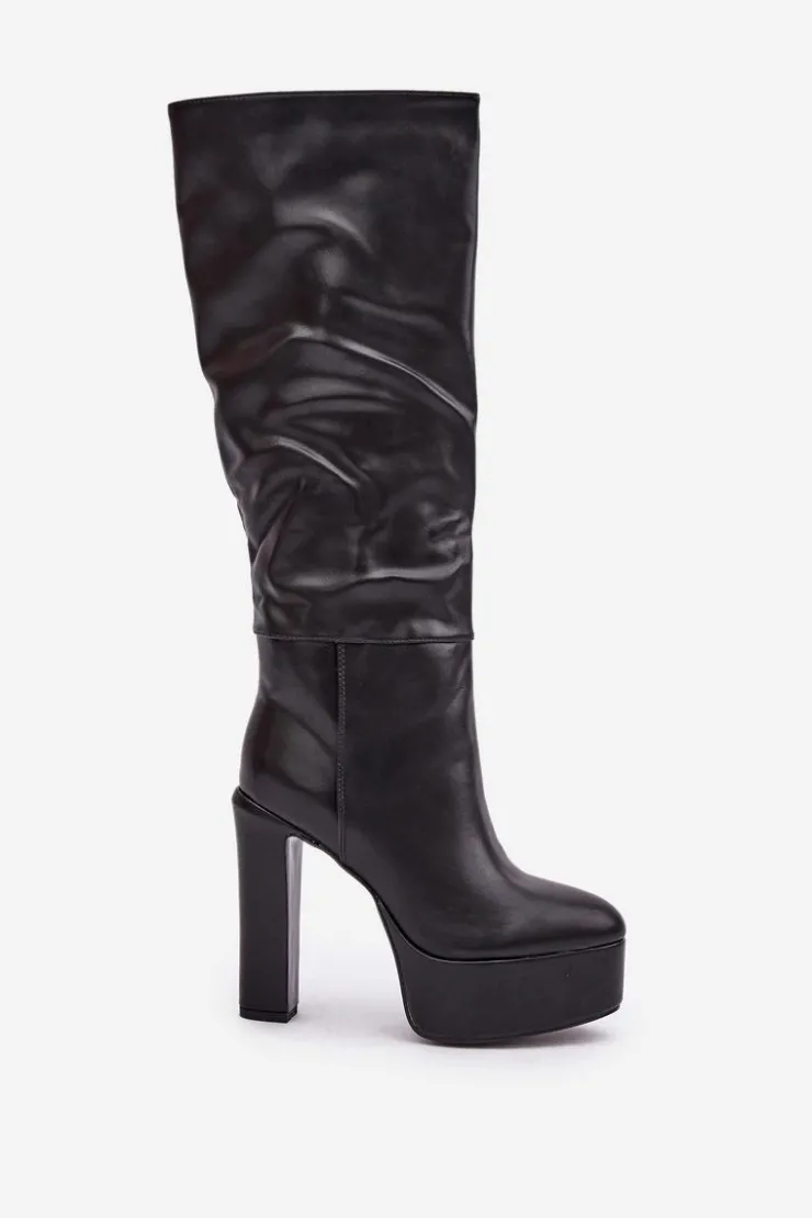 Wsuwane kozaki damskie wykonane z eko skóry. Osadzone na masywnej platformie i stabilnym obcasie typu słupek, łączą styl z komfortem. Wnętrze ocieplane kocem obuwniczym zapewnia ciepło w chłodne dni. Cholewka z delikatnym marszczeniem dodaje elegancji i subtelnego charakteru. Idealne do codziennych i bardziej stylowych zimowych stylizacji. Przy wyborze rozmiaru prosimy sugerować się tabelą rozmiarów.