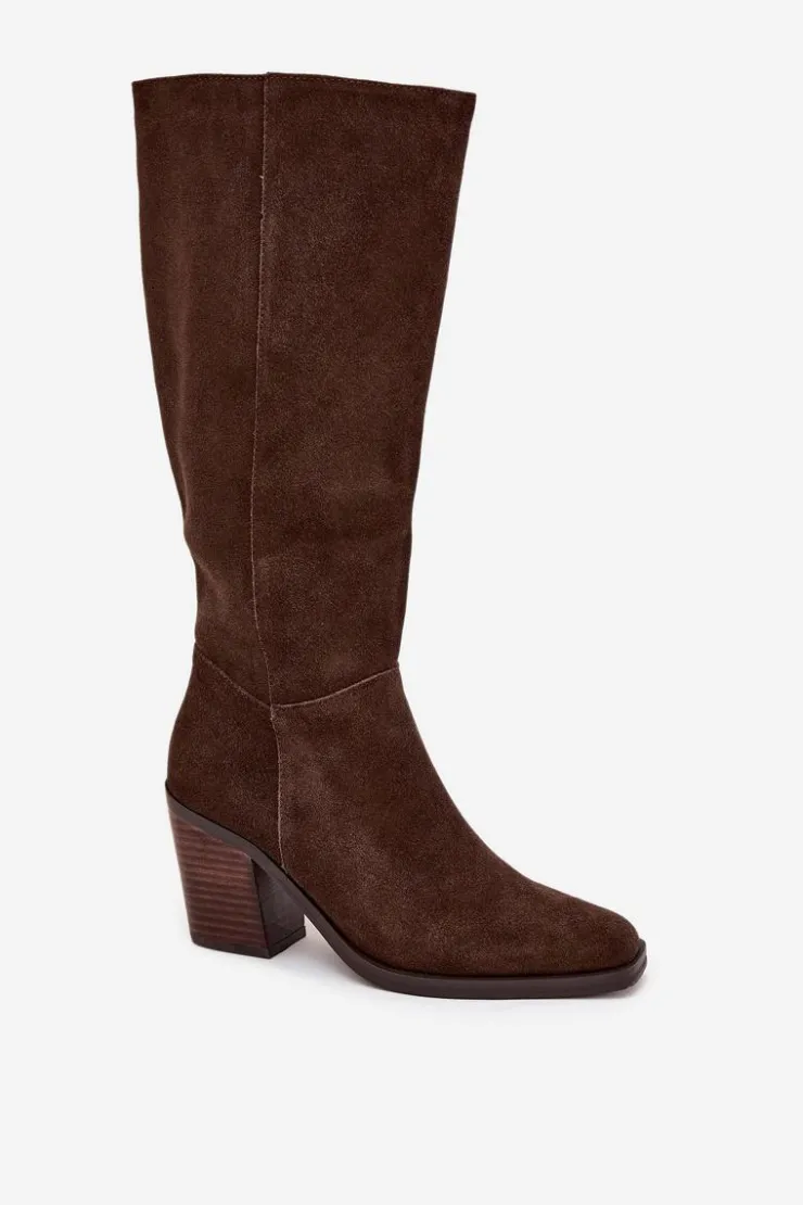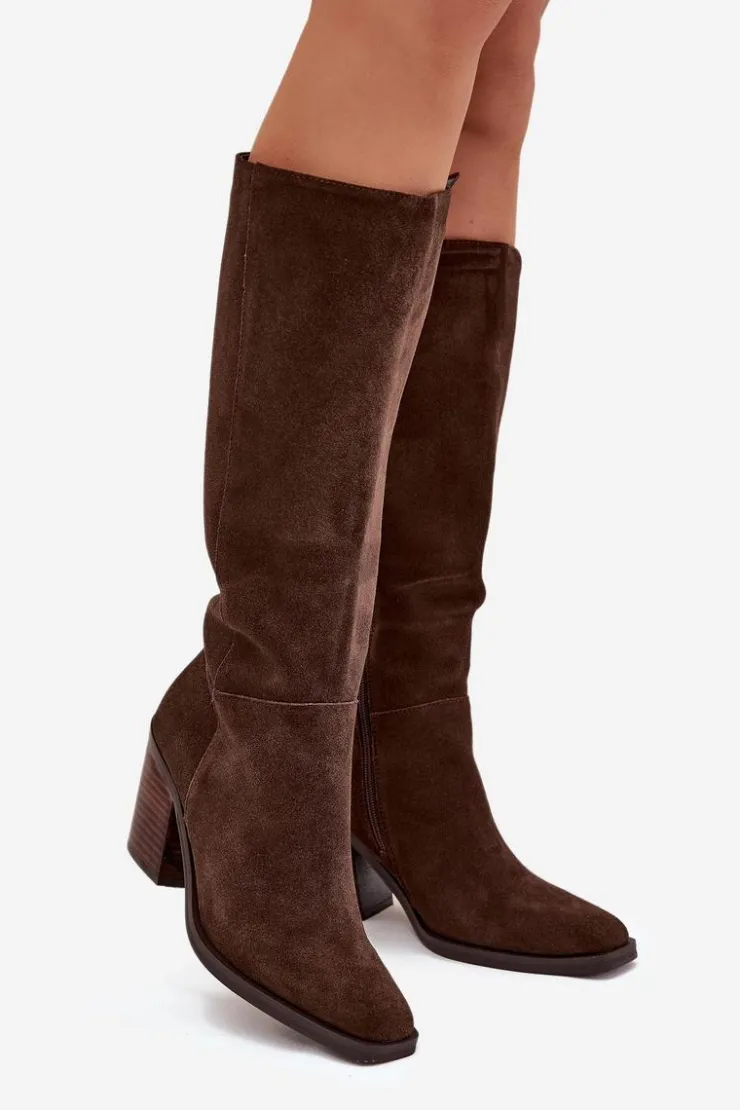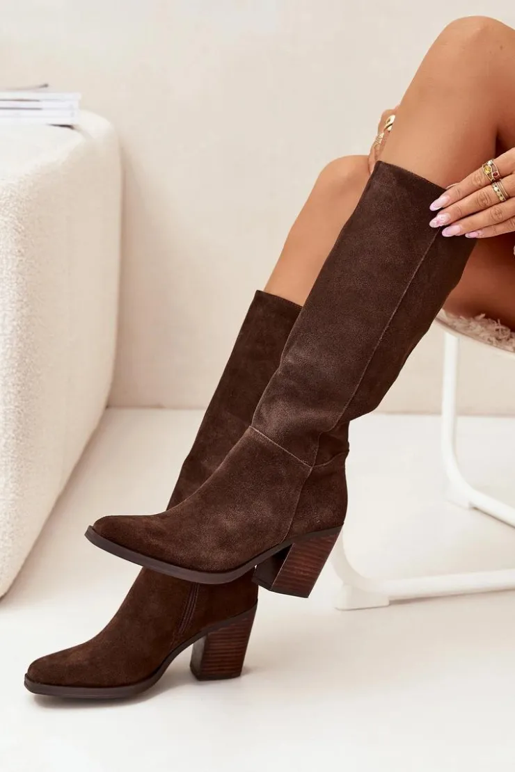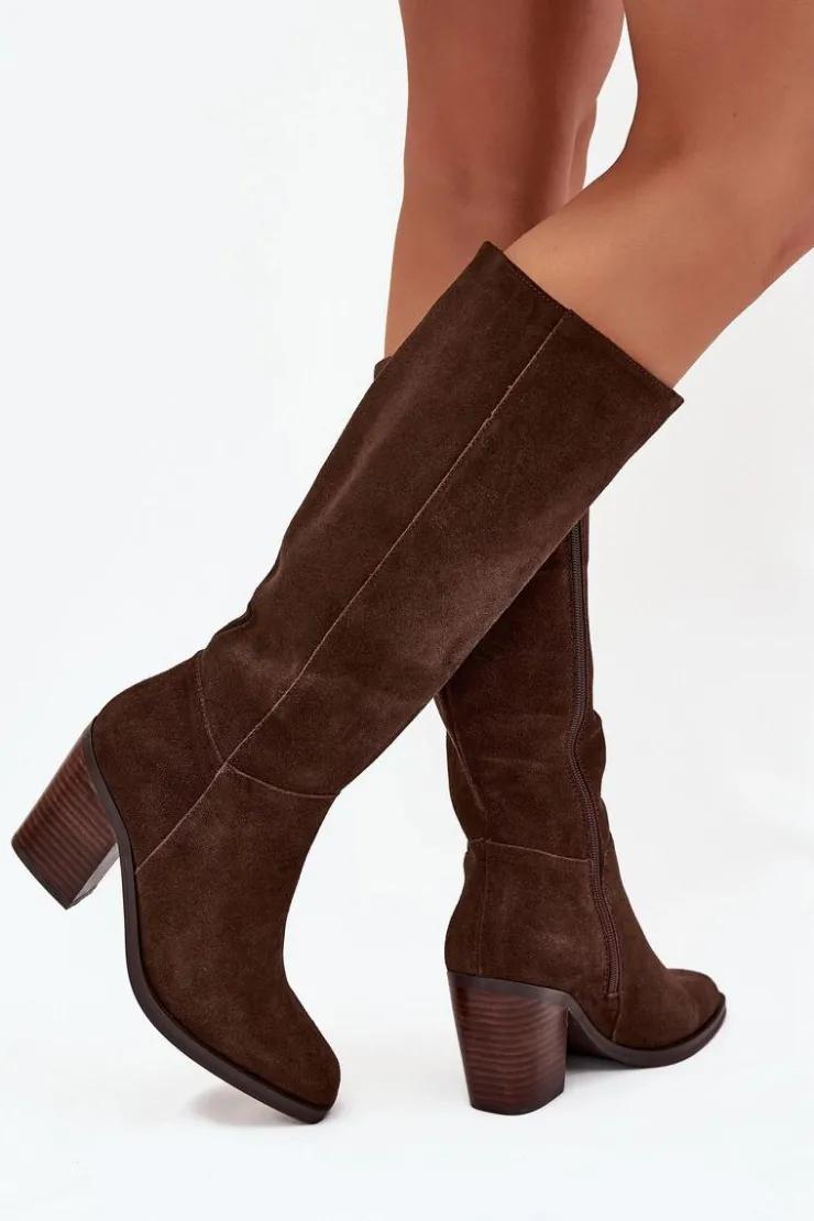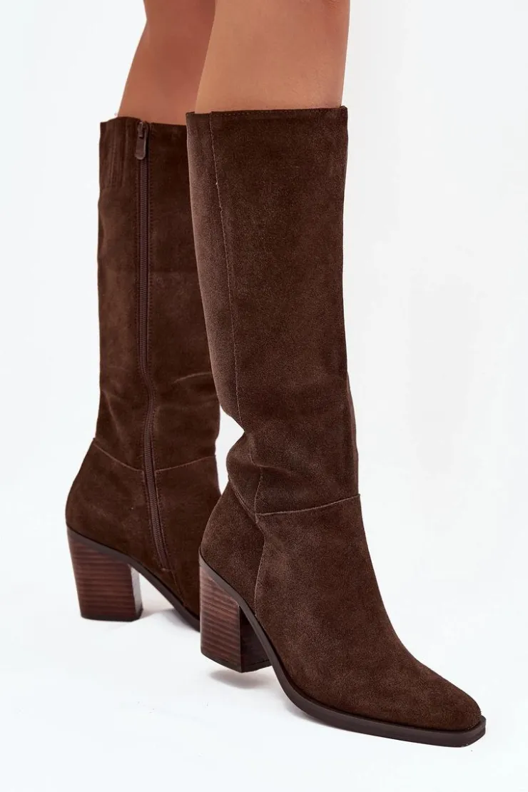 Zamszowe kozaki na słupku z zamkiem czekoladowe Lissara