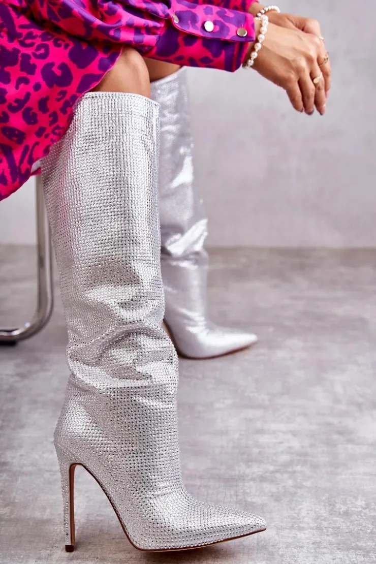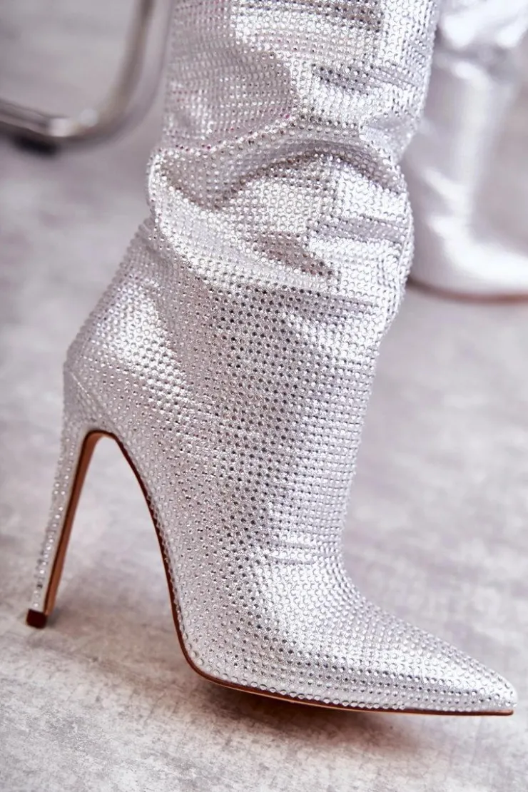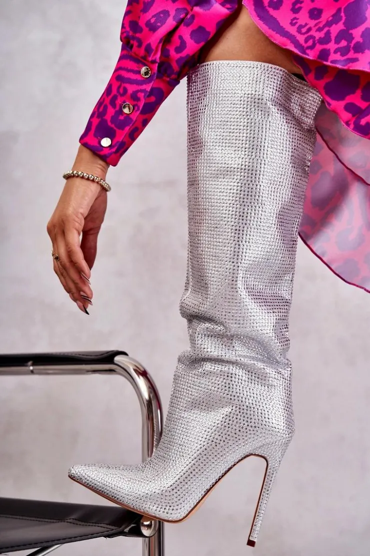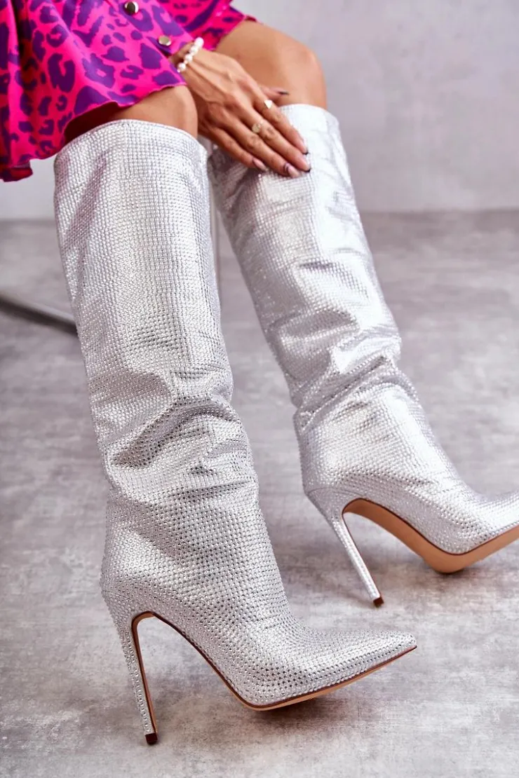 Rewelacyjne kozaki dla kobiet lubiących wyróżniać się spośród tłumu! Zostały wykonane z materiału. Ozdoby w postaci dżetów imitujących cyrkonie znajdują się na całości cholewki. Kozaki osadzono na obcasie w postaci szpilki. Ocieplane wewnątrz miłym w dotyku kocem obuwniczym. Usztywniany zapiętek zapewni odpowiednią stabilizację stopy. Przy wyborze rozmiaru prosimy sugerować się tabelą rozmiarów.