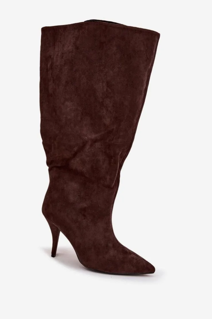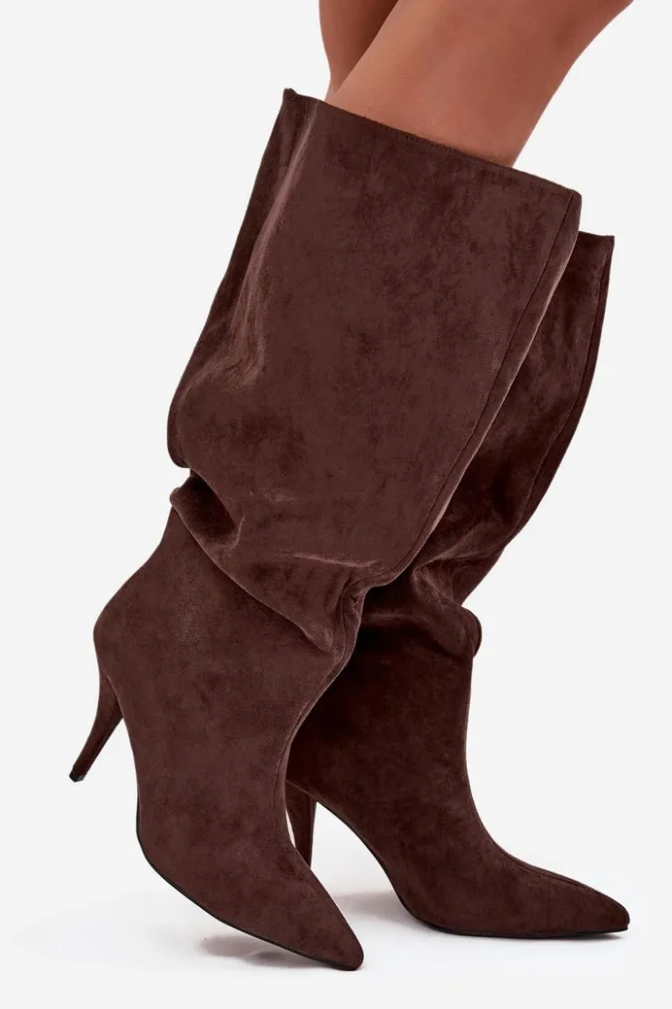 Stylowe kozaki damskie wykonane z miękkiego eko zamszu to doskonały wybór na chłodniejsze dni. Luźna cholewka nadaje im swobodnego, modnego charakteru, a przeszycie biegnące wzdłuż przodu subtelnie wysmukla nogę i dodaje całości elegancji. Model posiada smukły obcas typu szpilka, który pięknie podkreśla sylwetkę, oraz szpiczasty nosek. Idealnie komponują się zarówno z sukienkami i spódnicami, jak i obcisłymi spodniami typu skinny, tworząc kobiece i stylowe zestawy. Wybierz te kozaki, jeśli cenisz połączenie stylu i elegancji w jednym! Przy wyborze rozmiaru prosimy sugerować się tabelą rozmiarów.