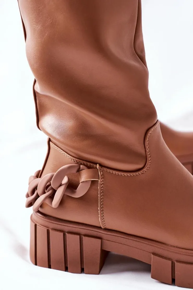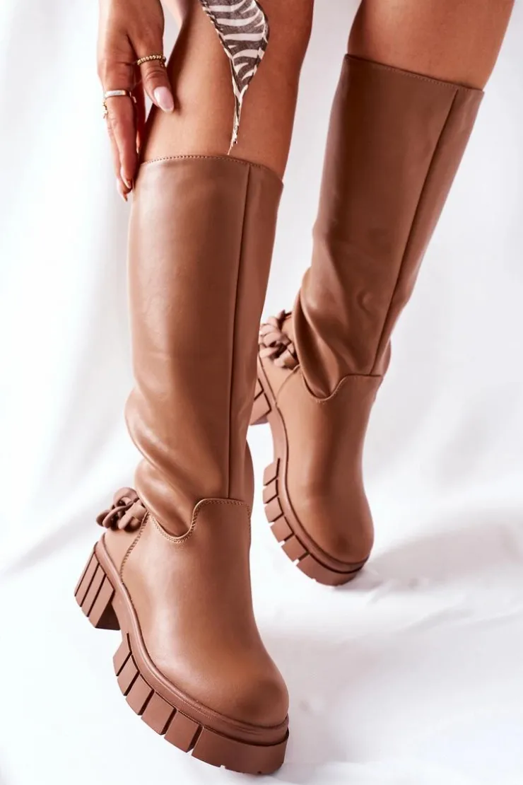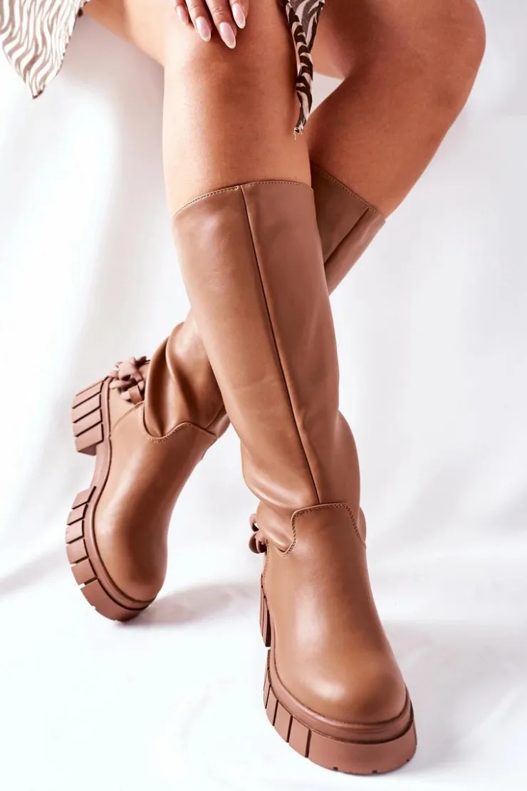 Kozaki za kolano wykonane z elastycznej tkaniny. Wnętrze ocieplone jest kocem obuwniczym.