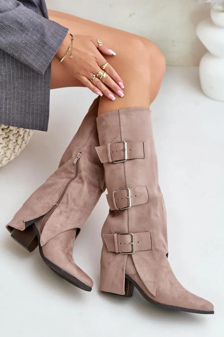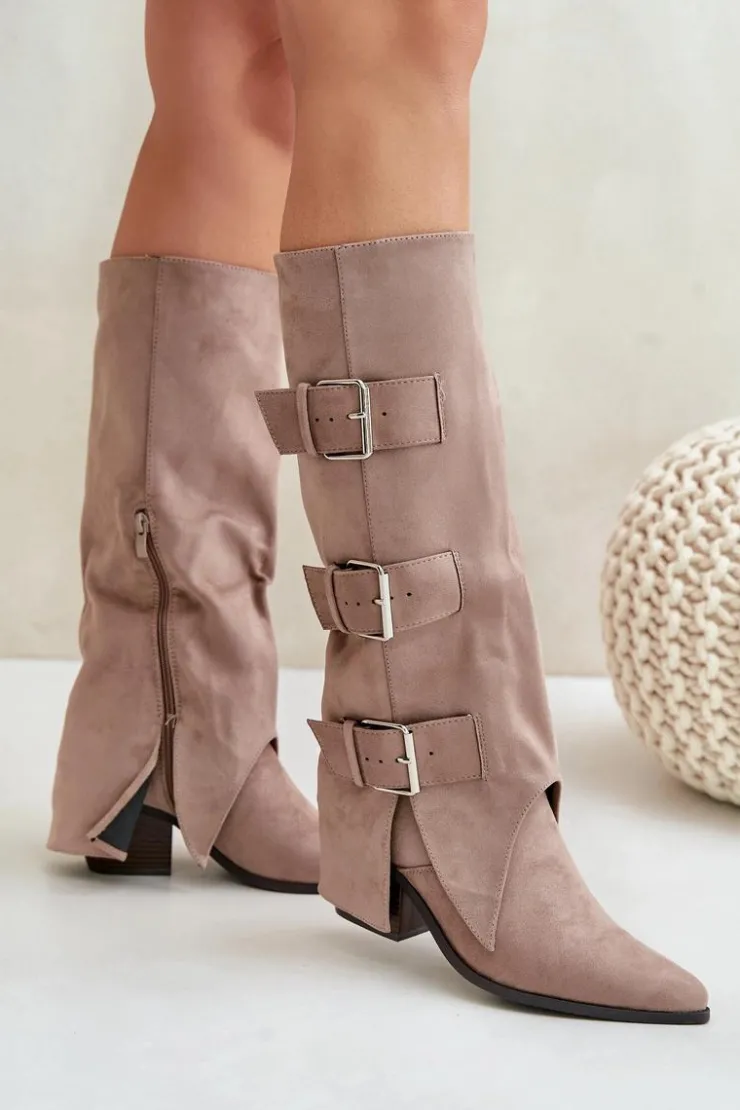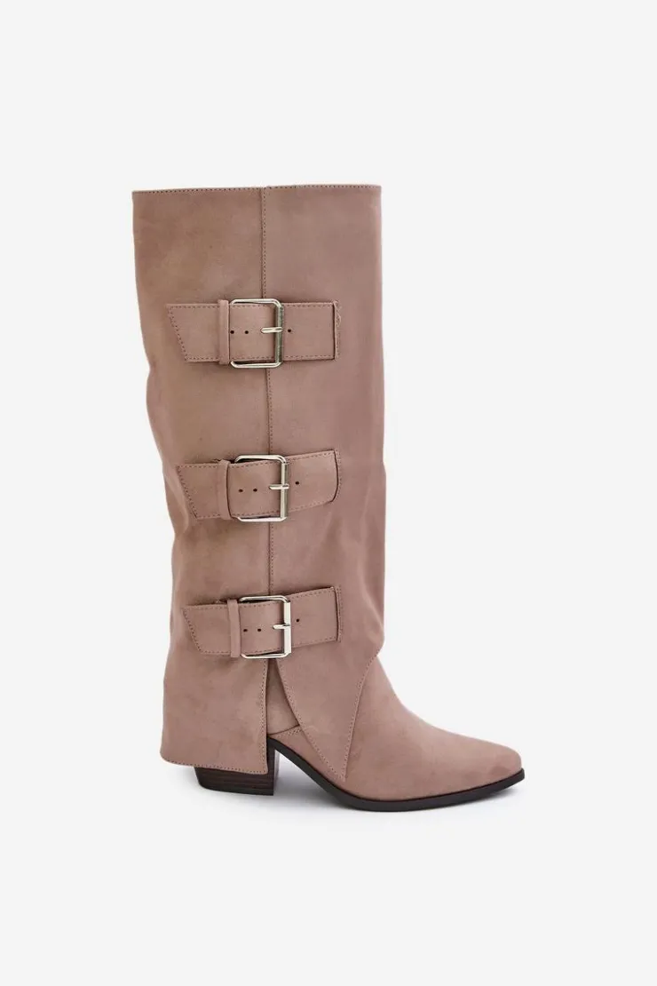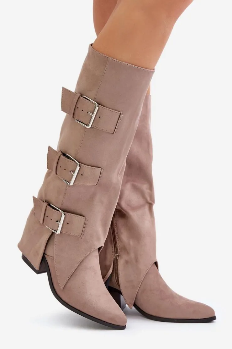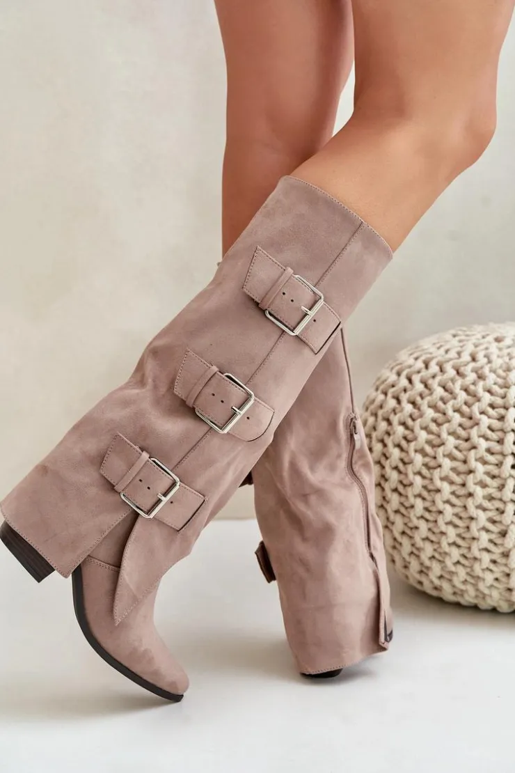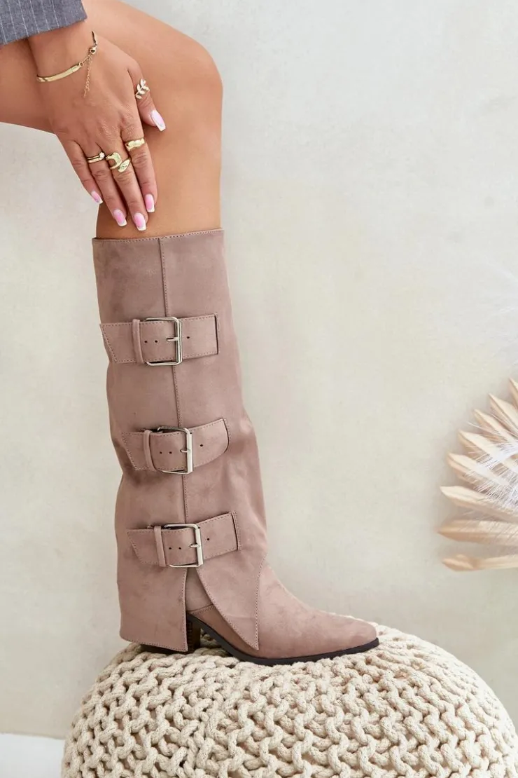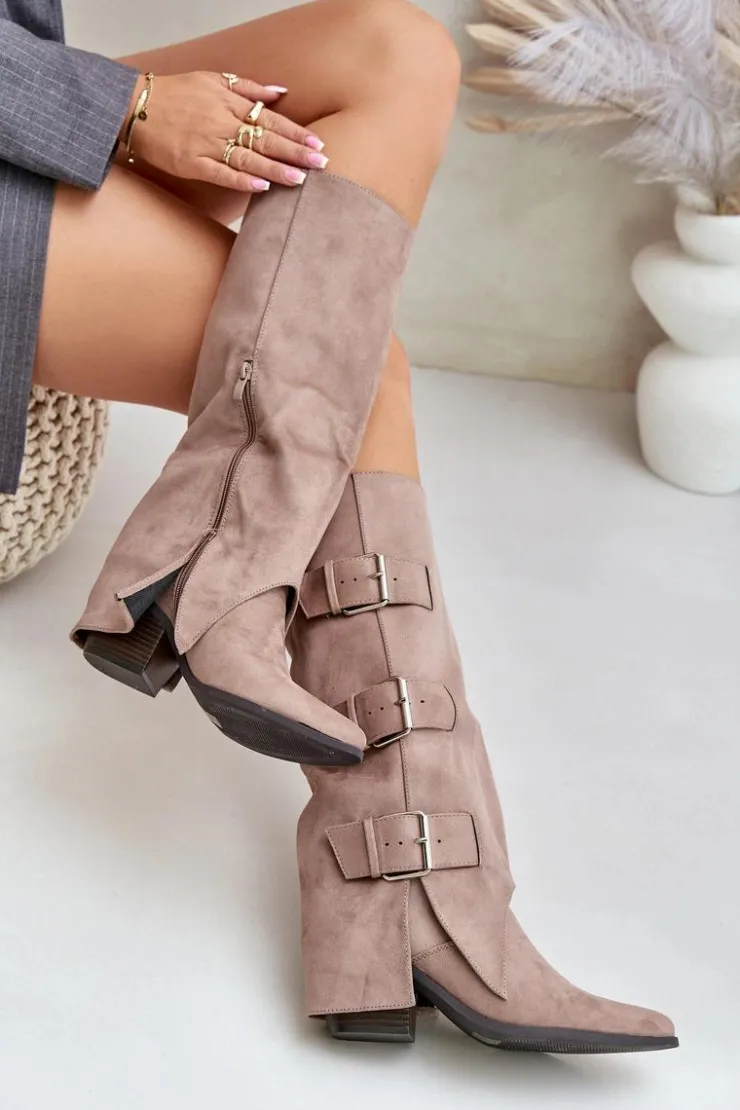 Stylowe kozaki damskie wykonane z eko zamszu. Osadzone na obcasie w formie słupka. Noski w szpic. Środek ocieplony kocem obuwniczym. Głównym atutem tego modelu jest wywinięta cholewka ozdobiona złotymi klamrami. Model wsuwany z dodatkowym suwakiem na dole. Idealnie sprawdzą się w stylizacjach z luźnymi marynarkami, spódnicami i sukienkami! Koniecznie powinnaś je mieć! Przy wyborze rozmiaru prosimy sugerować się tabelą rozmiarów.