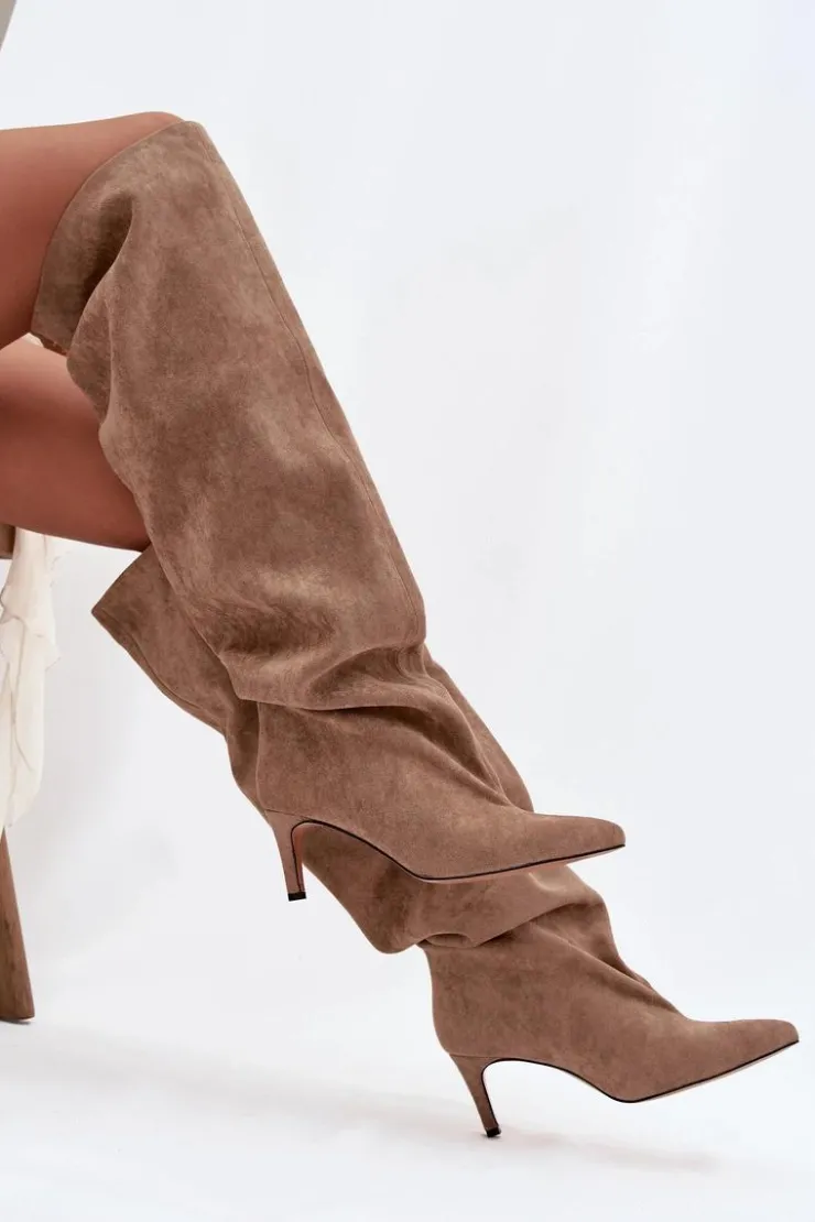Kozaki Mavilla to propozycja dla kobiet, które cenią sobie elegancję i klasykę w nowoczesnym wydaniu. Wykonane z miękkiego eko zamszu w ciepłym beżowym odcieniu, prezentują się niezwykle stylowo i kobieco. Wysoka cholewka sięgająca za kolano pięknie wydłuża nogi, a smukła linia buta subtelnie podkreśla sylwetkę. To model, który doskonale łączy modny wygląd z wygodą użytkowania.