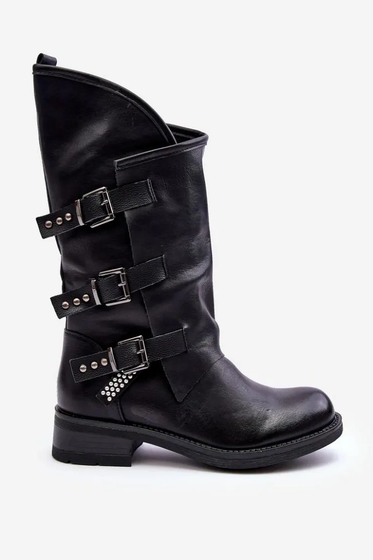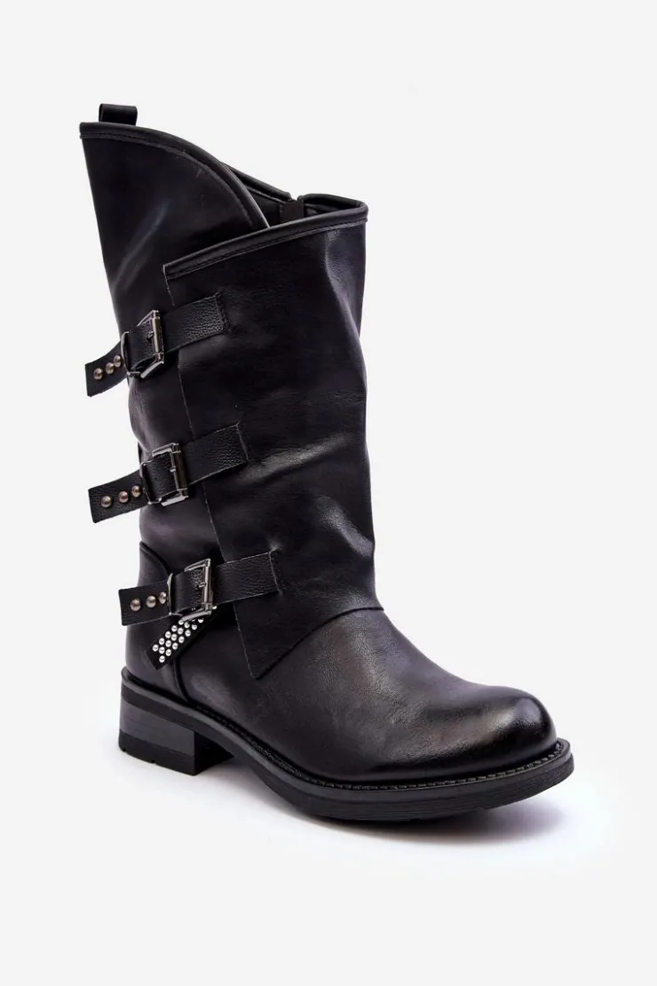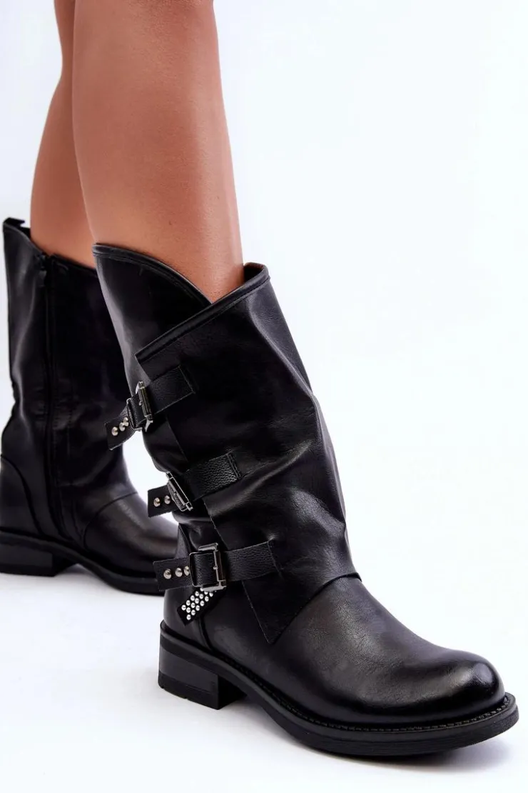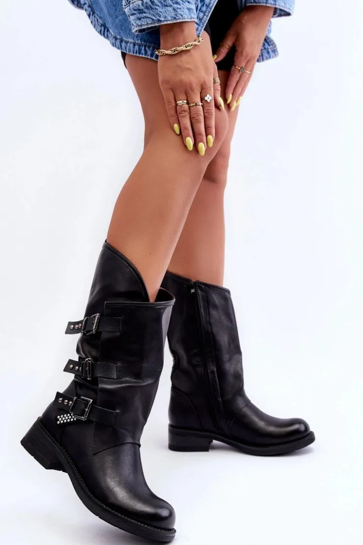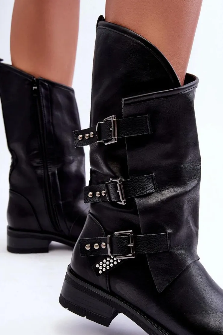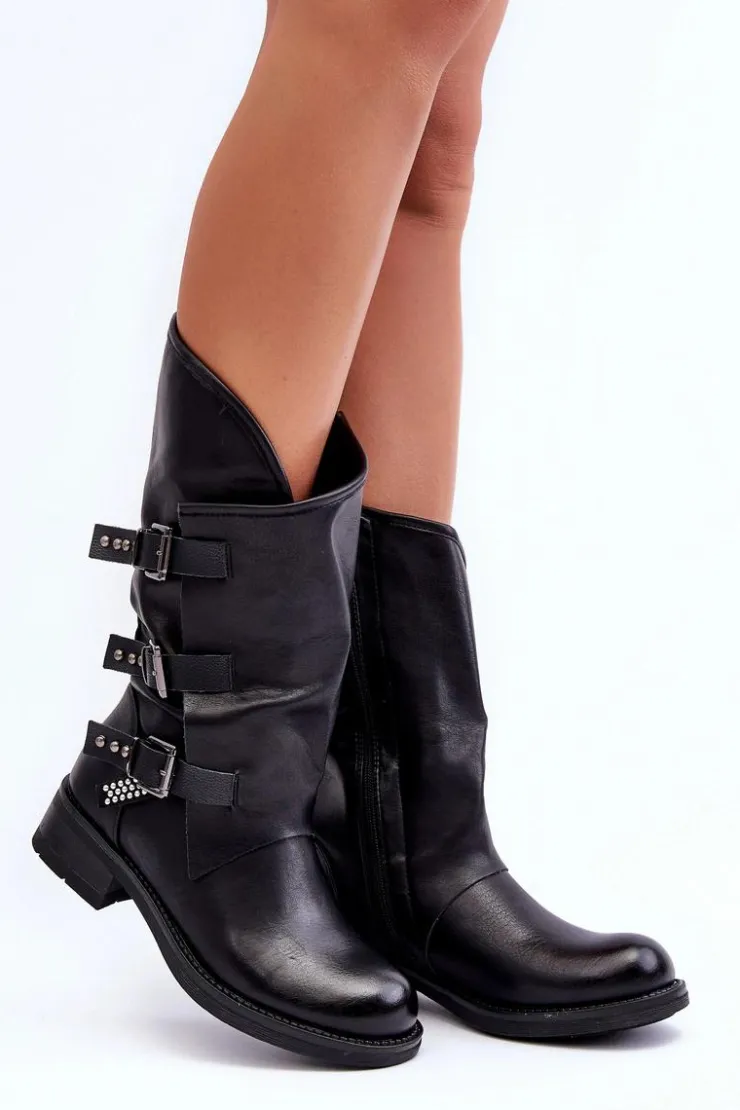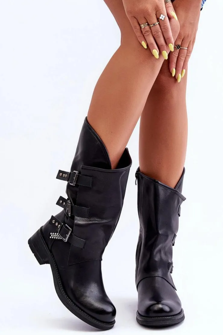 Klasyczne kozaki damskie wykonane z eko skóry. Osadzone na płaskim obcasie. Fason do połowy łydki zapinany na zamek. Miękka, materiałowa wkładka zapewni komfortowe użytkowanie. Na nieregularnej cholewce znajdują się ozdobne paski ze sprzączką. Przy wyborze rozmiaru prosimy kierować tabelą rozmiarów.