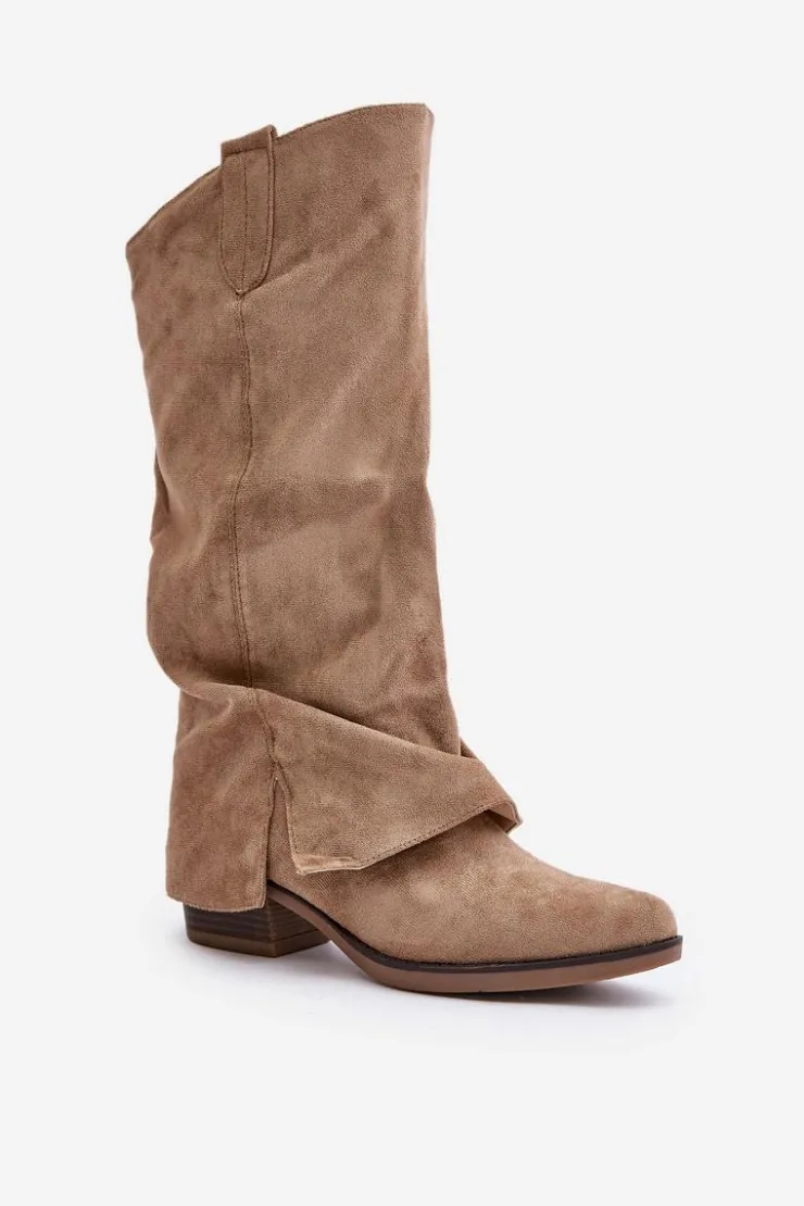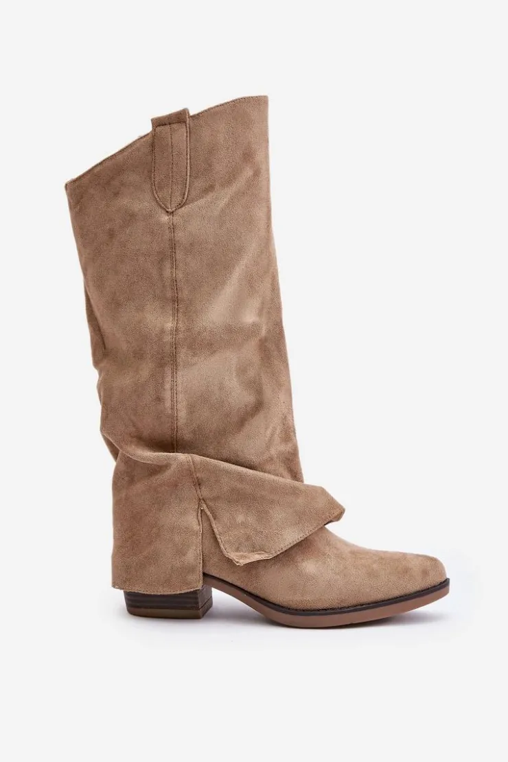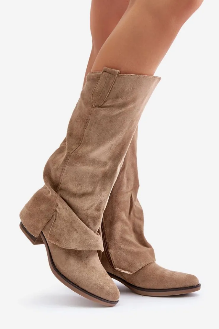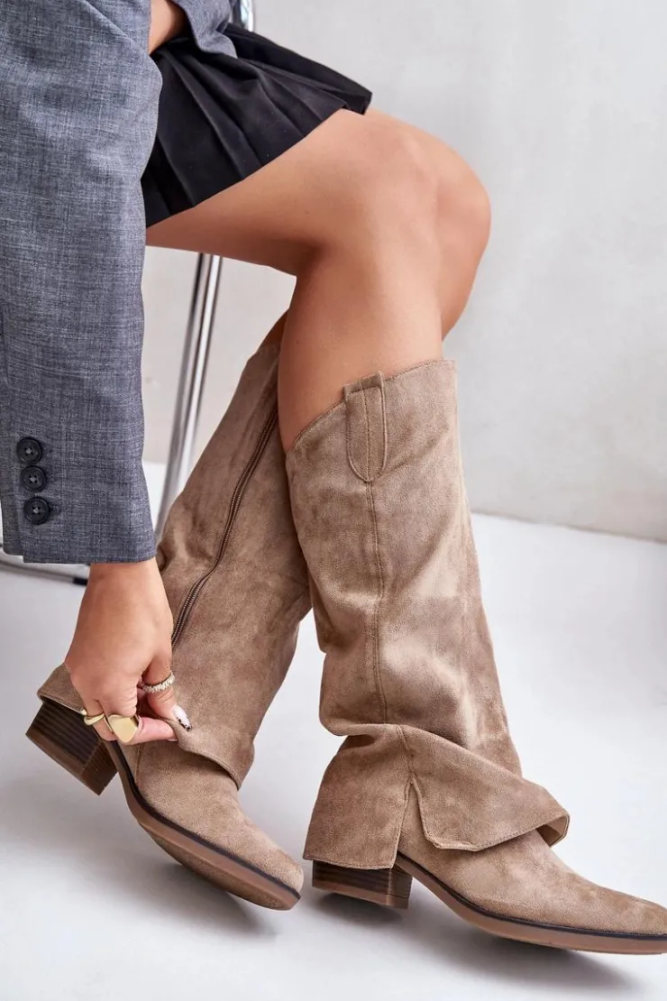 Modne kozaki damskie wykonane z eko zamszu. Osadzone na niskim, stabilnym obcasie. Noski w migdał. Środek ocieplany miłym w dotyku kocem obuwniczym. Głównym atutem tego modelu jest wywinięta cholewka, która lekko zachodzi na obcas. Zapinane na suwak. Idealne do sukienek czy spódnic! Przy wyborze rozmiaru prosimy sugerować się tabelą rozmiarów.