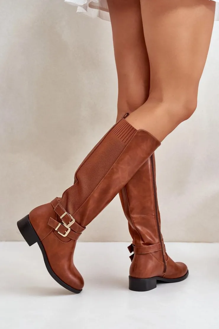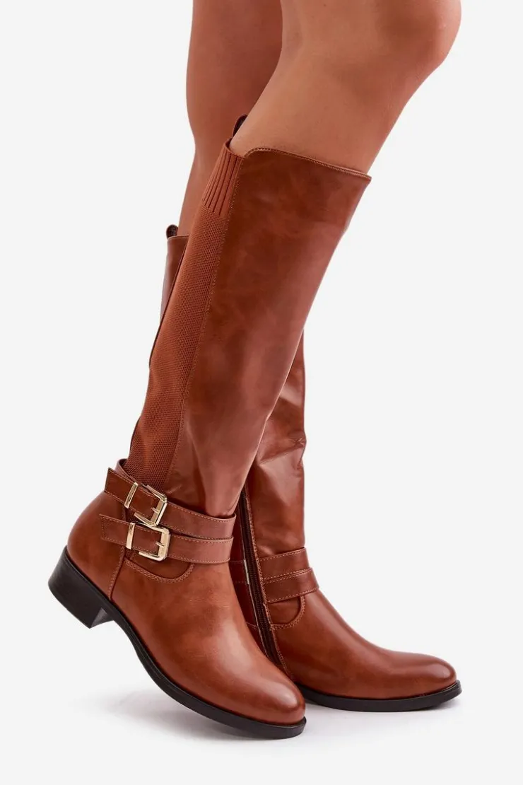 Damskie kozaki o klasycznym kroju, wykonane z eko skóry. Osadzone na płaskim obcasie, co zapewnia wygodę noszenia na co dzień. Noski zaokrąglone, a cholewka sięga przed kolano, dodając elegancji i wydłużając sylwetkę. Zapinane na zamek, ułatwiający zakładanie. Dodatkowym atutem są ozdobne paski ze złotymi klamrami, które nadają wyjątkowego charakteru. Przy wyborze rozmiaru prosimy sugerować się tabelą rozmiarów.