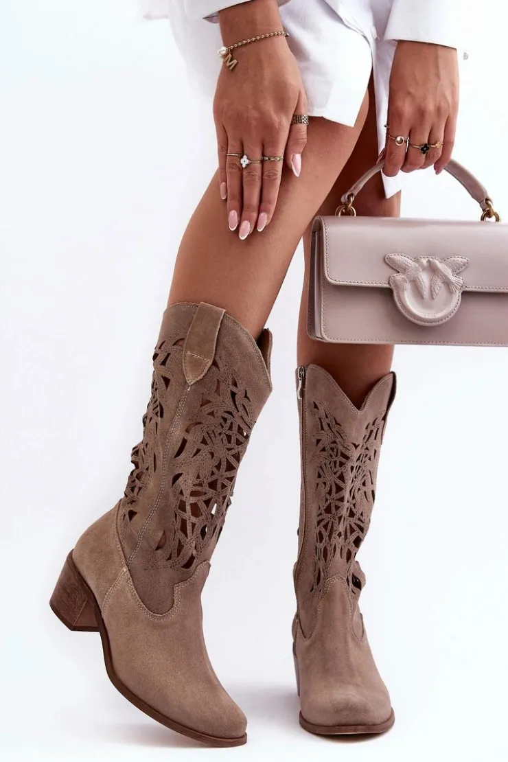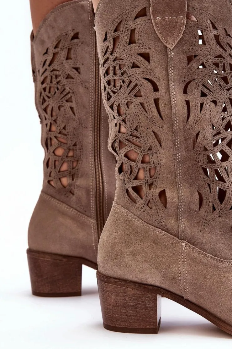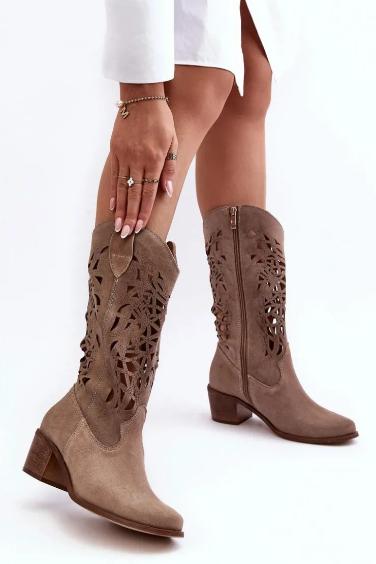 Kozaki damskie z ażurową cholewką. Wykonane ze skóry naturalnej zamszowej. Osadzone na niskim obcasie Noski w migdał. Zapinane na suwak z boku. Usztywniony zapiętek. Model ten idealnie sprawdzi się w jesiennych stylizacjach. Musisz je mieć! Koniecznie sprawdź całą naszą kolekcję butów marki Lewski. Przy wyborze rozmiaru prosimy sugerować się tabelą rozmiarów.