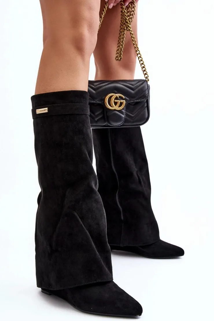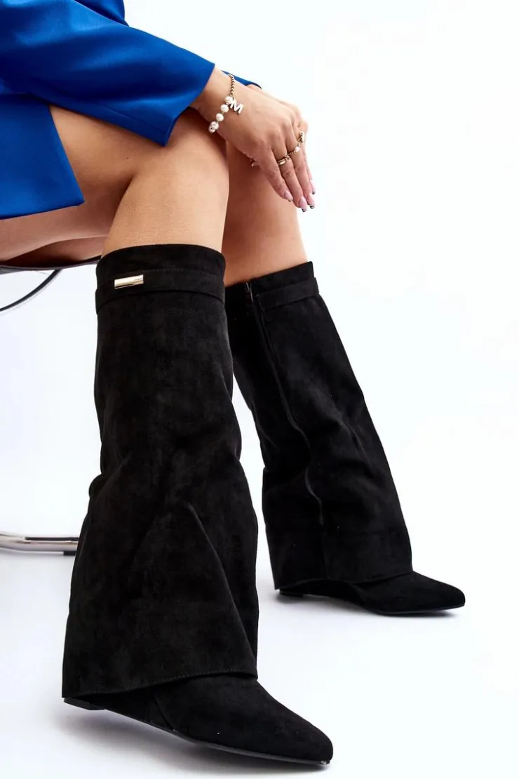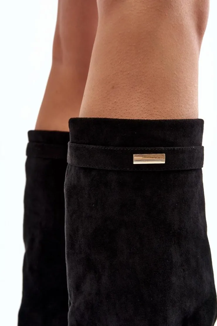 Modne kozaki wykonane z eko zamszu. Model ten posiada cholewkę zachodzącą na koturn, co wyróżnia to obuwie na tle innych kozaków. Noski w szpic optycznie wysmuklą nogi. Zapiętek jest usztywniony. Przy wyborze rozmiaru prosimy sugerować się tabelą rozmiarów.